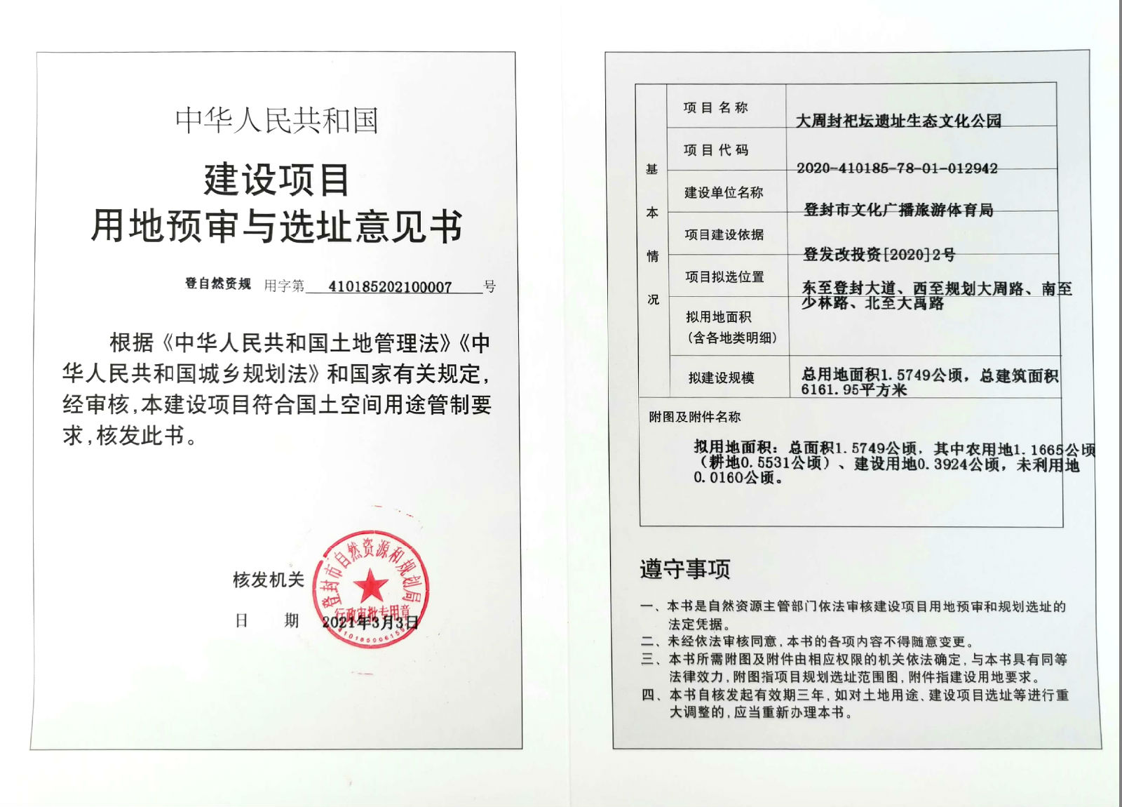 登封市自然资源和规划局关于大周封祀坛遗址生态文化公园项目用地预审与选址意见书批后公告