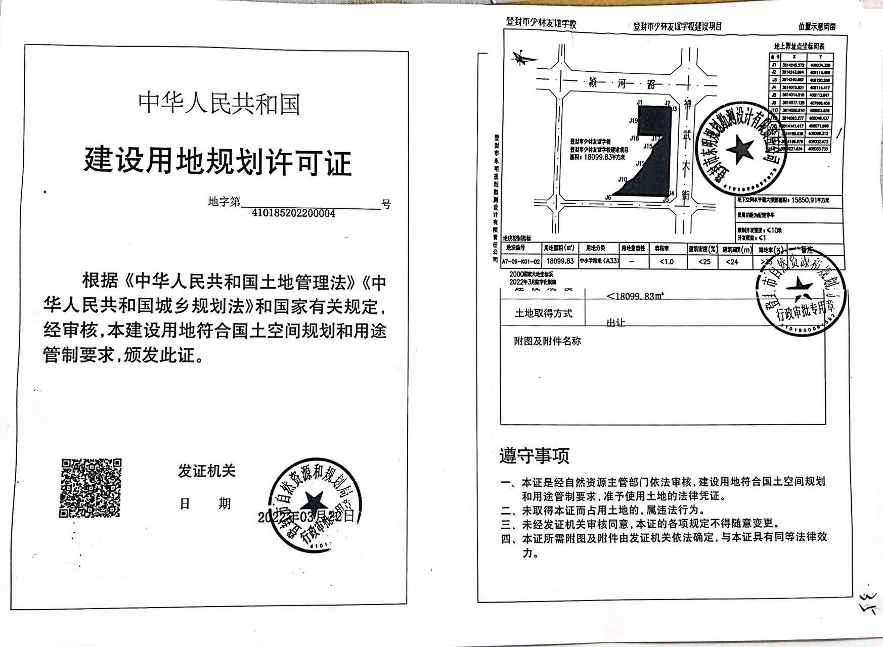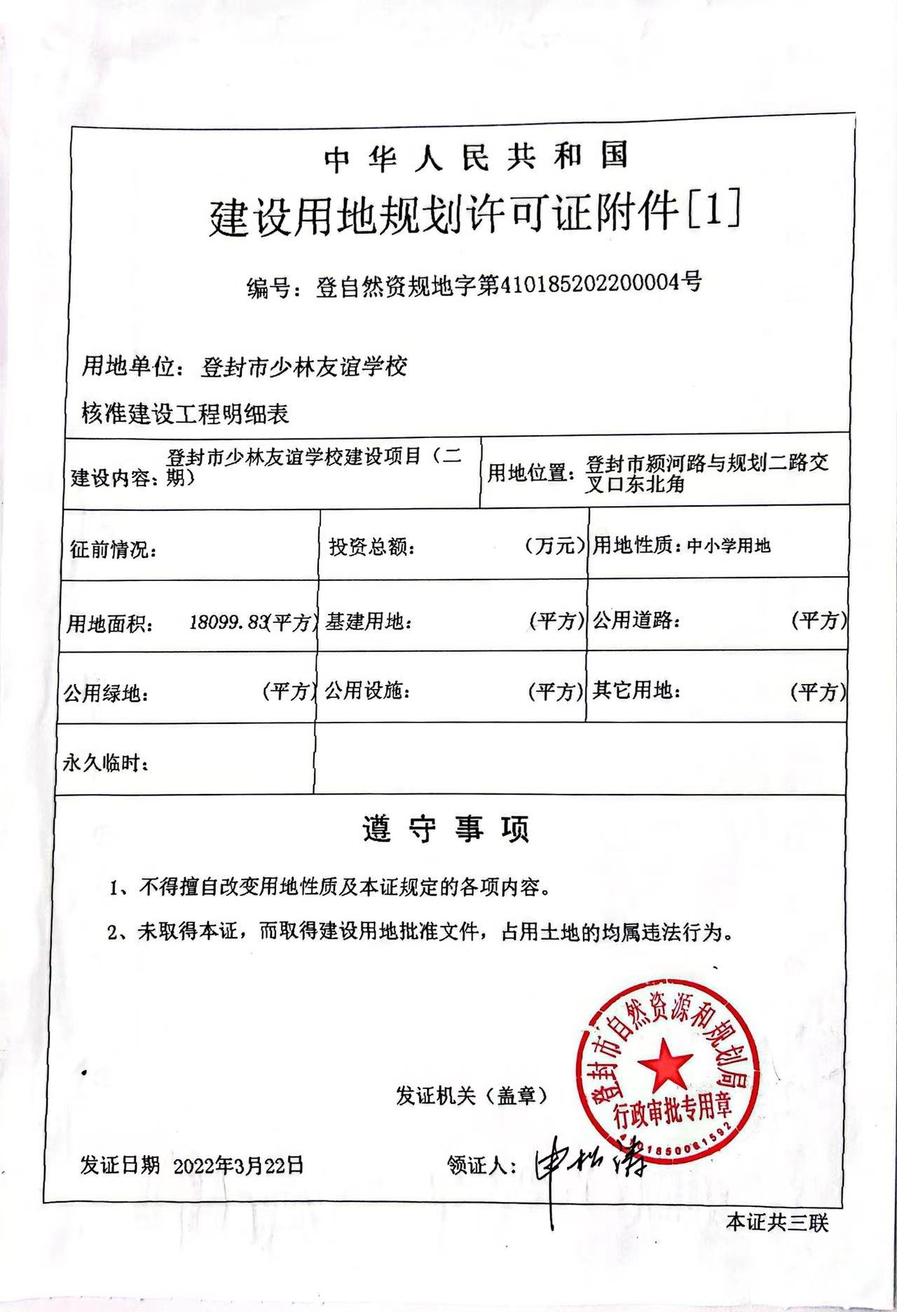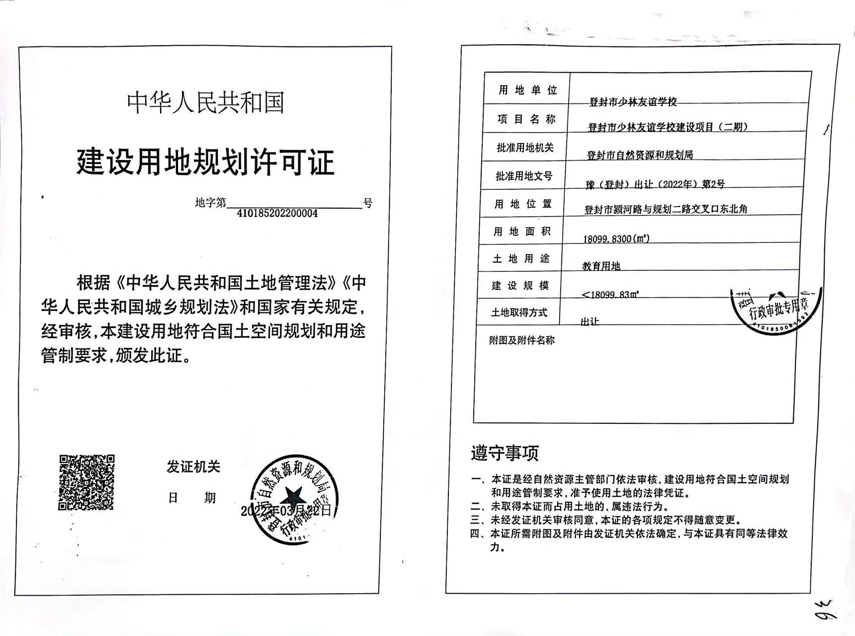 登封市自然资源和规划局关于登封市少林友谊学校建设项目(二期)建设用地规划许可证证后公告
