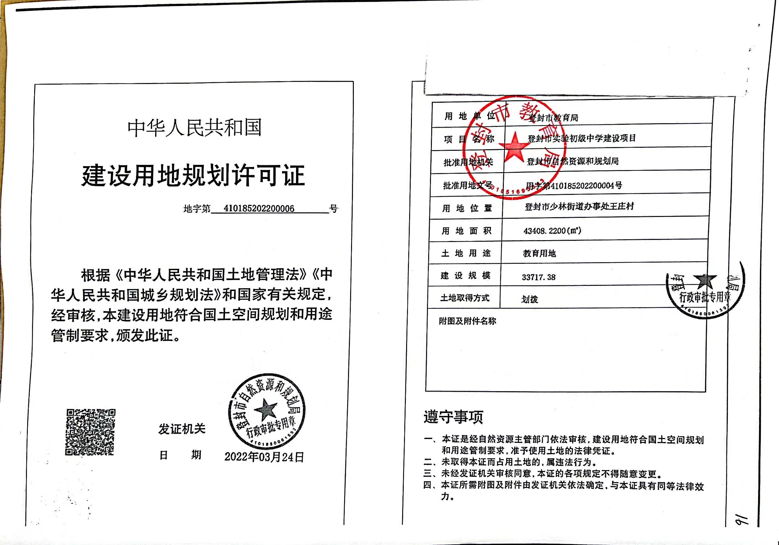 登封市自然资源和规划局关于登封市实验初级中学建设项目建设用地规划许可证证后公告