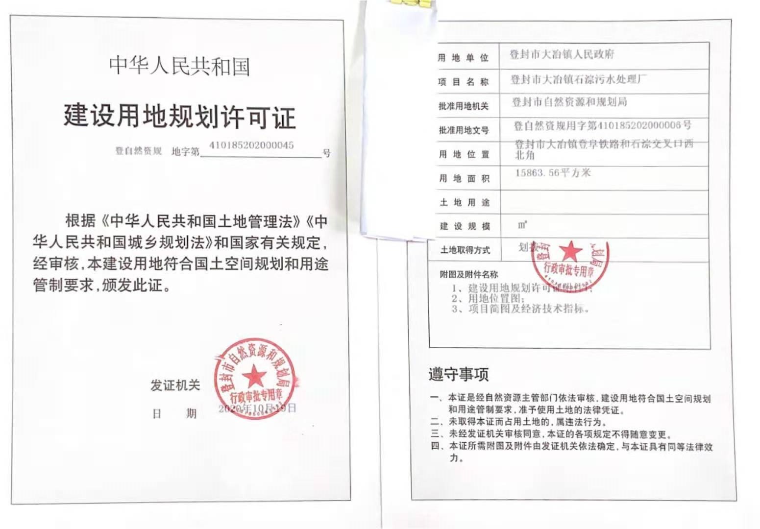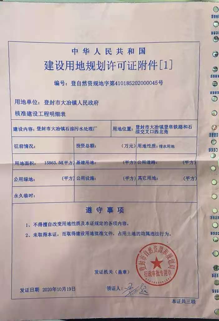 登封市自然资源和规划局关于登封市大冶镇人民政府登封市大冶镇石淙污水处理厂项目建设用地规划许可证批后公告