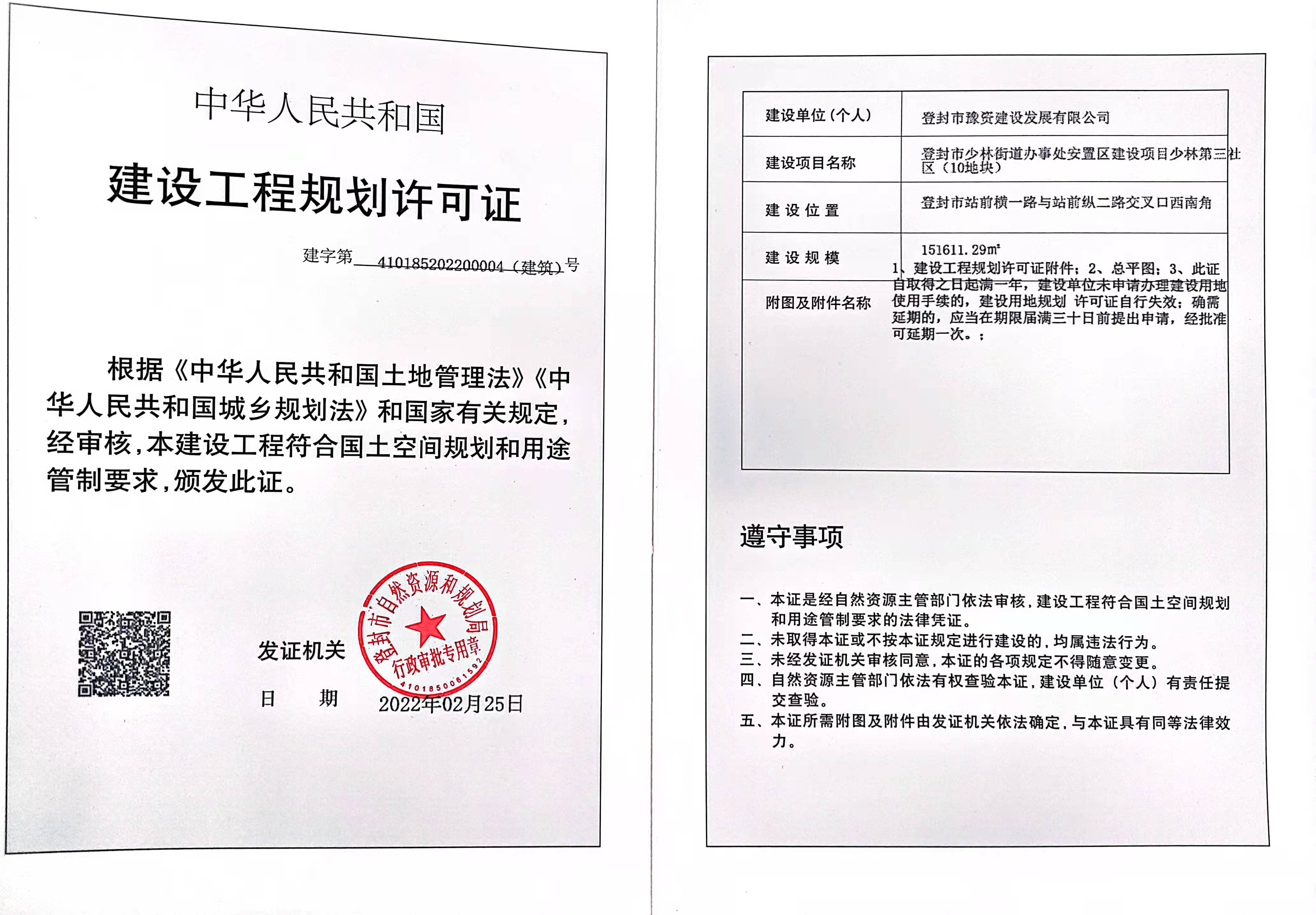 登封市自然资源和规划局关于登封市少林街道办事处安置区建设项目少林第三社区(10地块)项目建设工程规划许可证证后公告