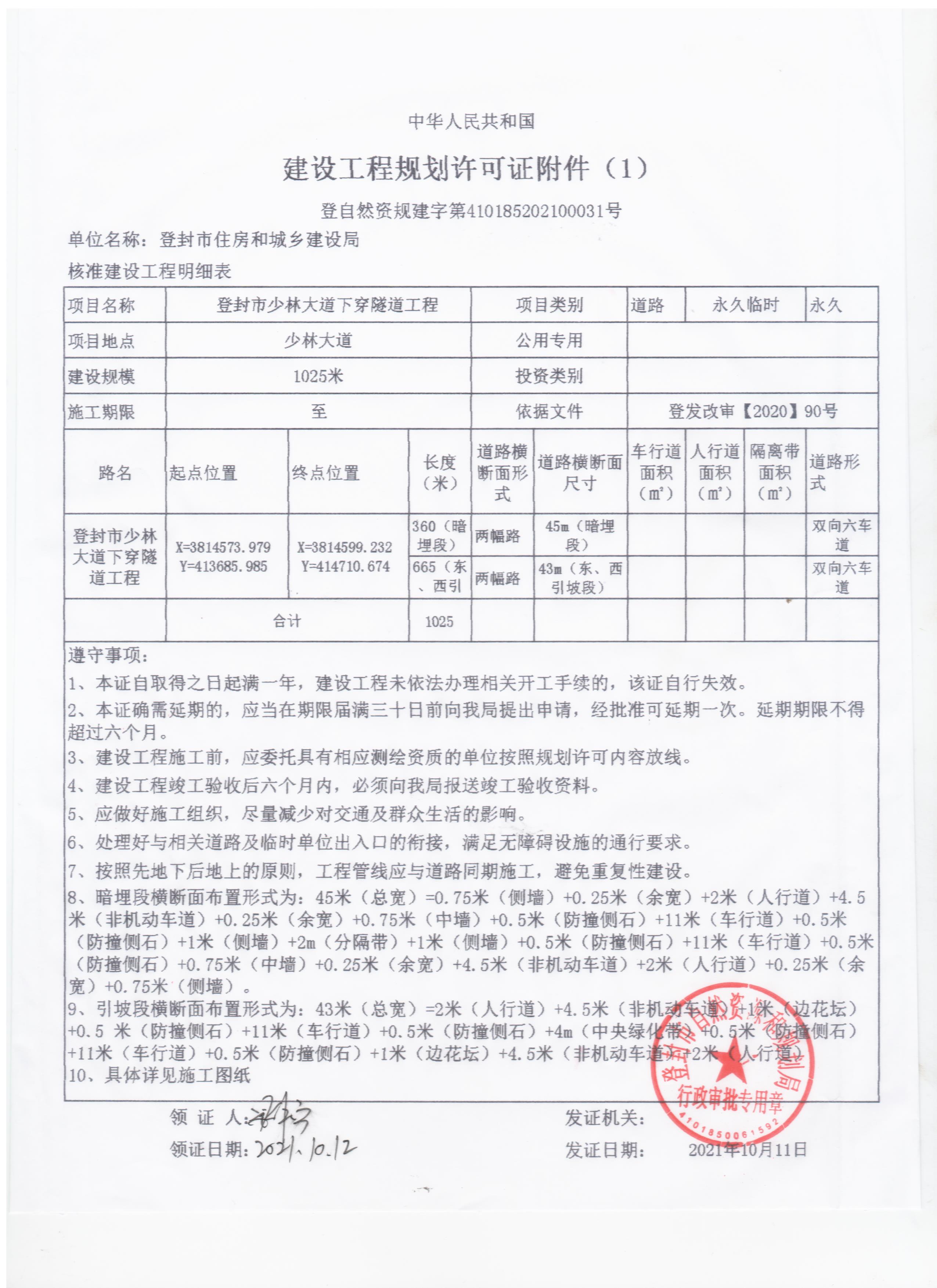 登封市自然资源和规划局关于登封市少林大道下穿隧道建设工程规划许可证证后公告