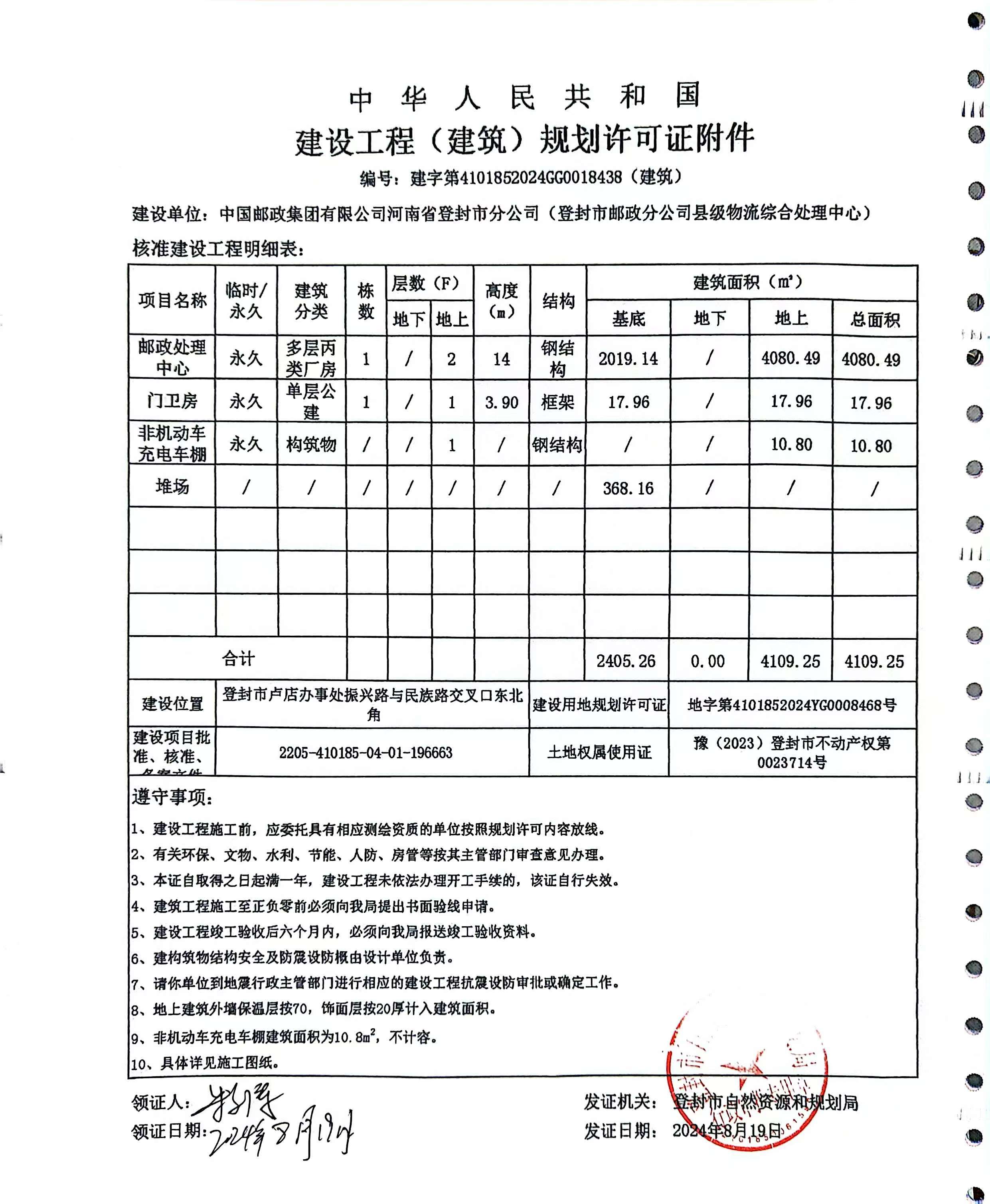 登封市自然资源和规划局关于登封市邮政分公司物流综合处理中心建设工程规划许可证证后公告