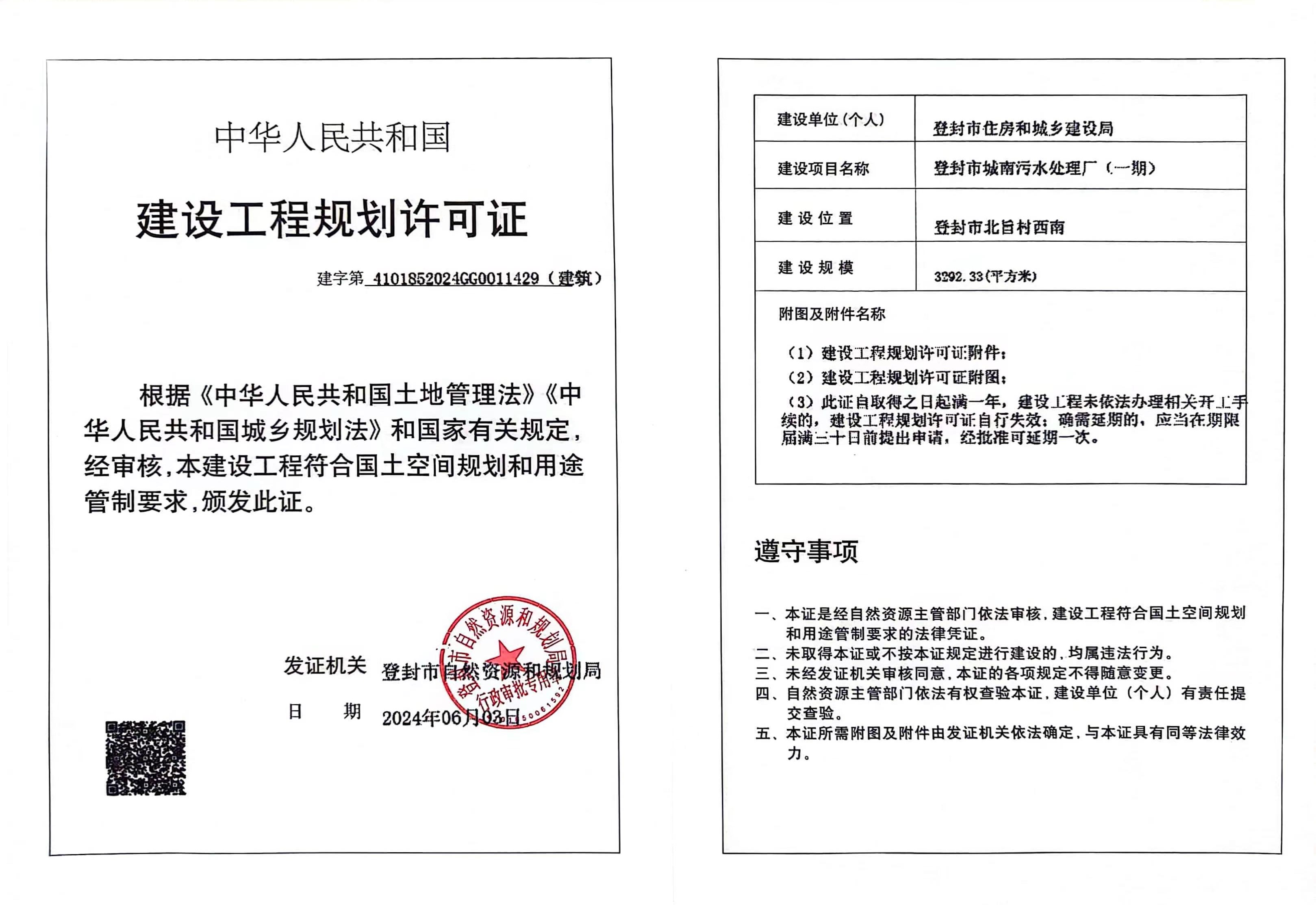 登封市自然资源和规划局关于登封市城南污水处理厂(一期)建设工程规划许可证证后公告