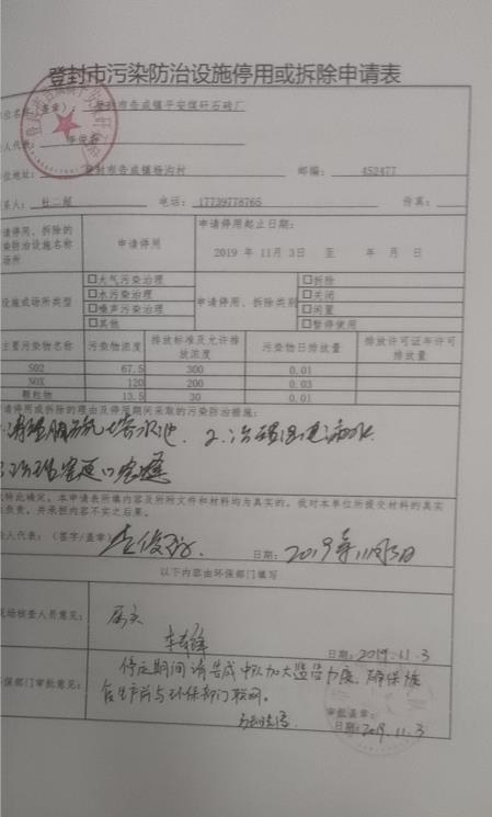 登封市污染防治设施停用或拆除申请表(登封市告成镇平安煤矸石砖厂)