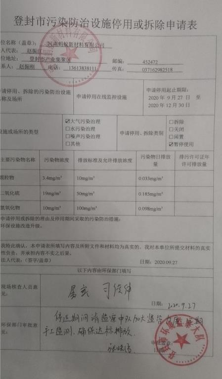登封市污染防治设施停用或拆除申请表(河南蚂蚁新材料有限公司)