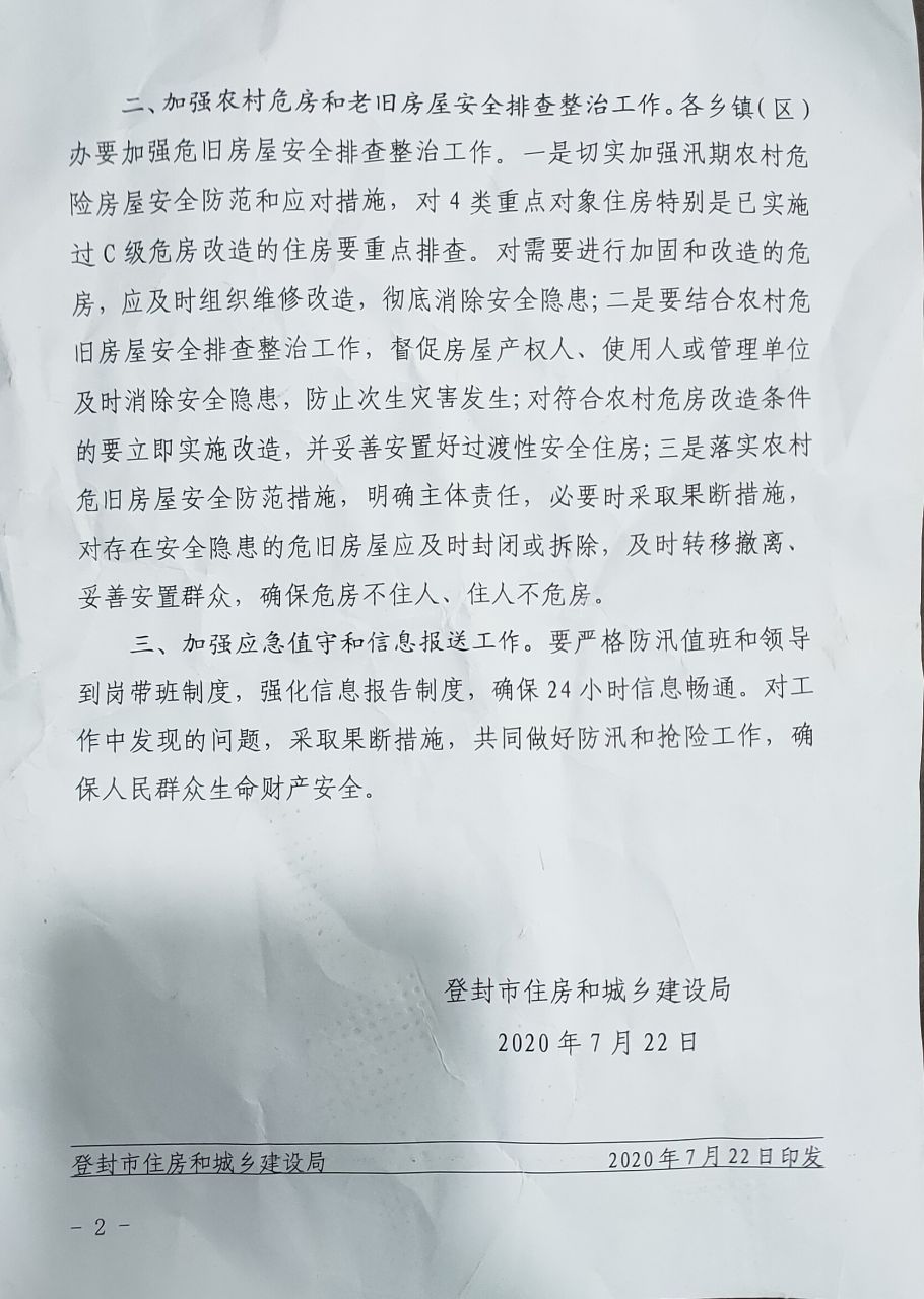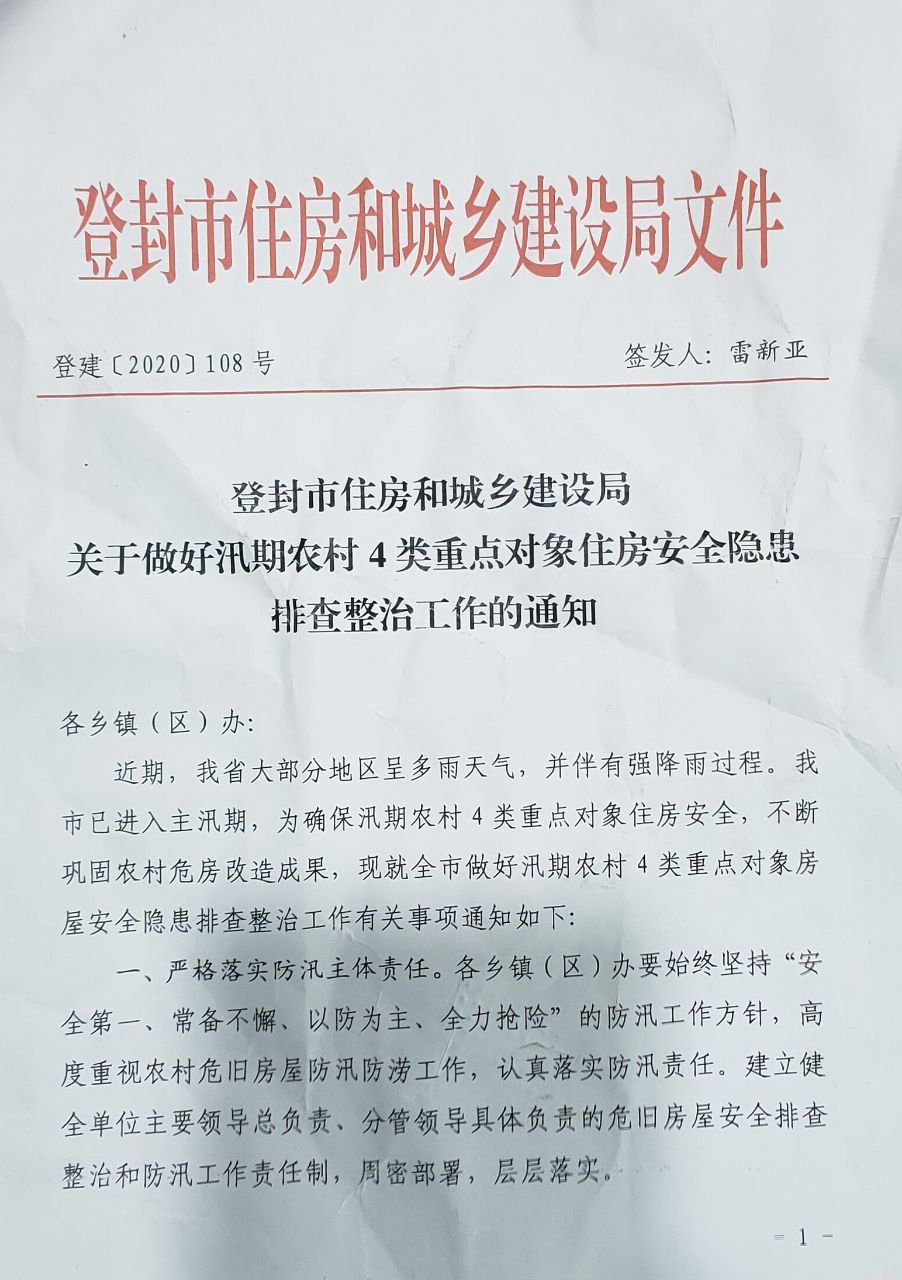 登封市住房和城乡建设局关于做好汛期农村4类重点对象住房安全隐患排查整治工作的通知