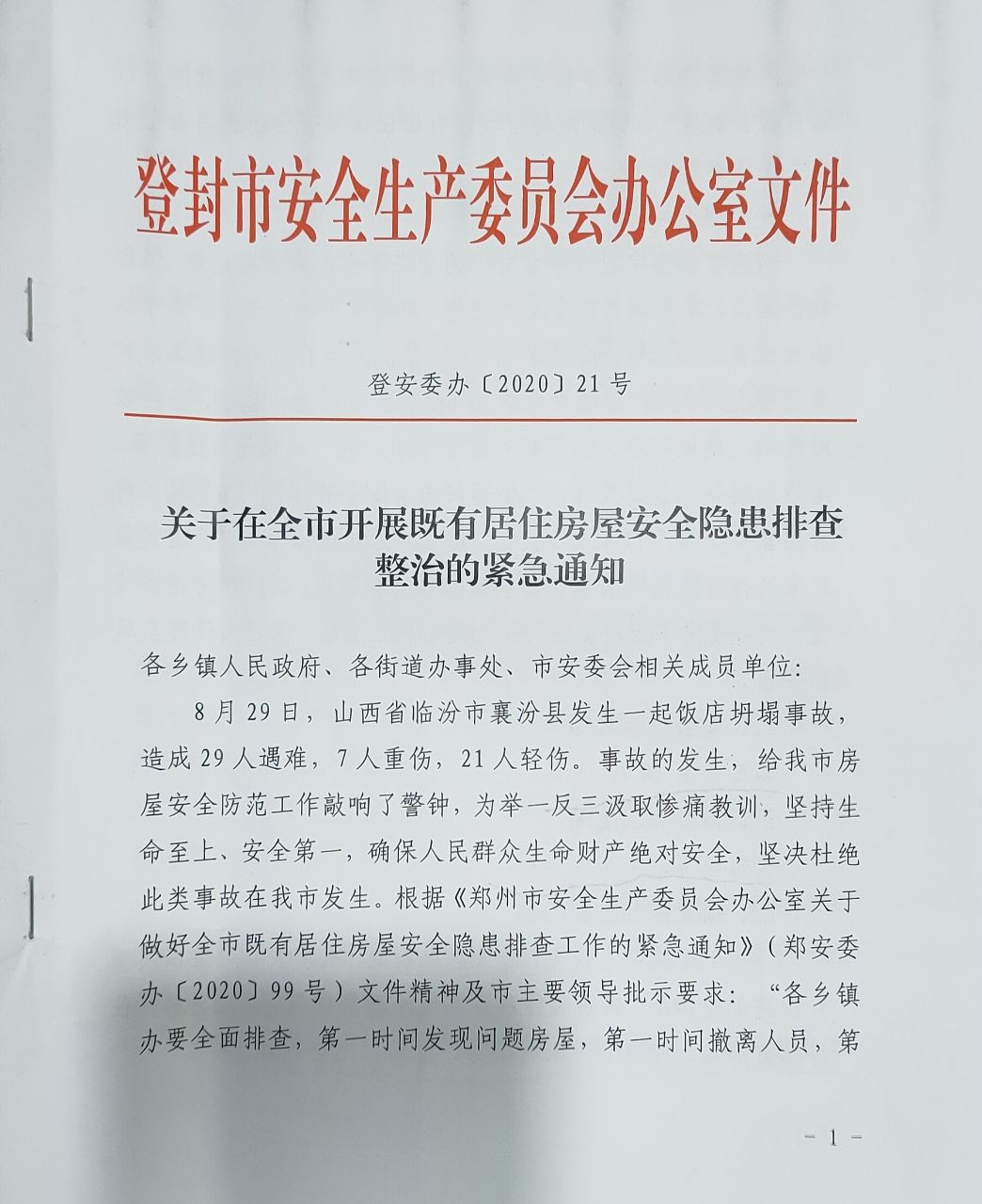 登封市安全生产委员会办公室文件《关于在全市开展既有居住房屋安全隐患排查整治的紧急通知》