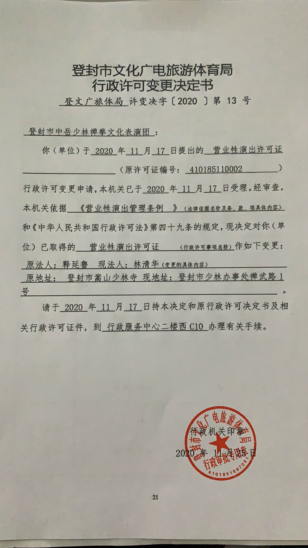 登封市中岳少林禅拳文化表演团《行政许可变更决定书》