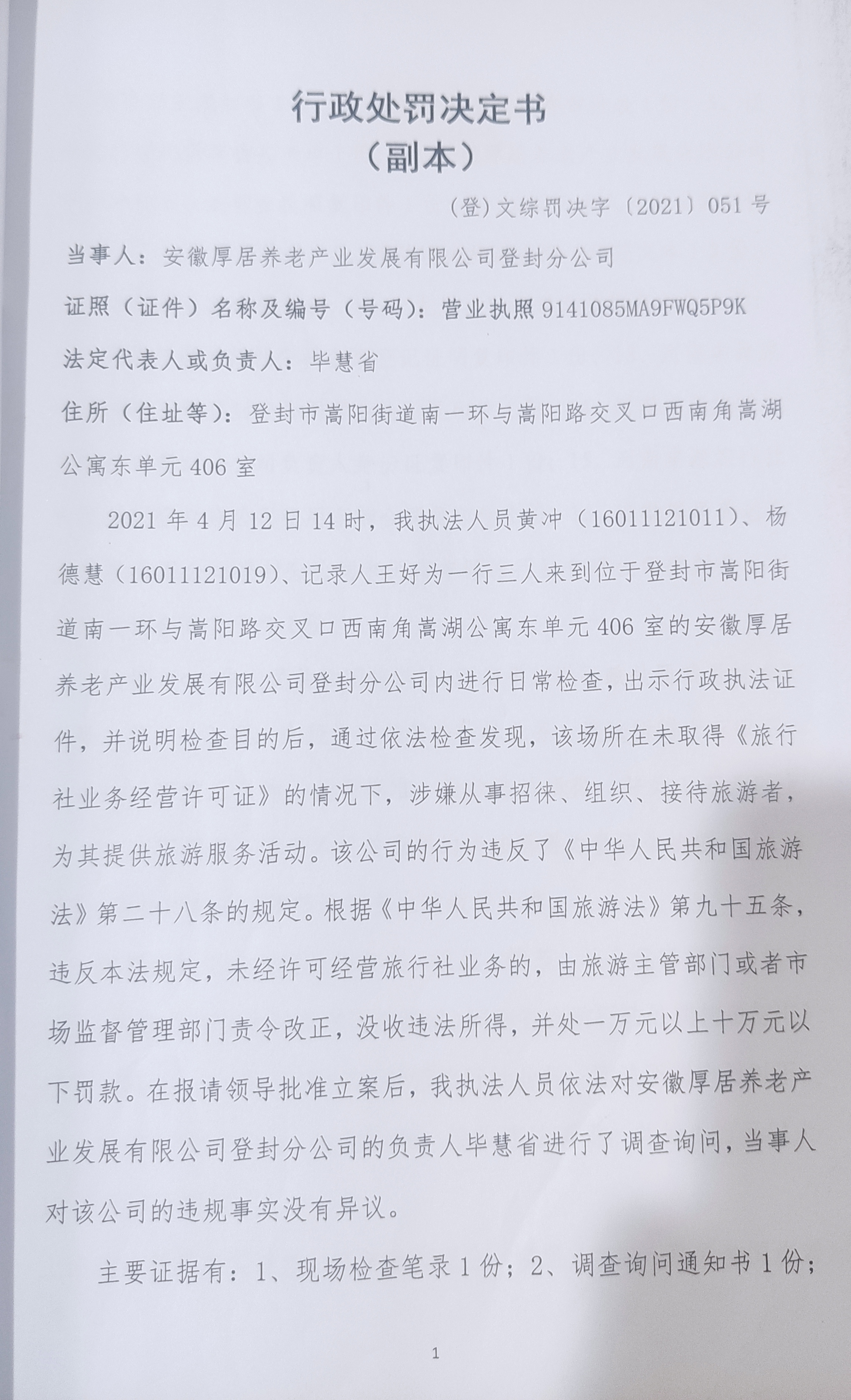 安徽厚居养老产业发展有限公司登封分公司行政处罚决定书