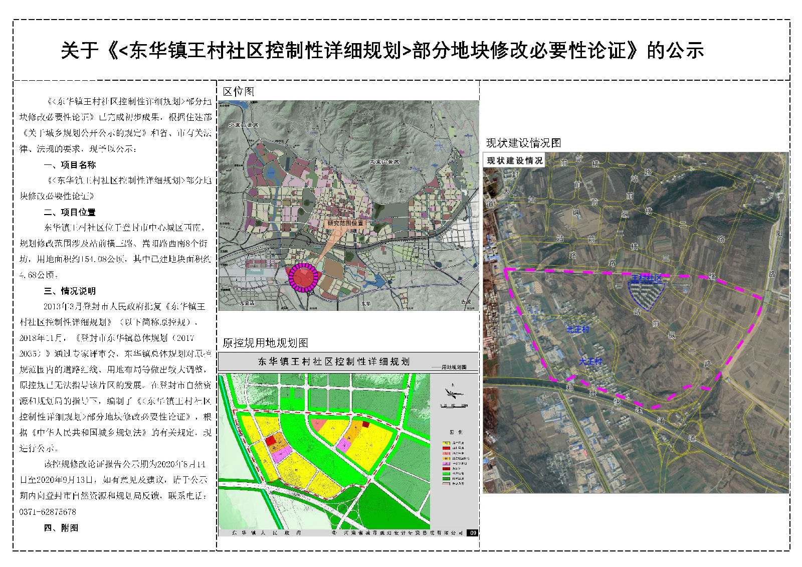 2013年3月登封市人民政府批复《东华镇王村社区控制性详细规划》(以下简称原控规),2018年11月,《登封市东华镇总体规划(2017-2035)》通过专家评审会,东华镇总体规划对原控规范围内的道路红线、用地布局等做出较大调整,原控规已无法指导该片区的发展。在登封市自然资源和规划局的指导下,编制了《<东华镇王村社区控制性详细规划>部分地块修改必要性论证》,根据《中华人民共和国城乡规划法》的有关规定,现进行公示。