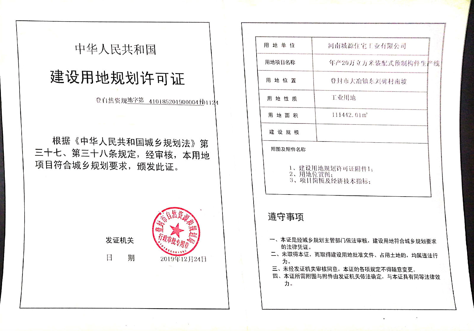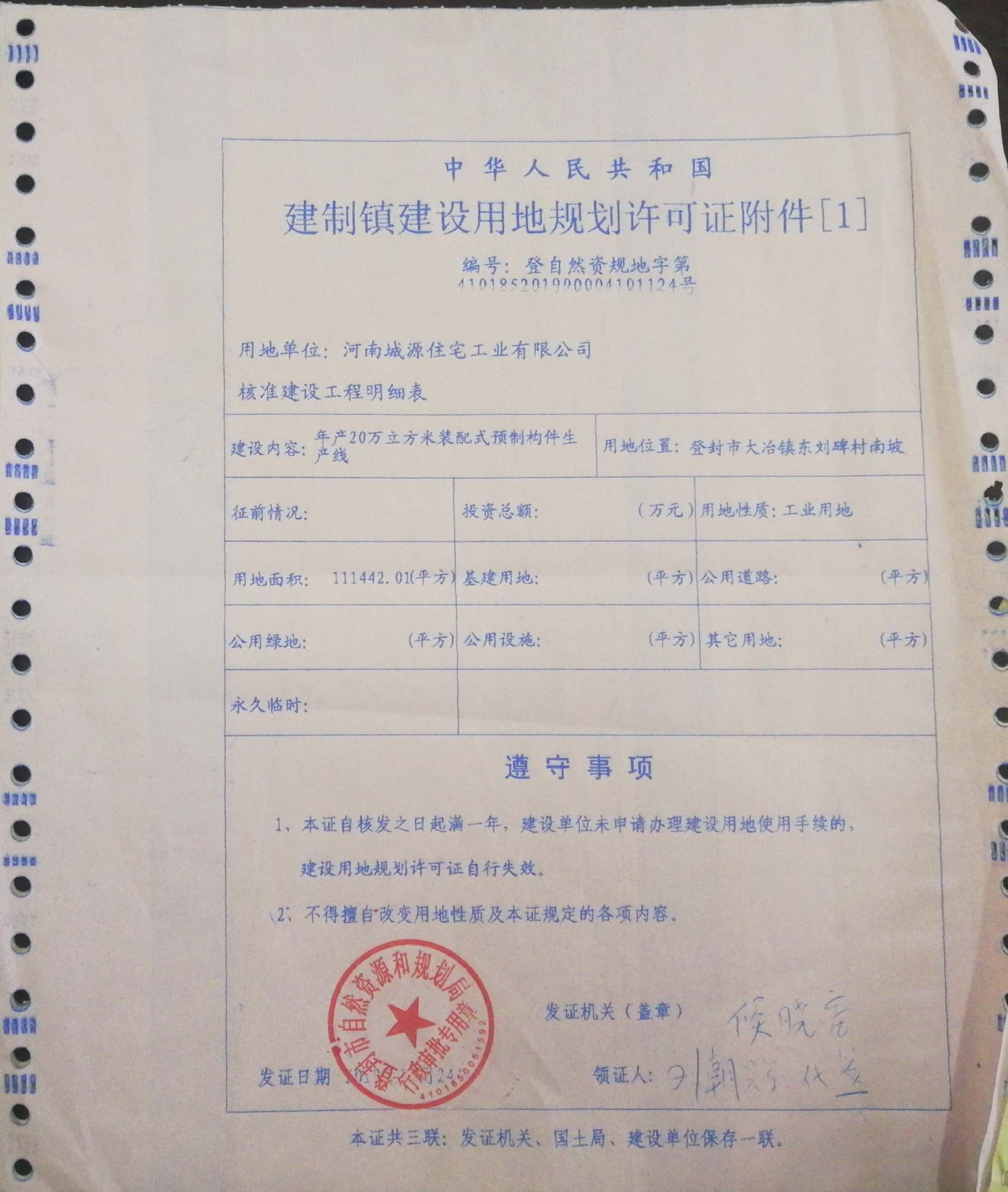 年产20万立方米装配式预制构件生产线项目建设用地规划许可证批后公告