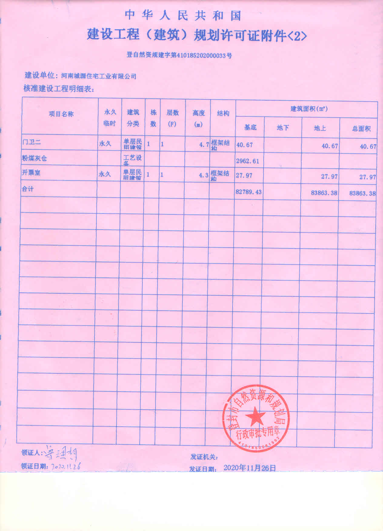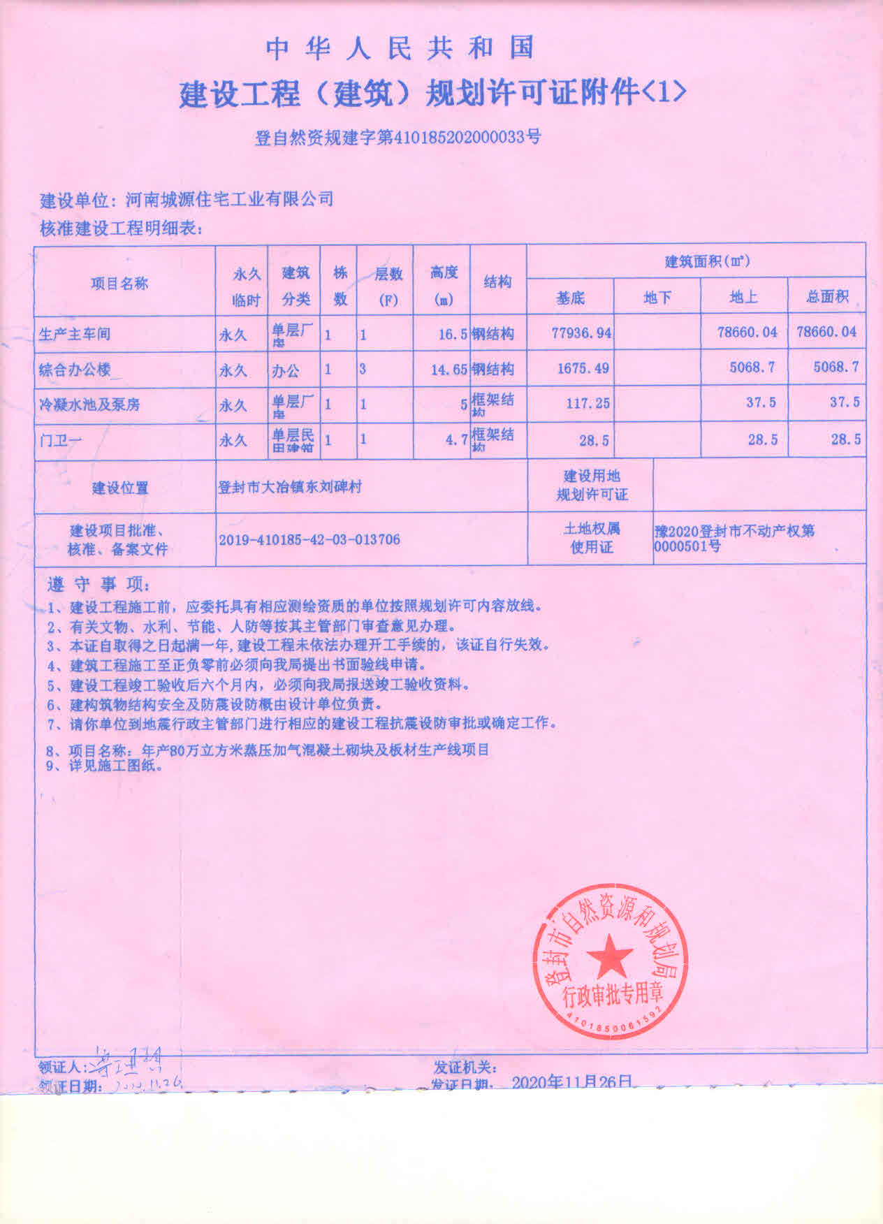 关于河南城源住宅工业有限公司年产80万立方米蒸压加气混凝土砌块及板材生产线项目建设工程规划许可证证后公告