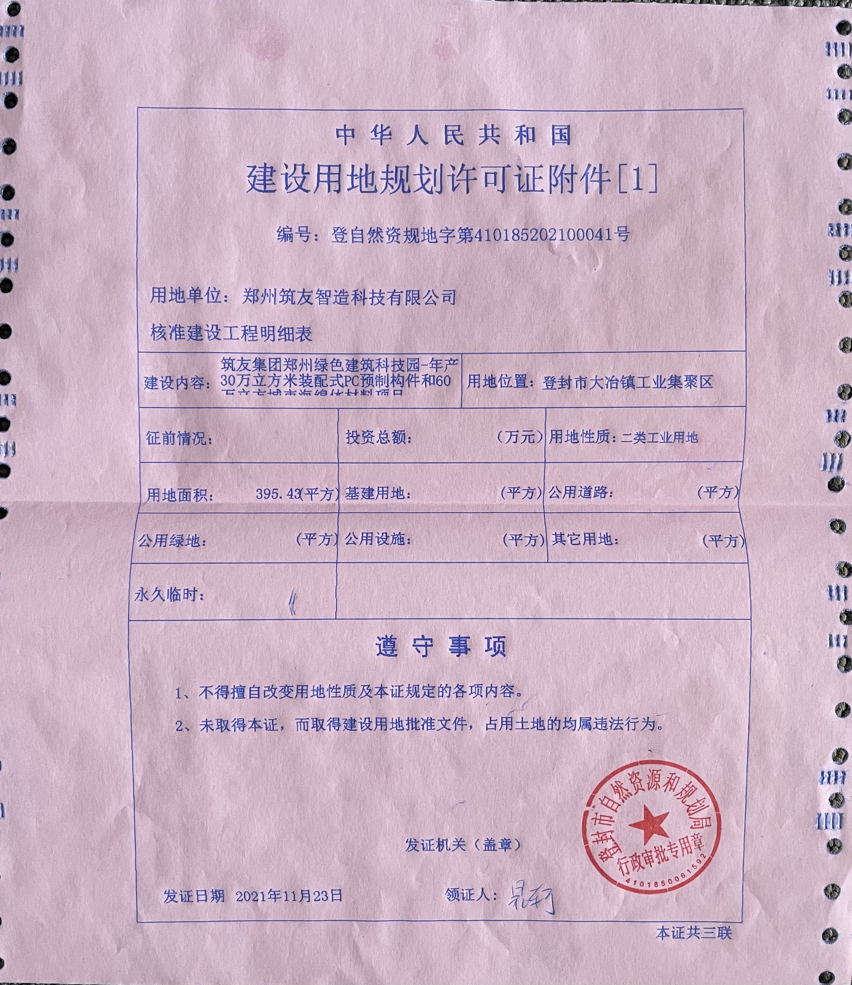 关于筑友集团郑州绿色建筑科技园-年产30万立方米装配式PC预制构件和60万立方城市海绵体材料项目建设用地规划许可证证后公告