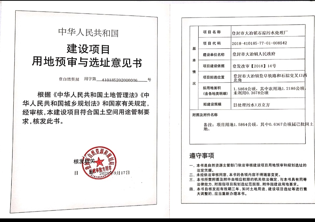 登封市自然资源和规划局关于登封市大冶镇石淙污水处理厂建设项目用地预审与选址意见书批后公告