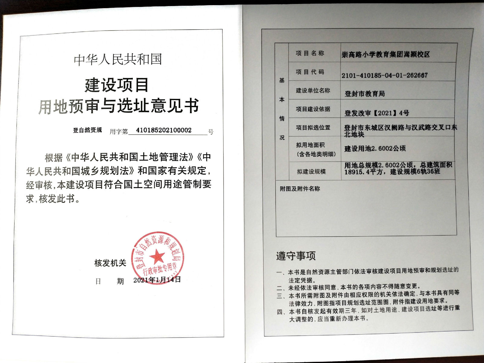 登封市自然资源和规划局关于崇高路小学教育集团嵩颍校区建设项目用地预审与选址意见书批后公告