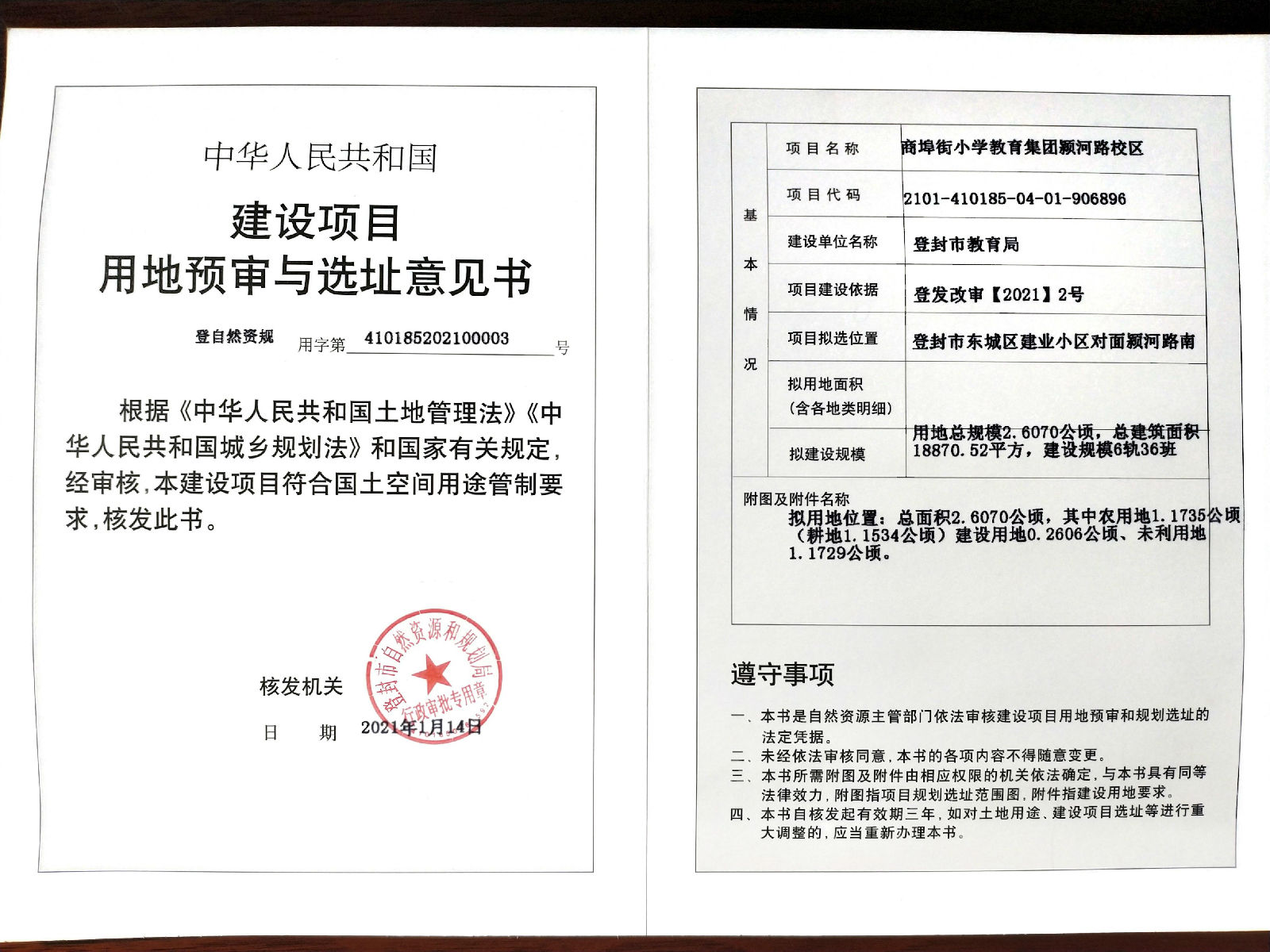 登封市自然资源和规划局关于商埠街小学教育集团颍河路校区建设项目用地预审与选址意见书批后公告