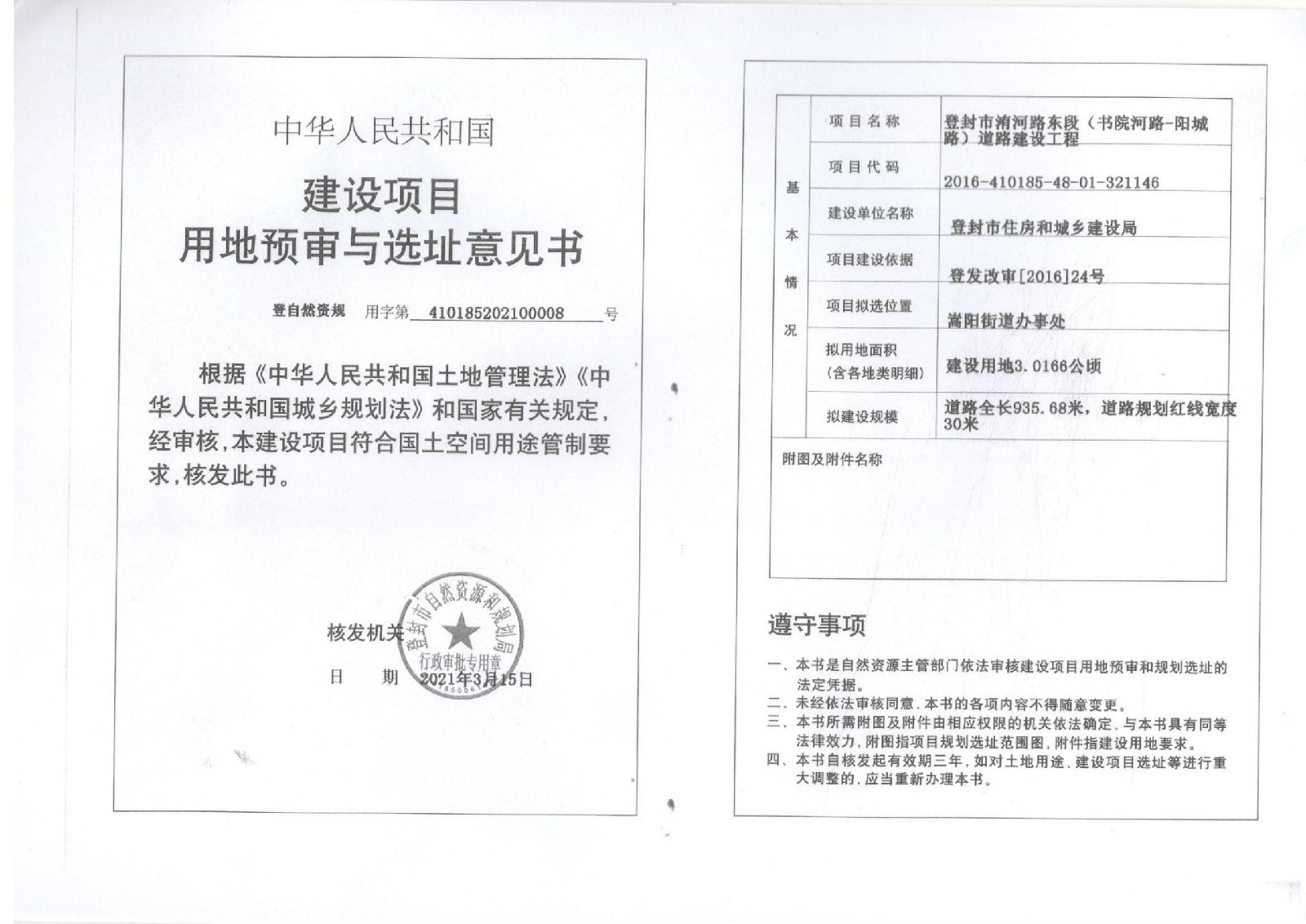 登封市自然资源和规划局关于登封市洧河路东段(书院河路-阳城路)道路建设工程用地预审与选址意见书批后公告