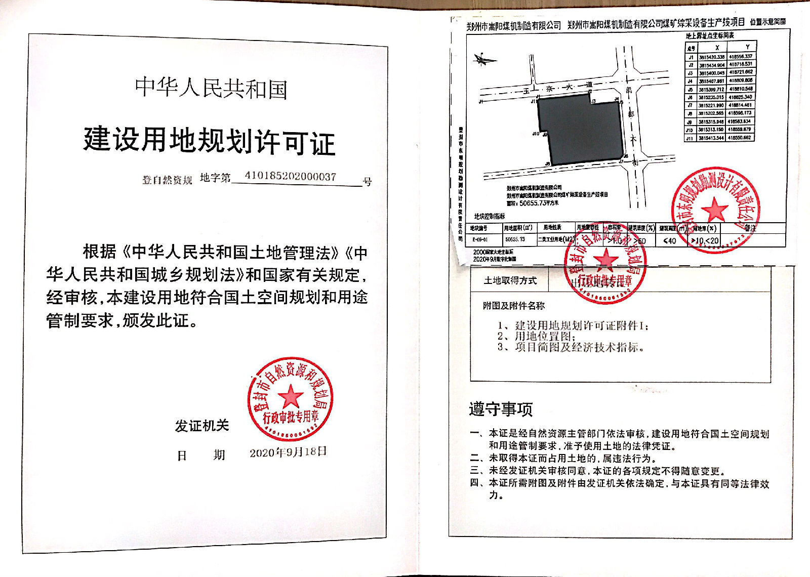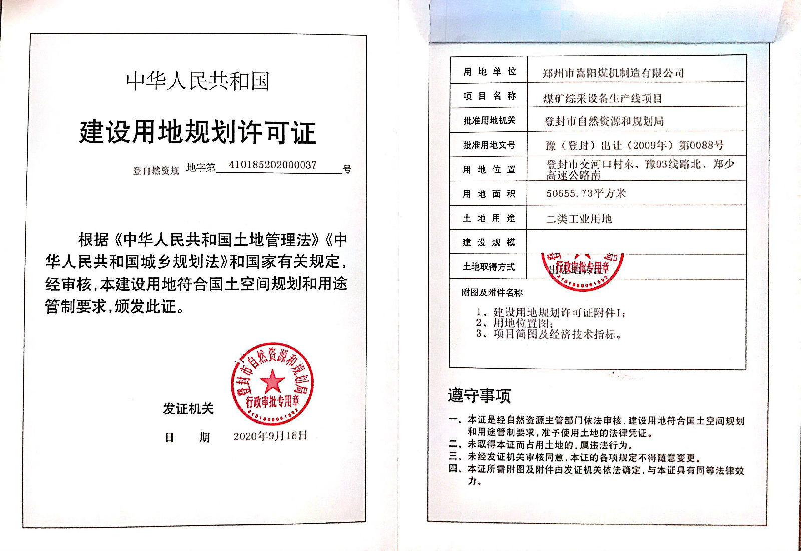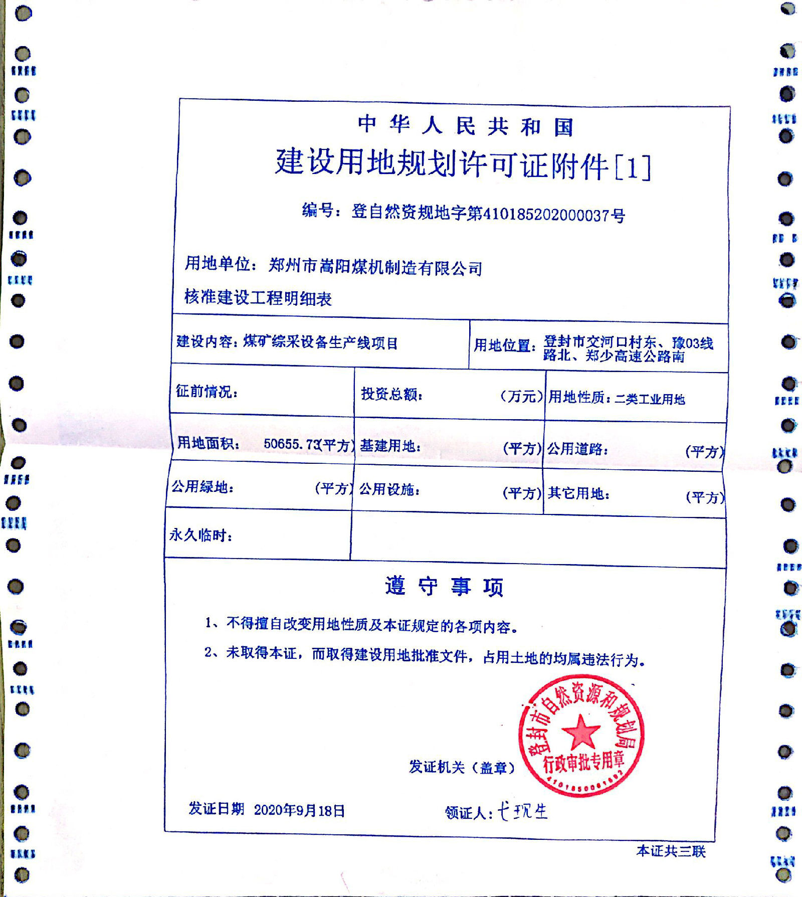 登封市自然资源和规划局关于郑州市嵩阳煤机制造有限公司煤矿综采设备生产线项目建设用地规划许可证批后公告