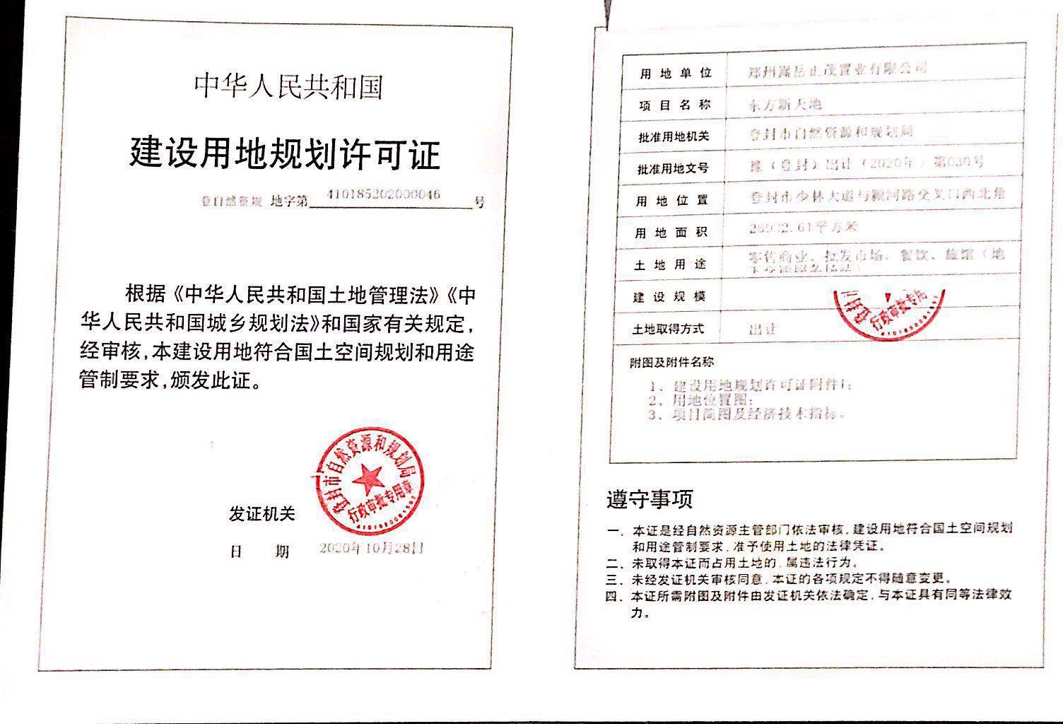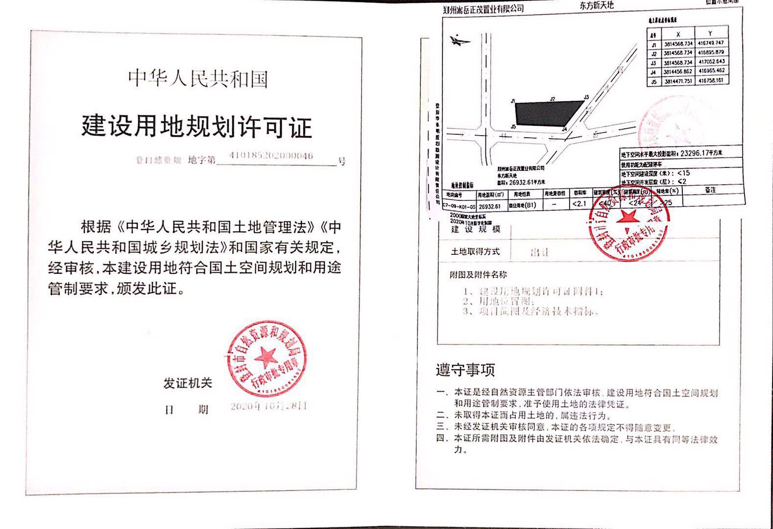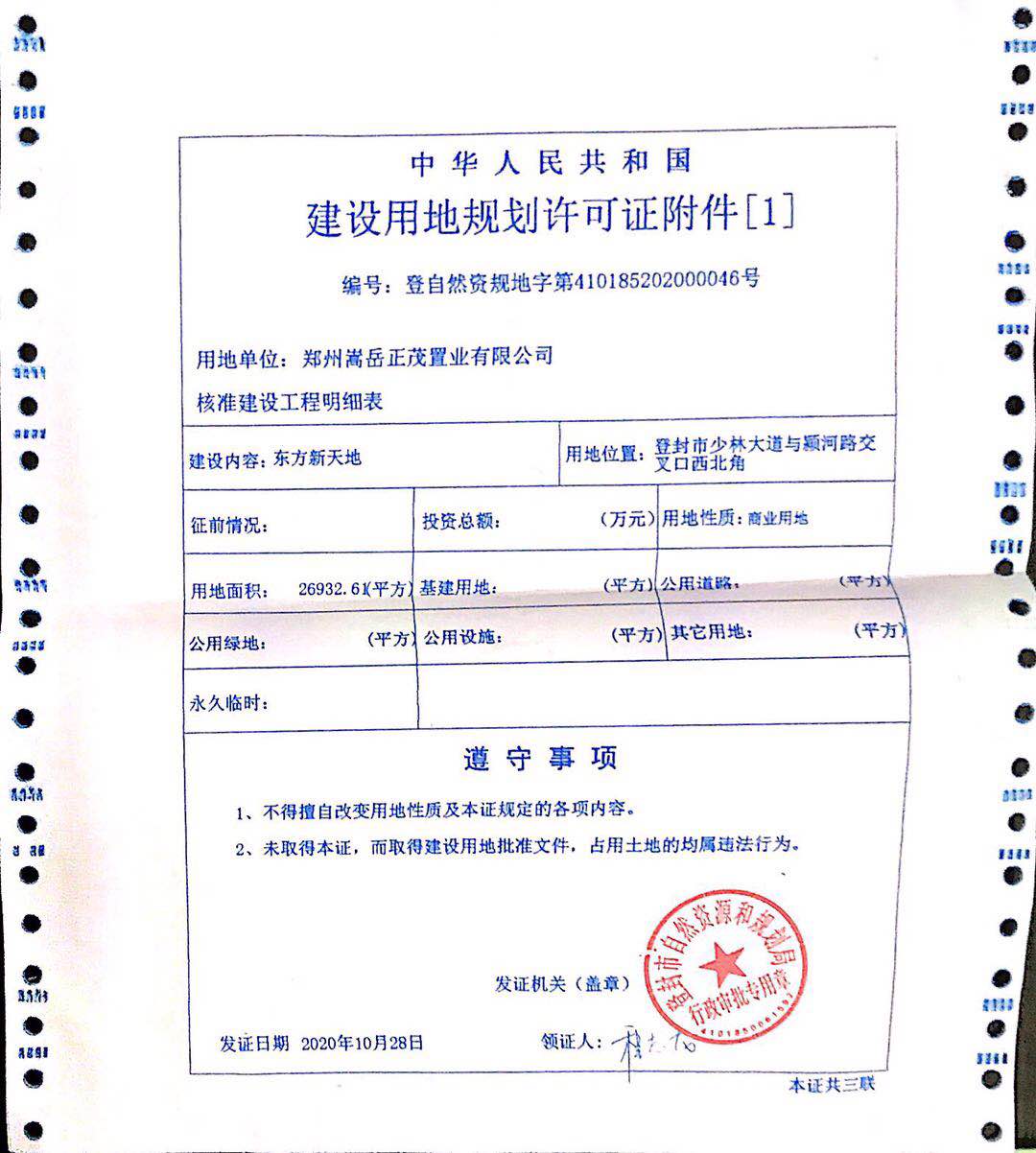 登封市自然资源和规划局关于郑州嵩岳正茂置业有限公司东方新天地项目建设用地规划许可证批后公告