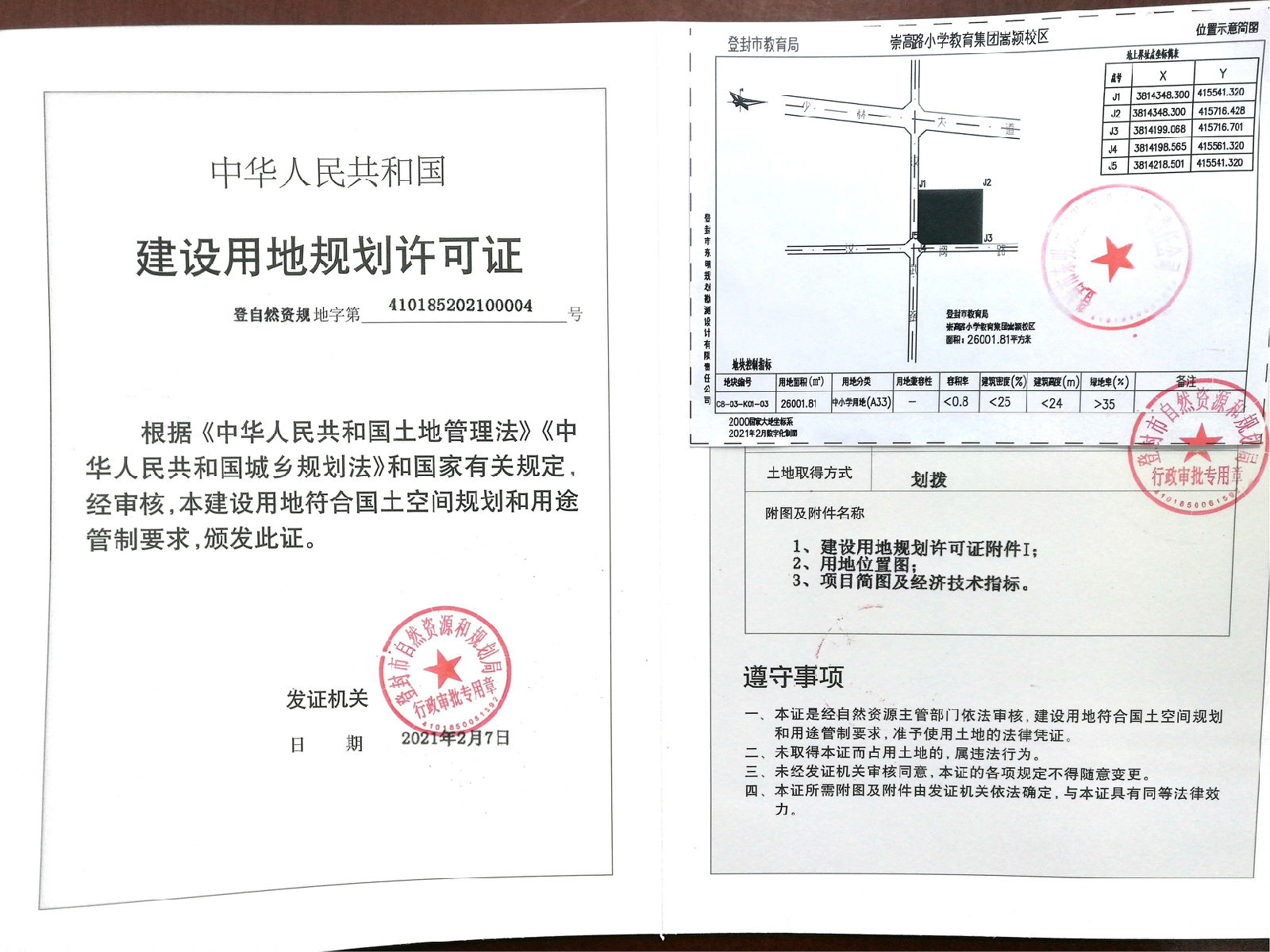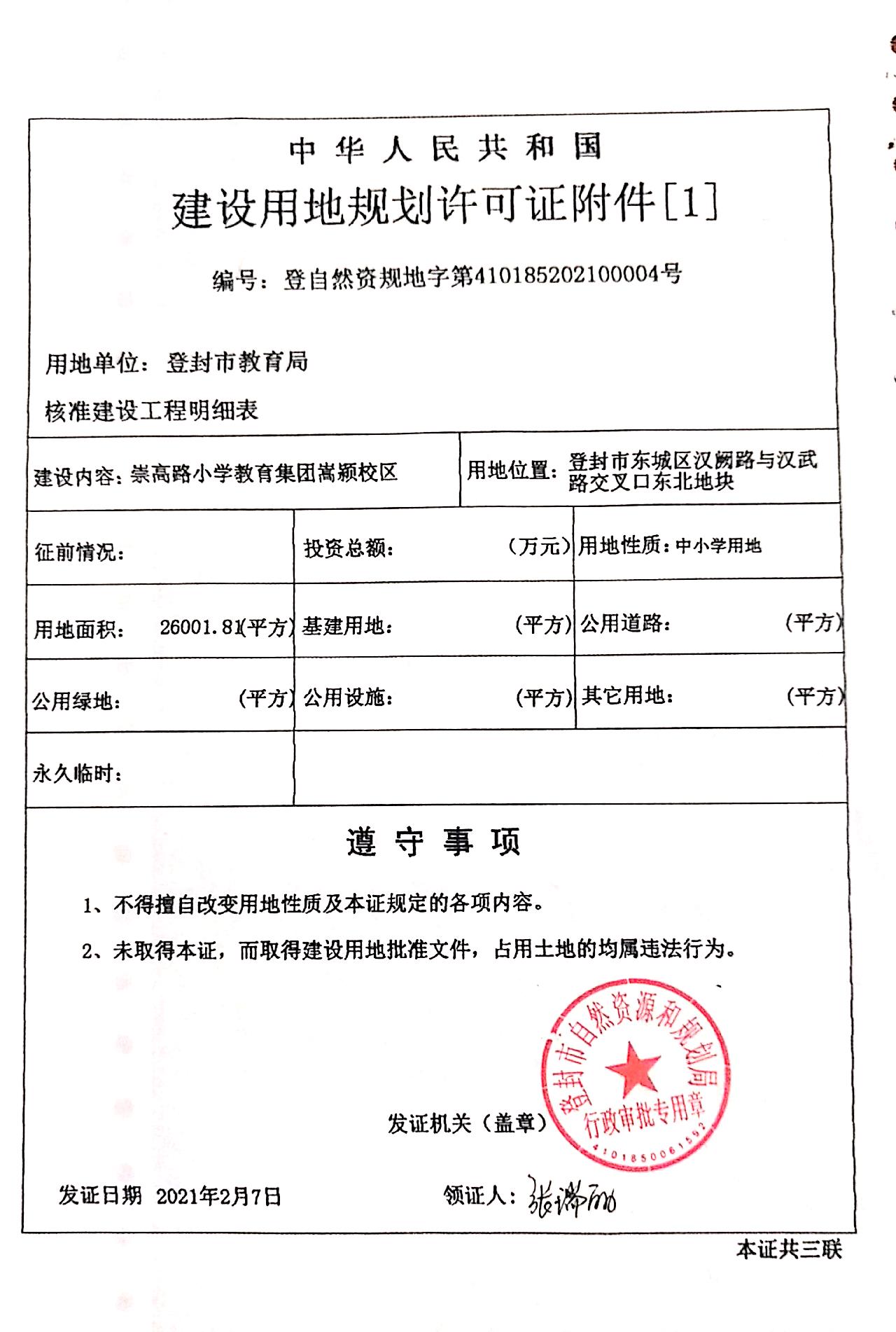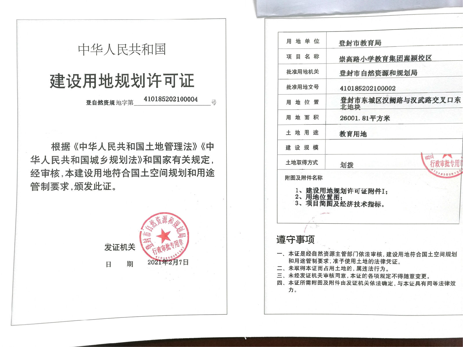 登封市自然资源和规划局关于登封市教育局崇高路小学教育集团嵩颍校区项目建设用地规划许可证批后公告