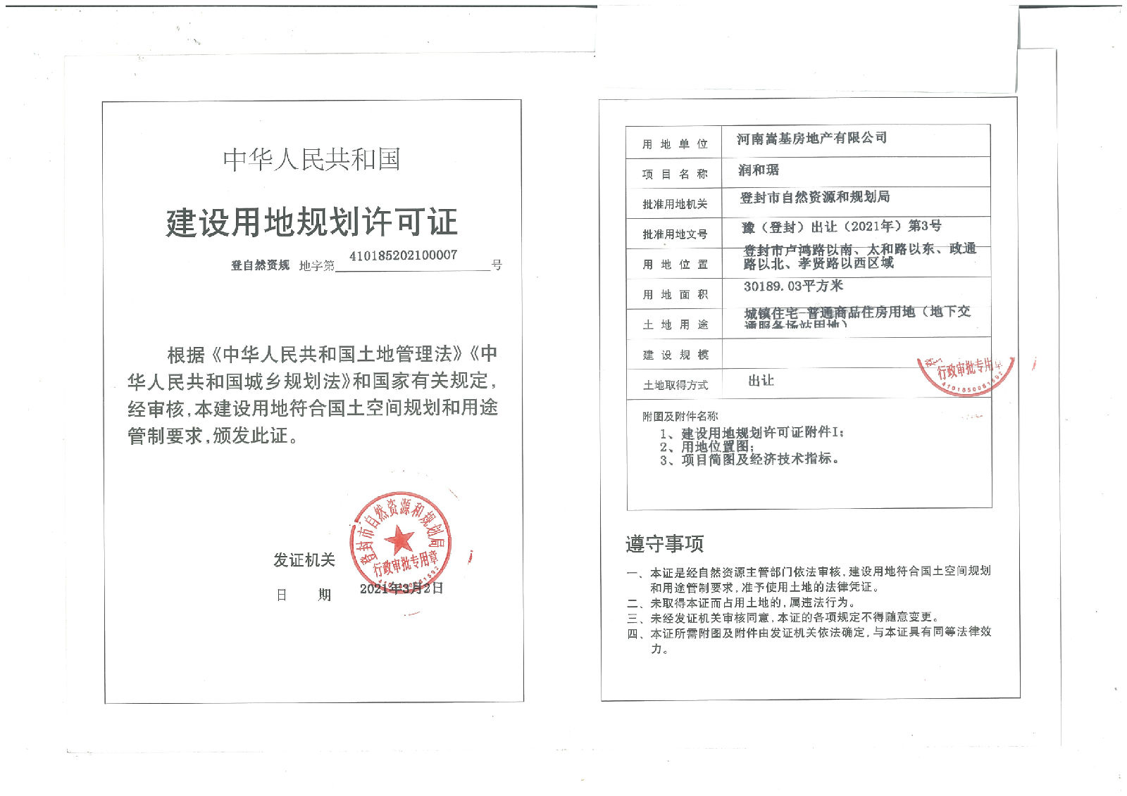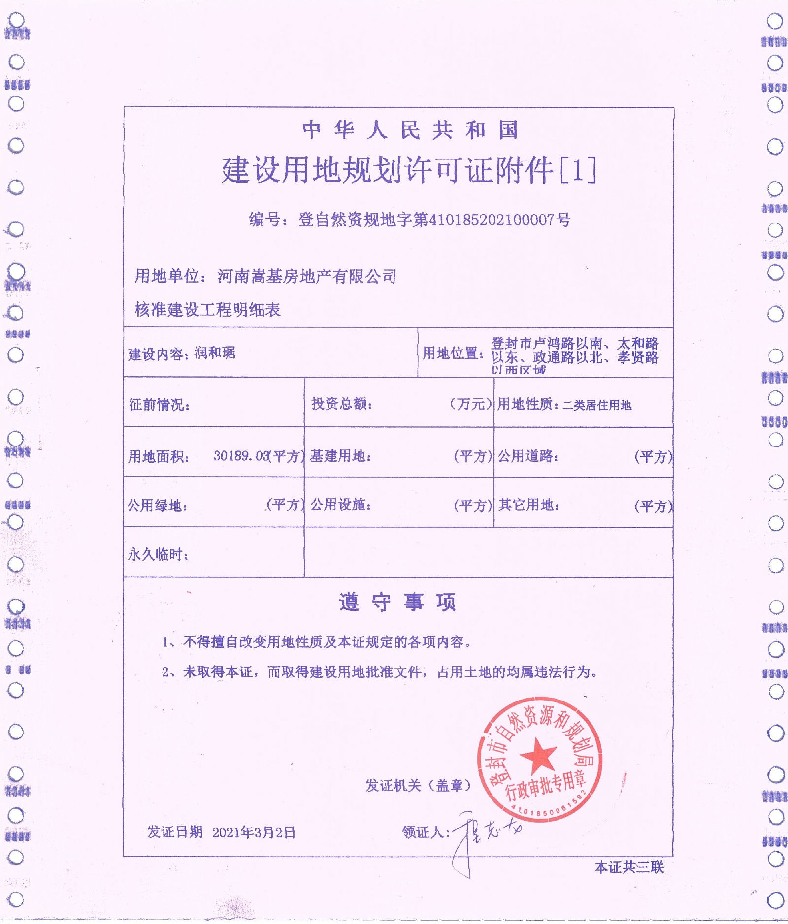 登封市自然资源和规划局关于河南嵩基房地产有限公司 润和琚建设用地规划许可证批后公告