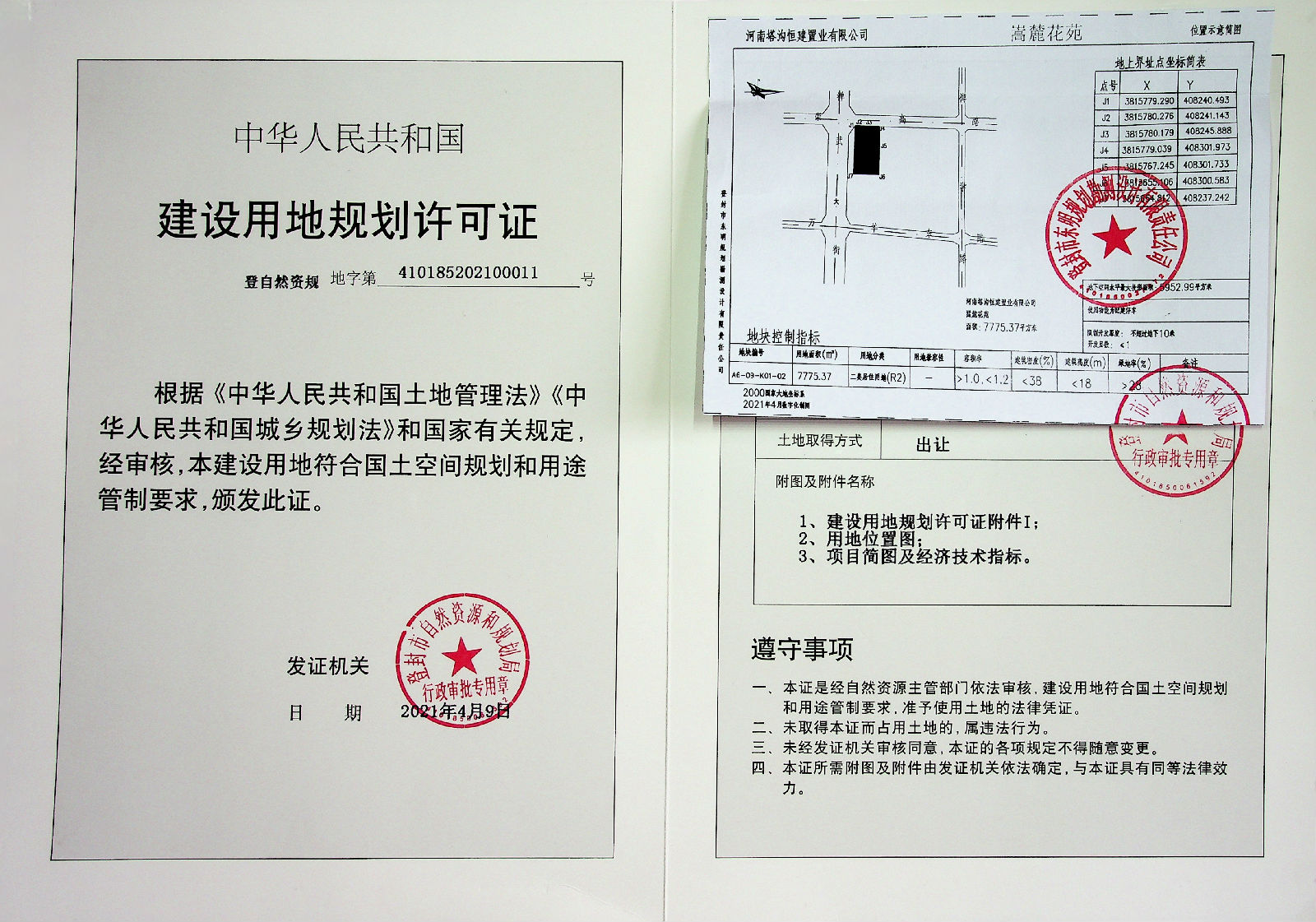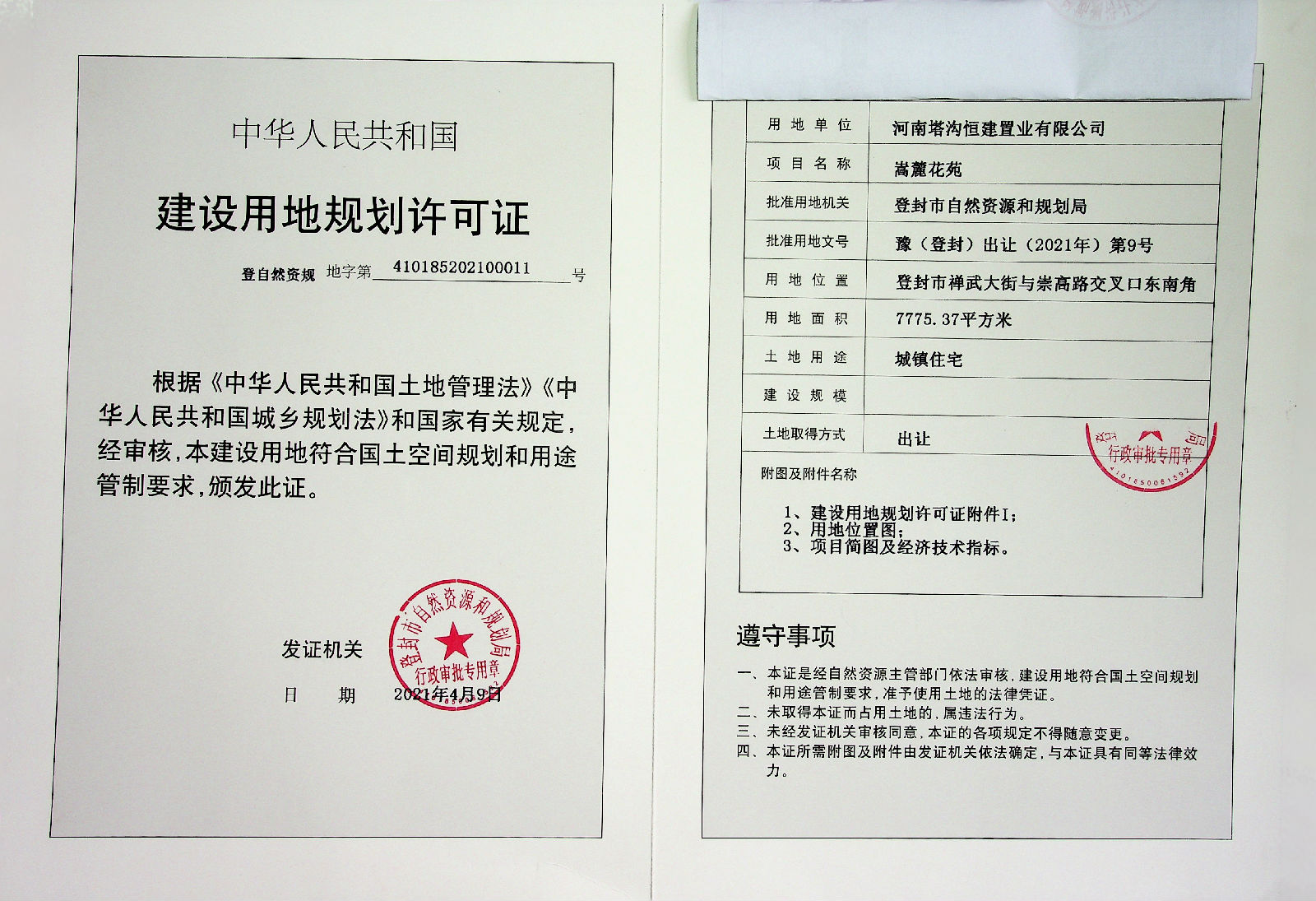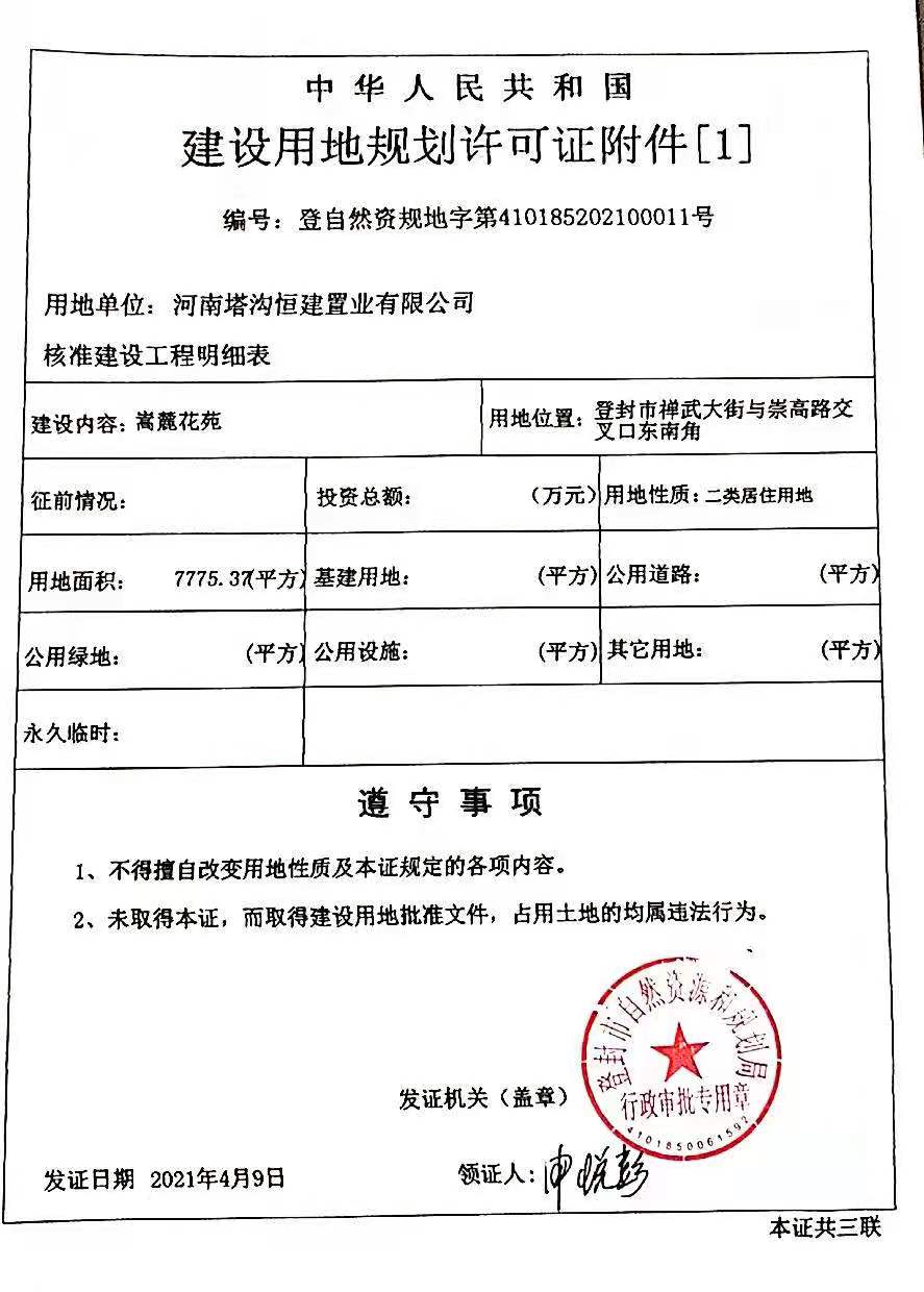 登封市自然资源和规划局关于河南塔沟恒建置业有限公司嵩麓花苑项目建设用地规划许可证批后公告