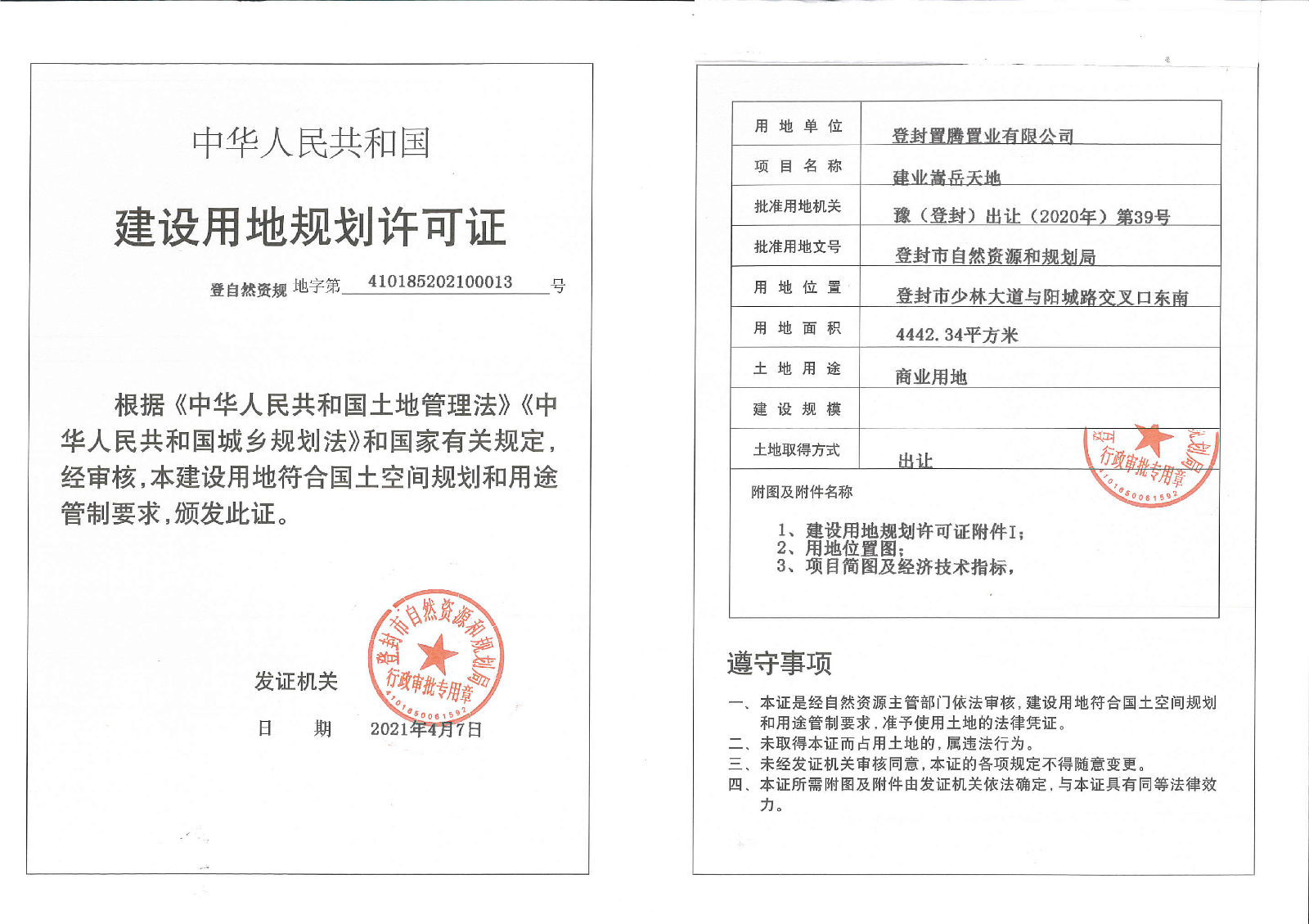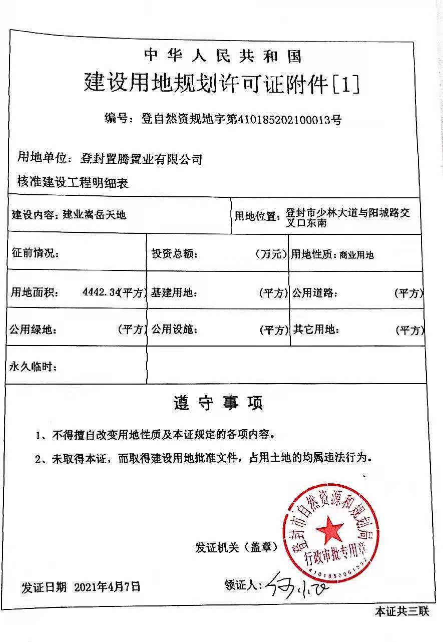 登封市自然资源和规划局关于登封置腾置业有限公司建业嵩岳天地项目建设用地规划许可证批后公告