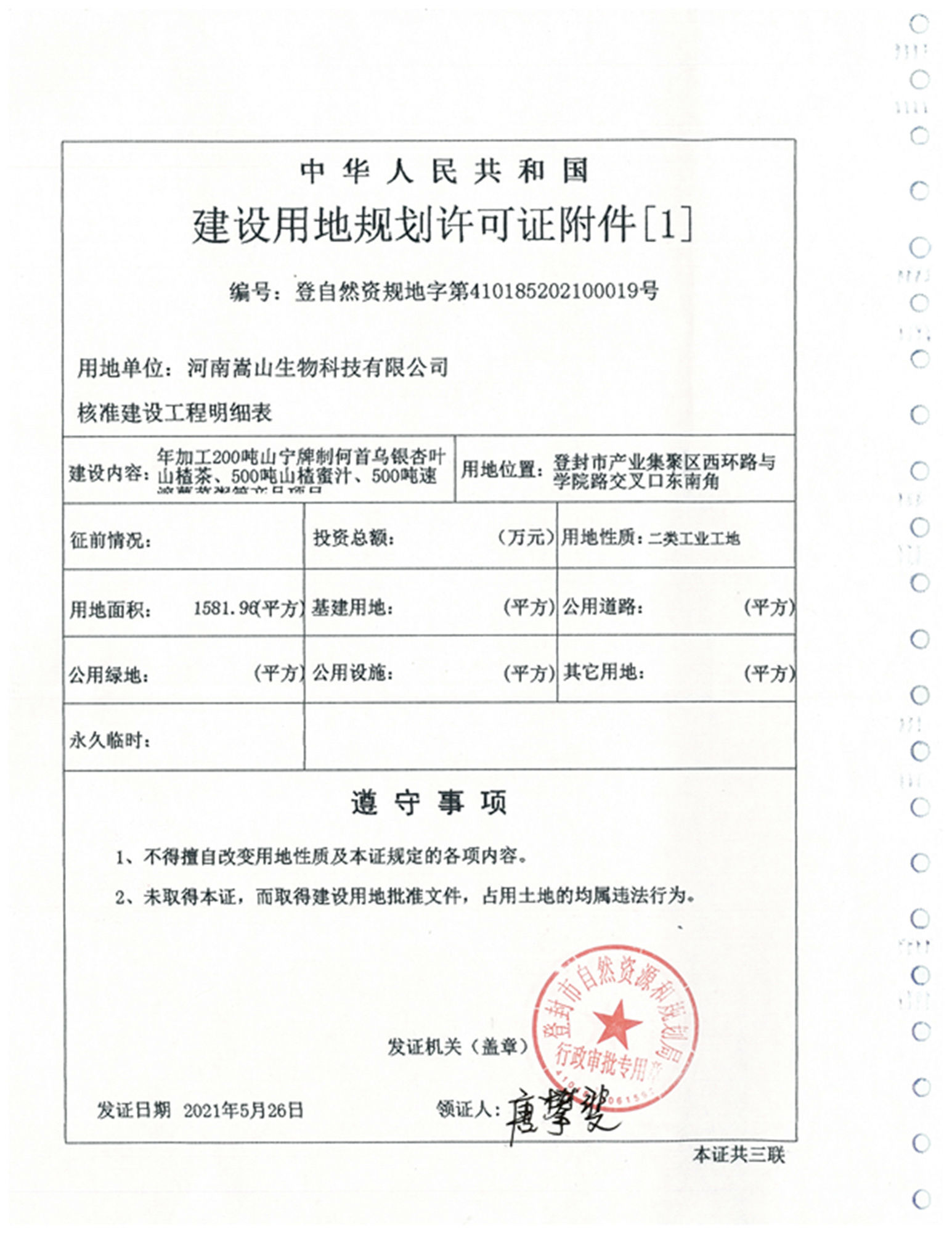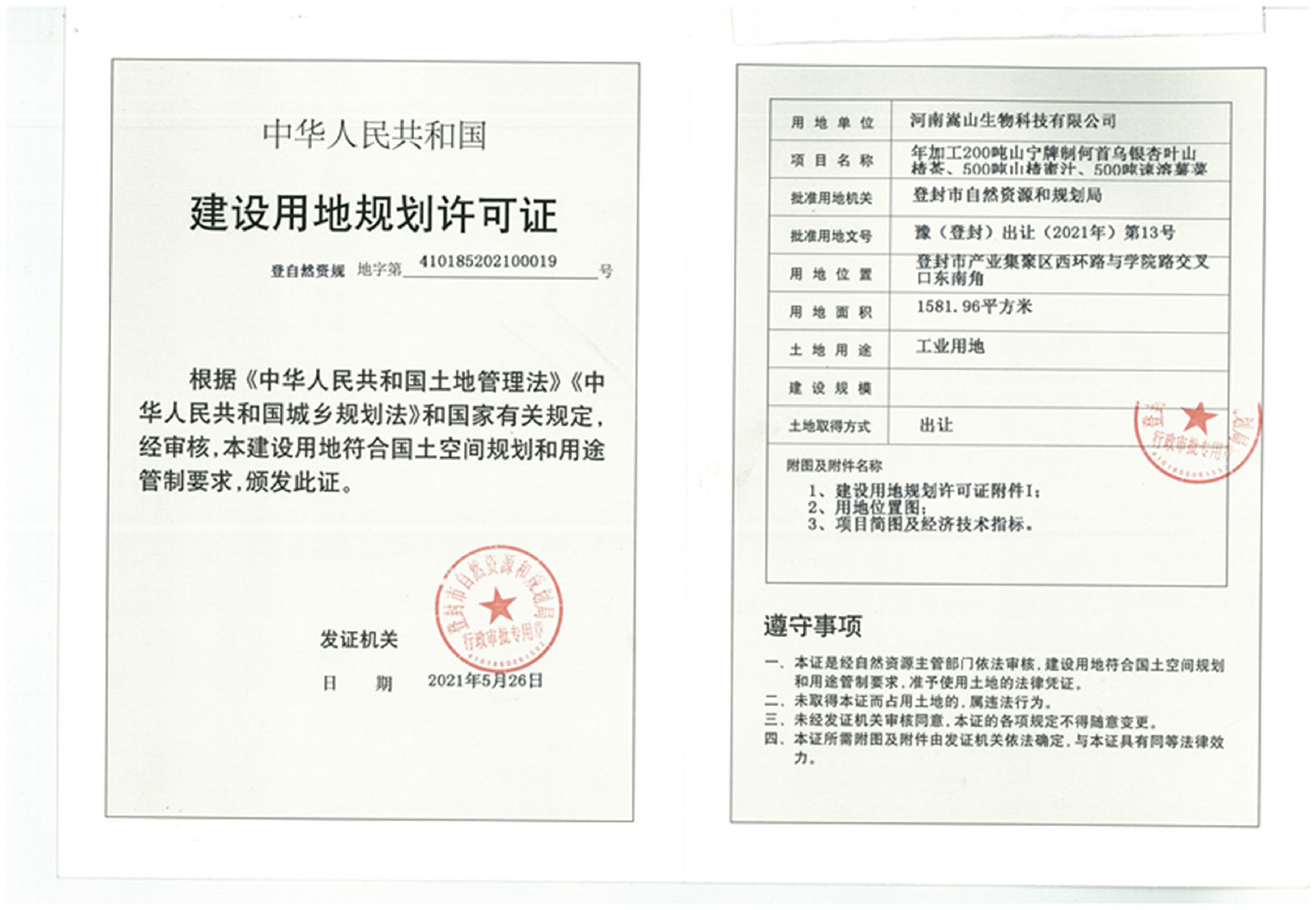 登封市自然资源和规划局关于河南嵩山生物科技有限公司年加工200吨山宁牌制何首乌银杏叶山楂茶、500吨山楂蜜汁、500吨速溶薯菜粥等产品项目建设用地规划许可证批后公告