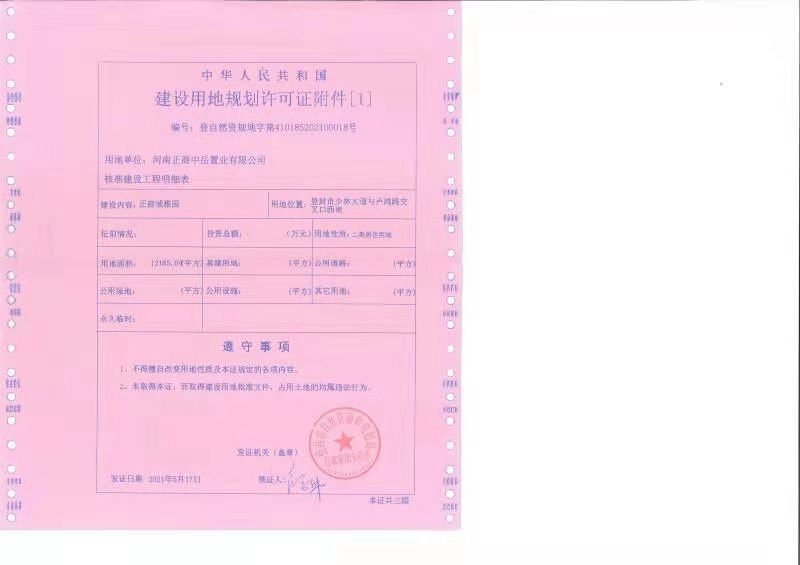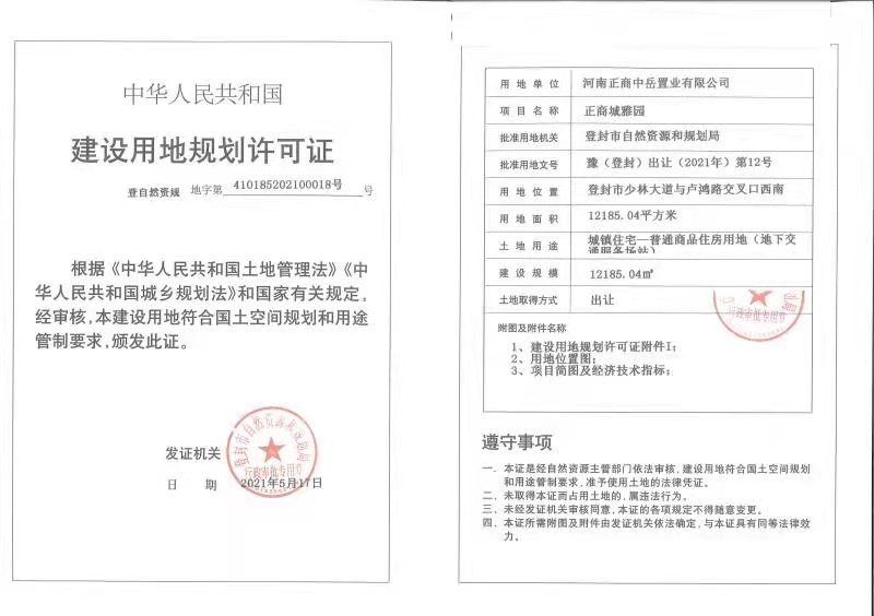 登封市自然资源和规划局关于河南正商中岳置业有限公司正商城雅园项目建设用地规划许可证批后公告