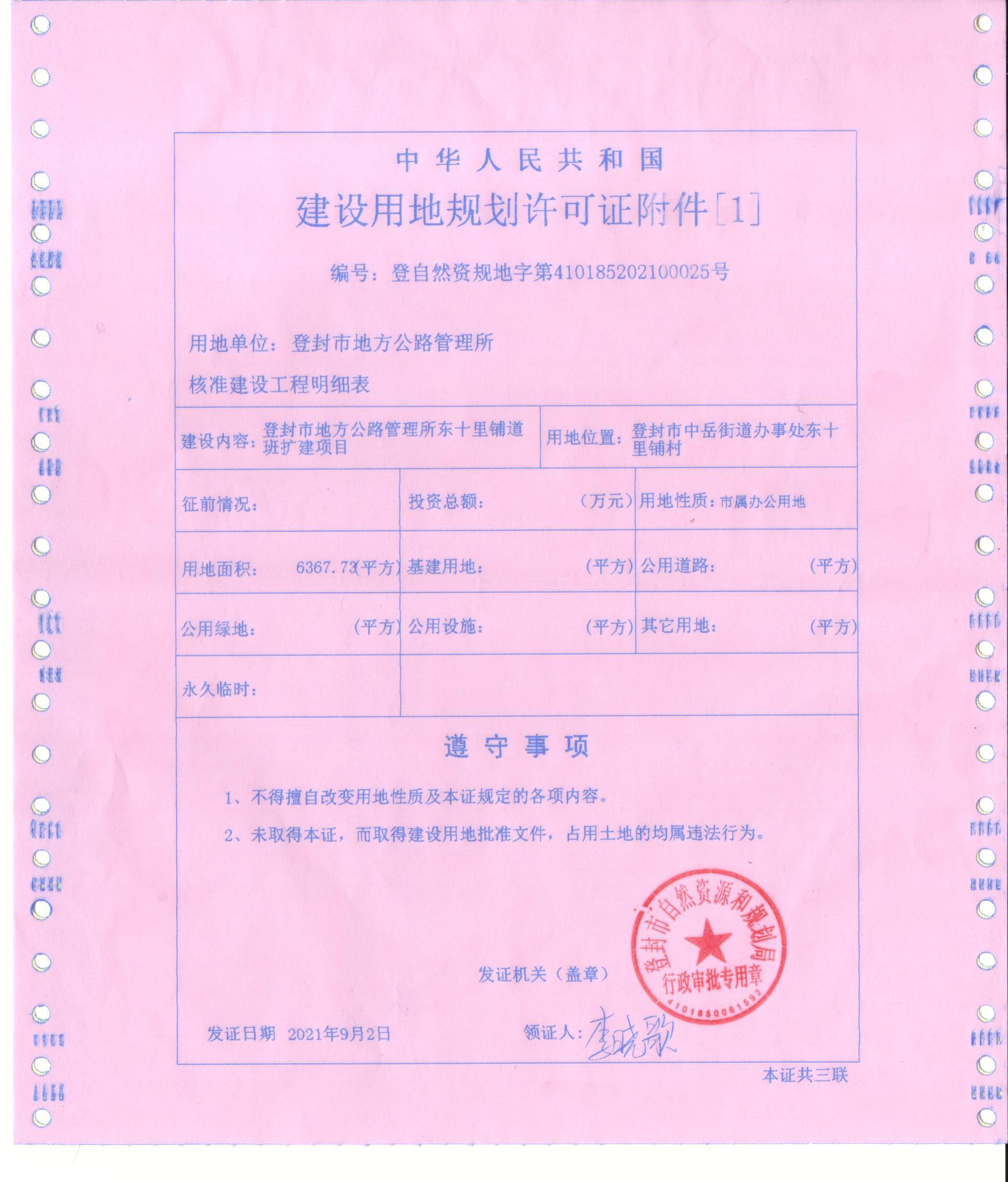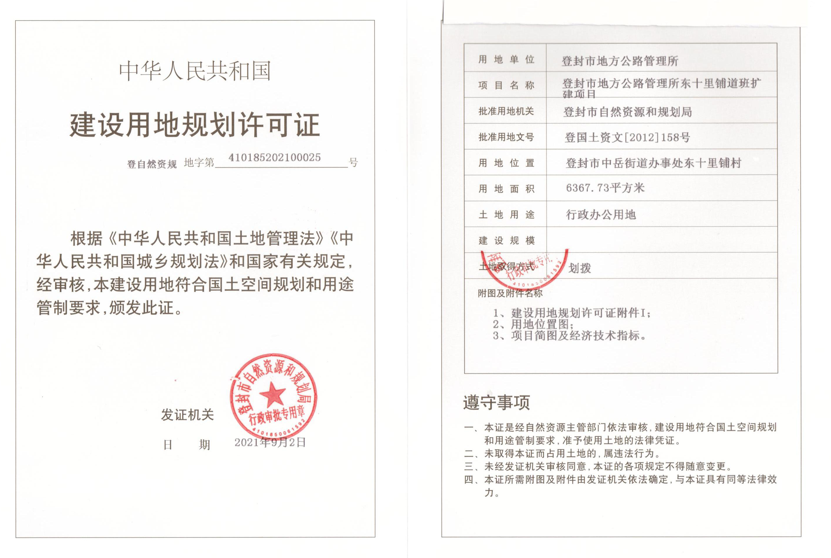 登封市自然资源和规划局关于登封市地方公路管理所东十里铺道班扩建项目建设用地规划许可证证后公告
