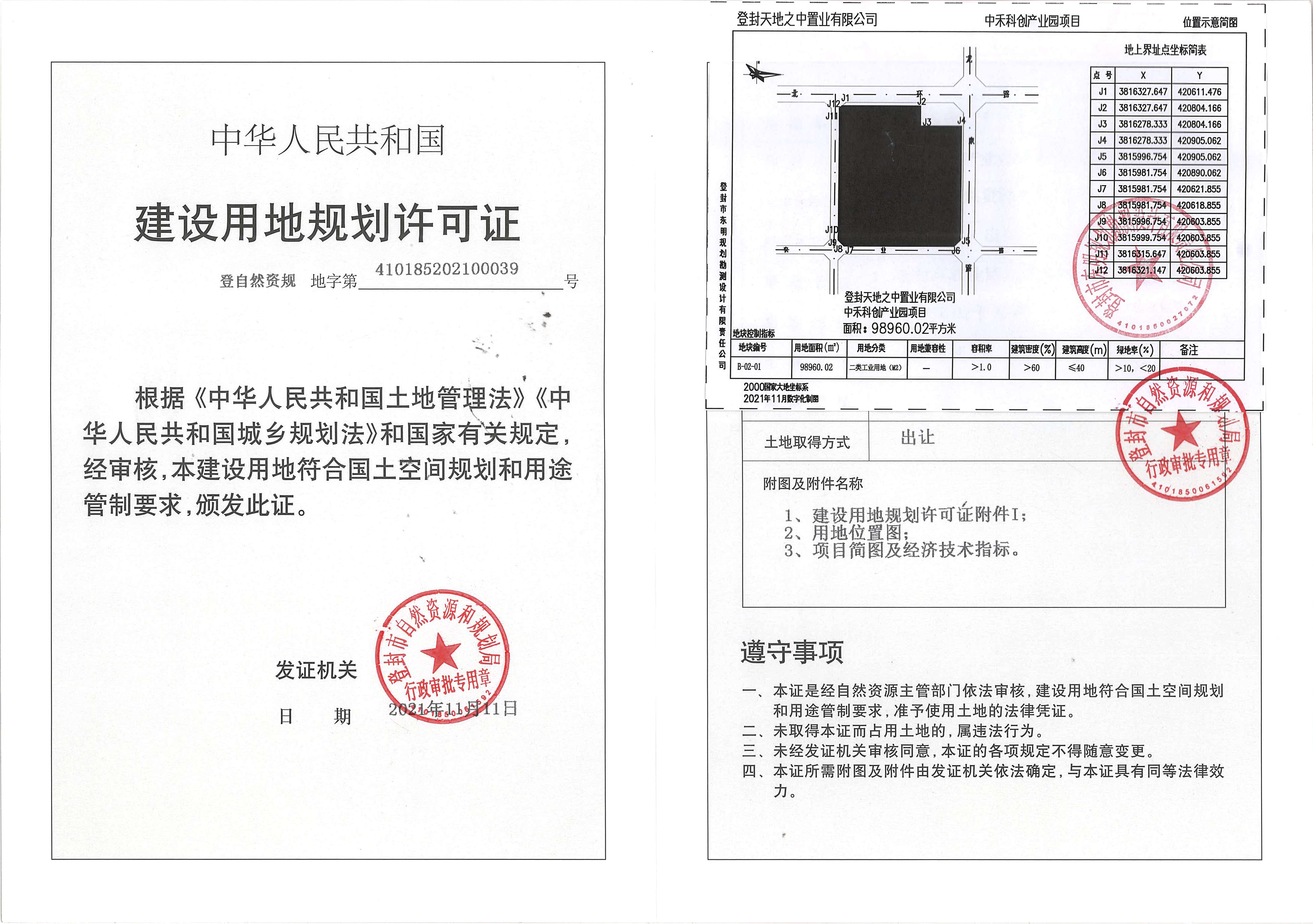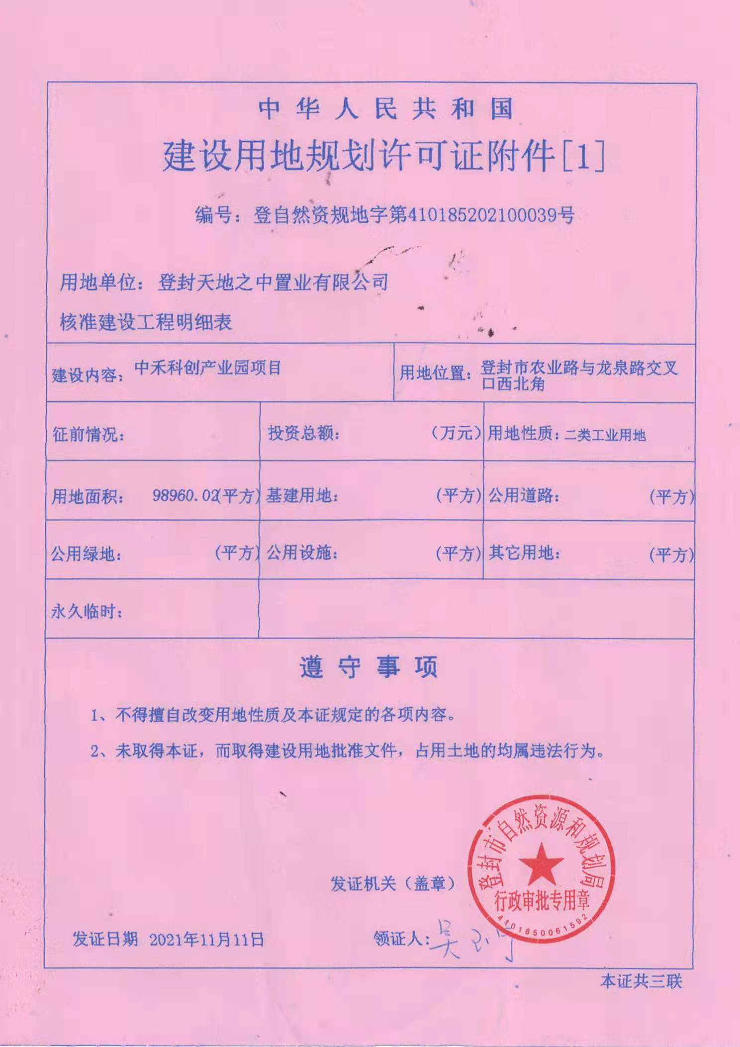 登封市自然资源和规划局关于中禾科创产业园项目建设用地规划许可证证后公告