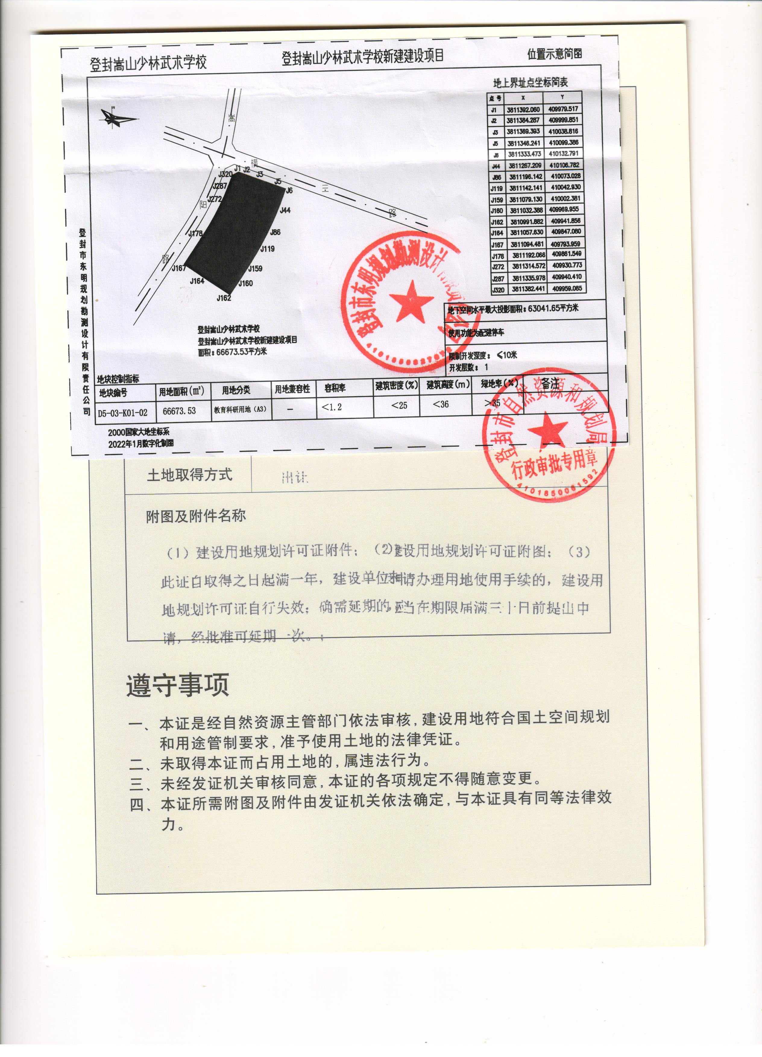 登封市自然资源和规划局关于登封嵩山少林武术学校新校建设项目建设用地规划许可证证后公告