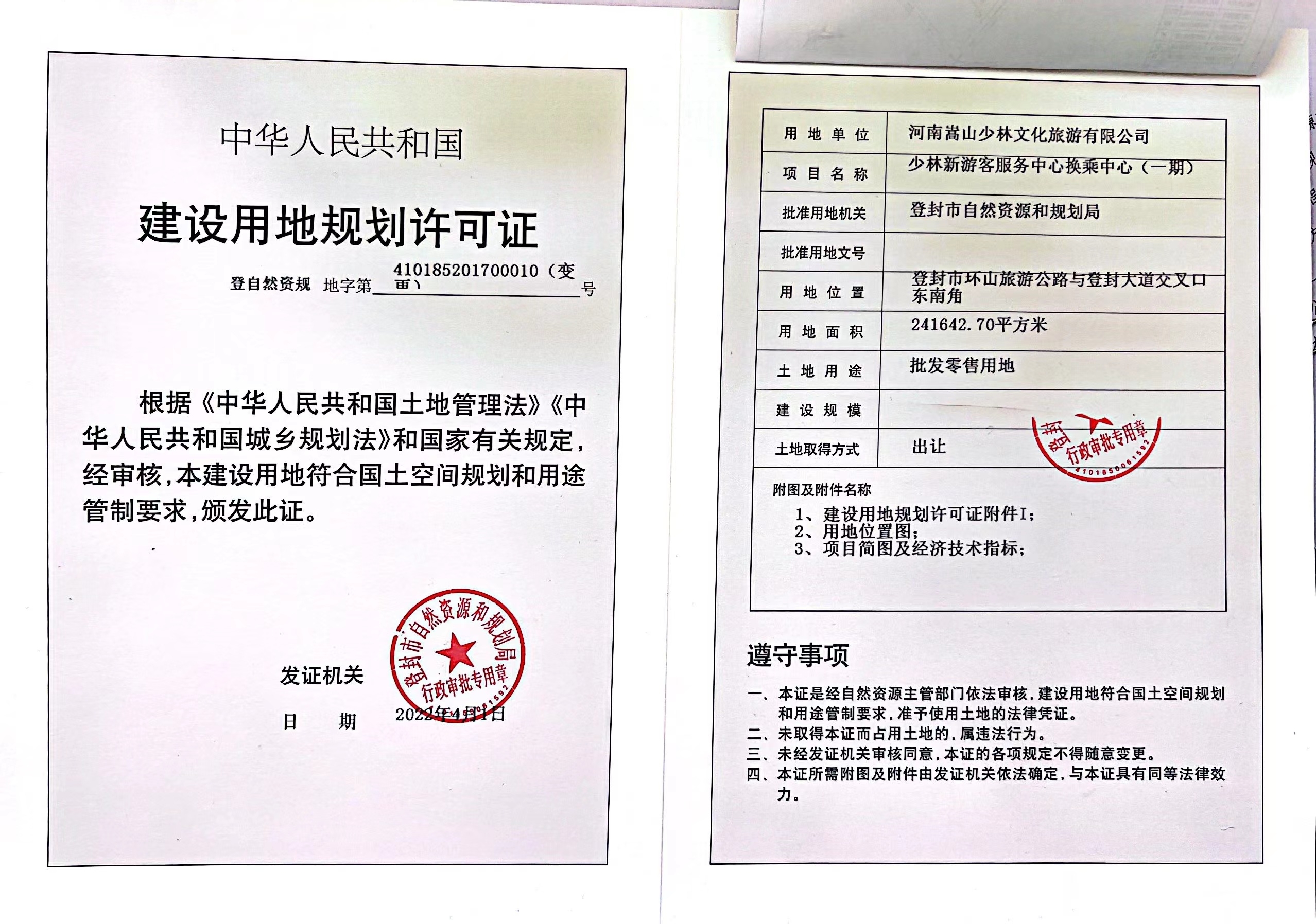 登封市自然资源和规划局关于少林游客服务中心换乘中心(一期)建设用地规划许可证变更证后公告