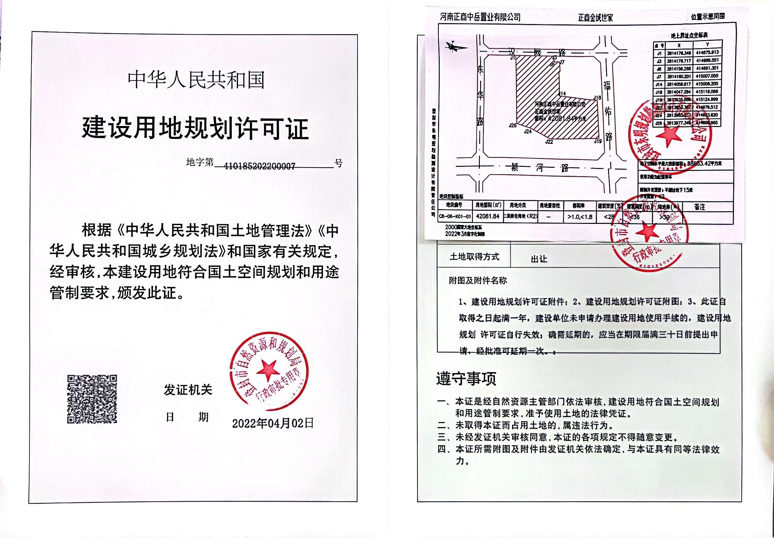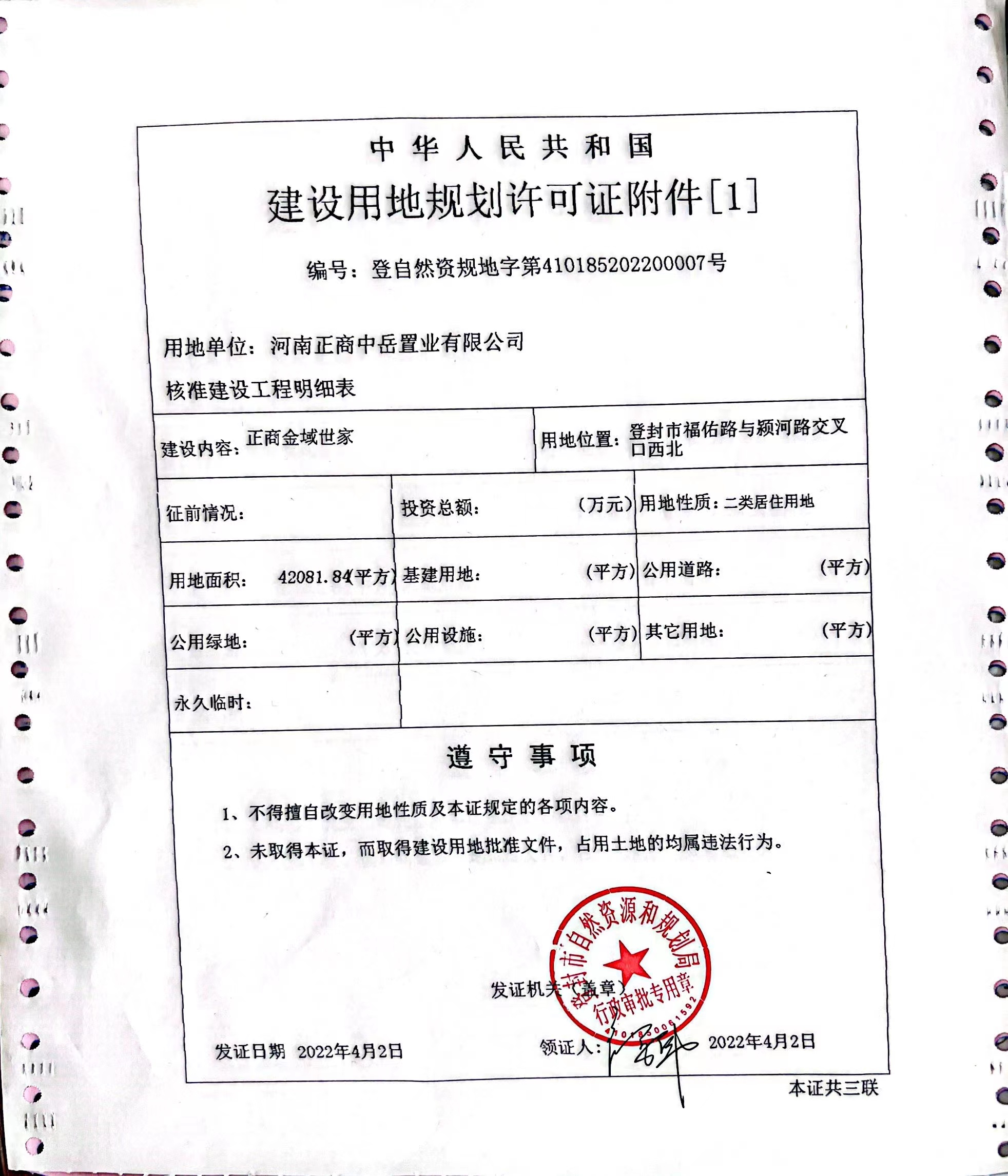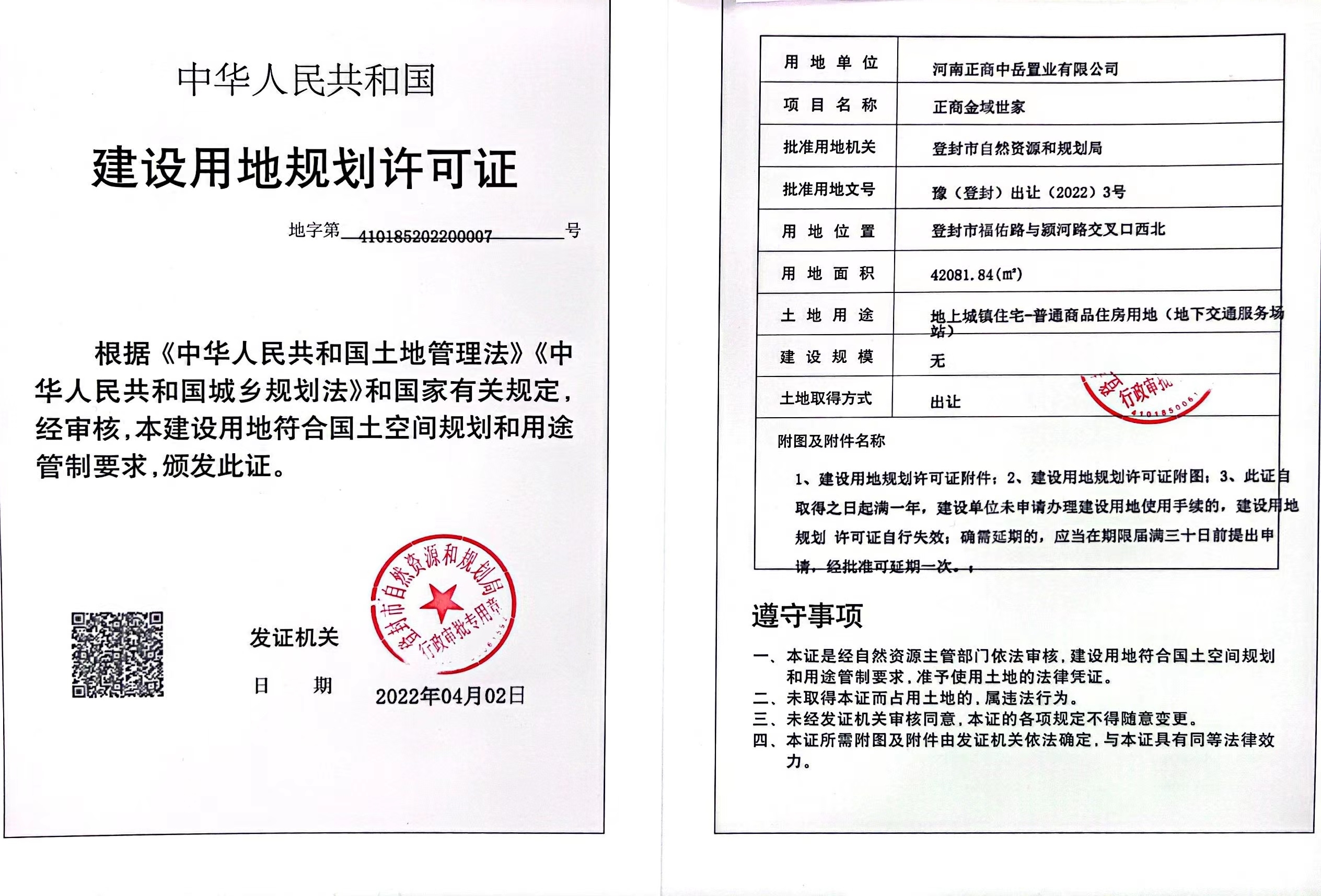 登封市自然资源和规划局关于正商金域世家建设用地规划许可证证后公告
