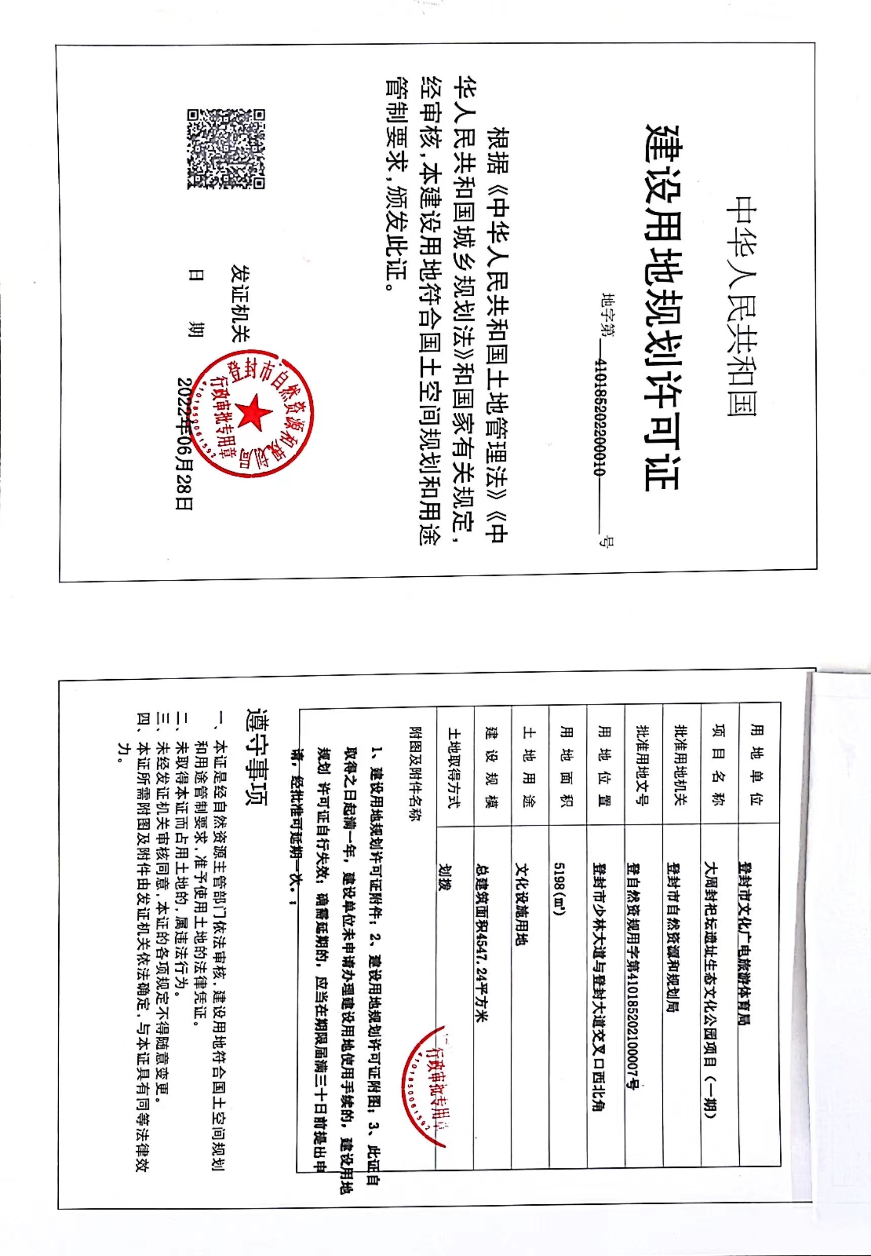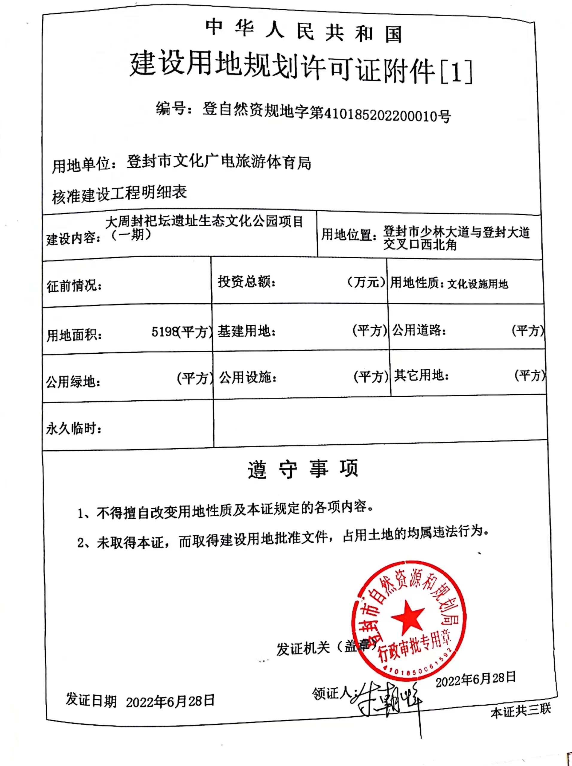 登封市自然资源和规划局关于大周封祀坛遗址生态文化公园项目(一期)项目建设用地规划许可证的证后公告