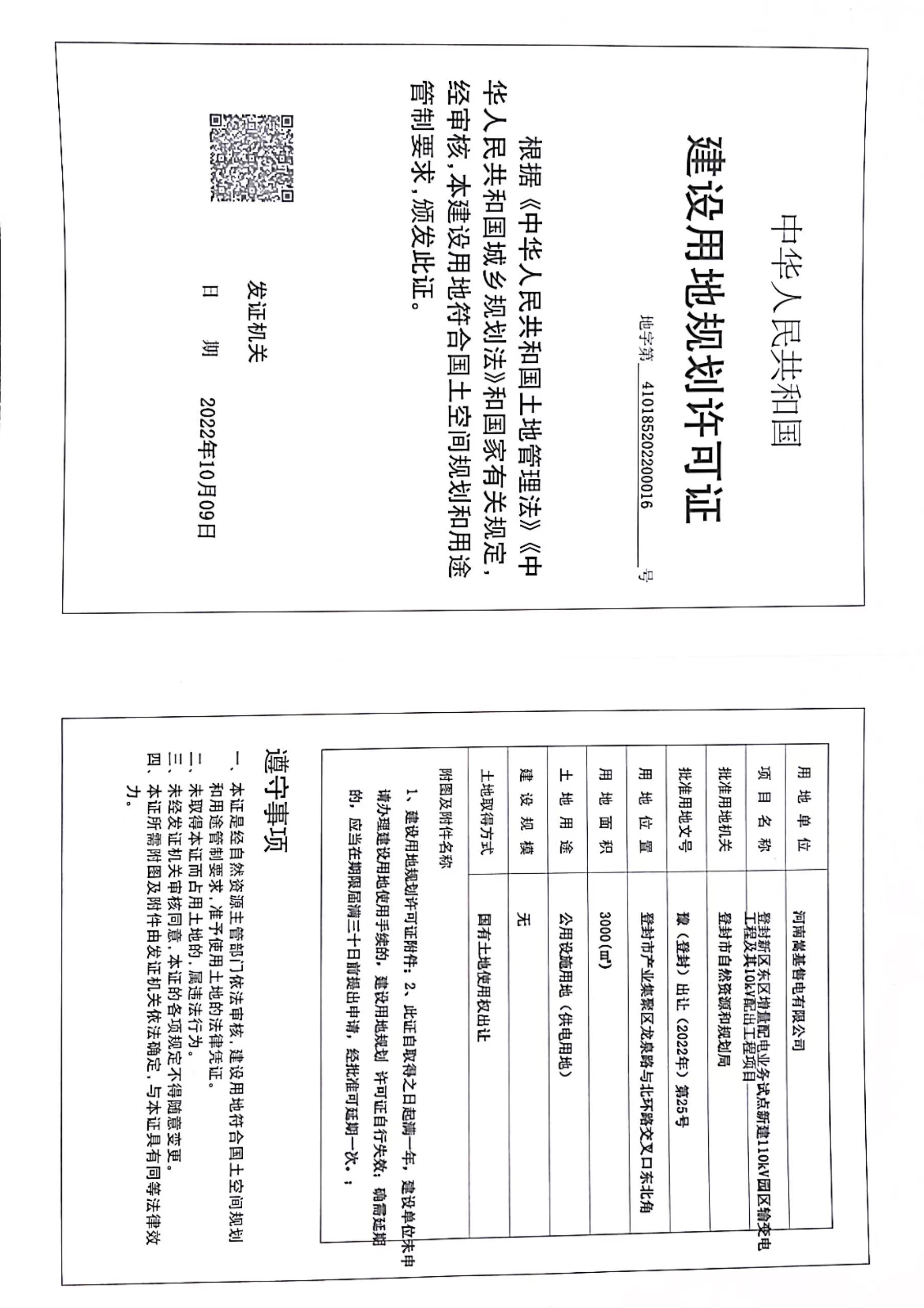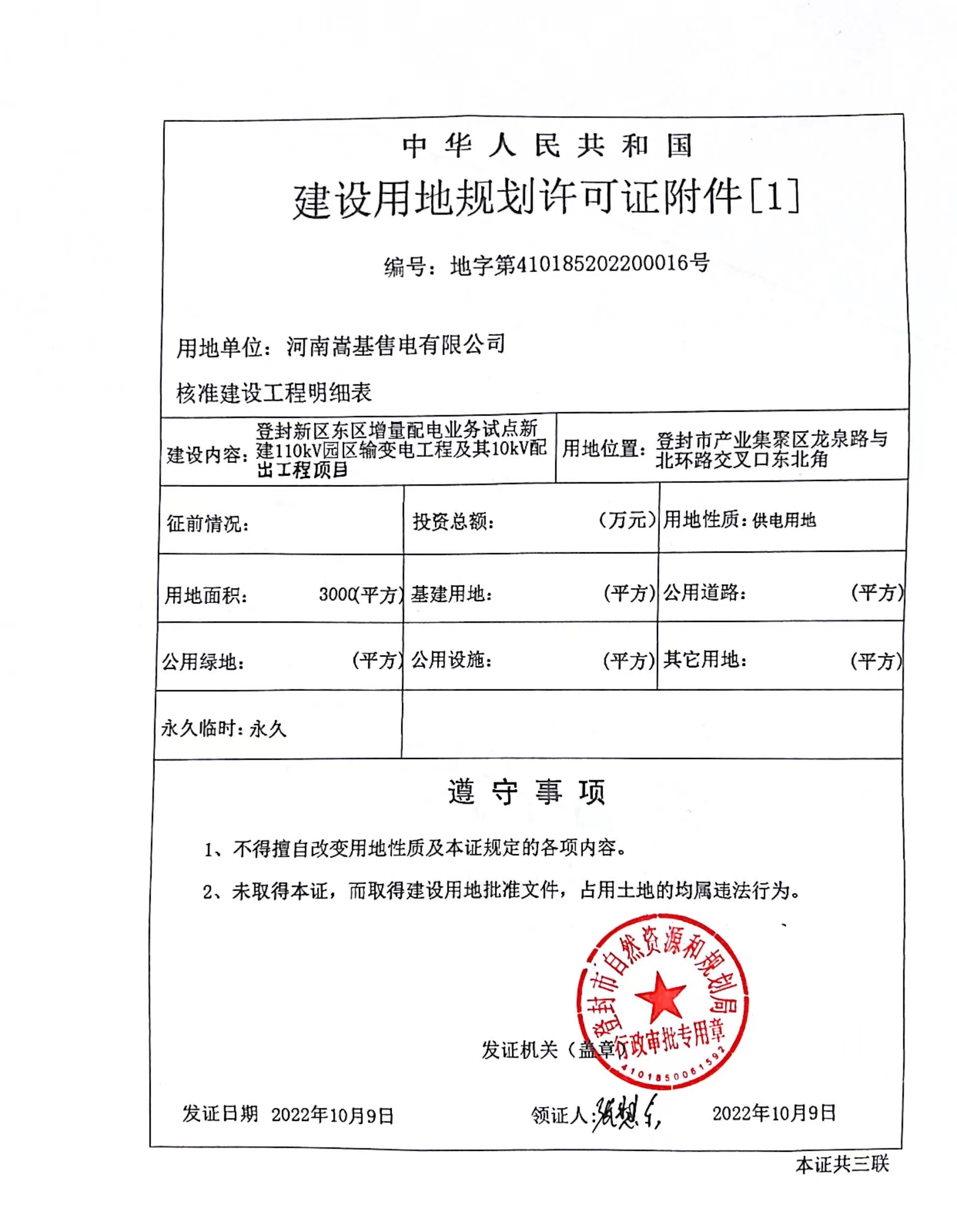 登封市自然资源和规划局关于登封新区东区增量配电业务试点新建110kV园区输变电工程及其10kV配出工程项目建设用地规划许可证证后公告