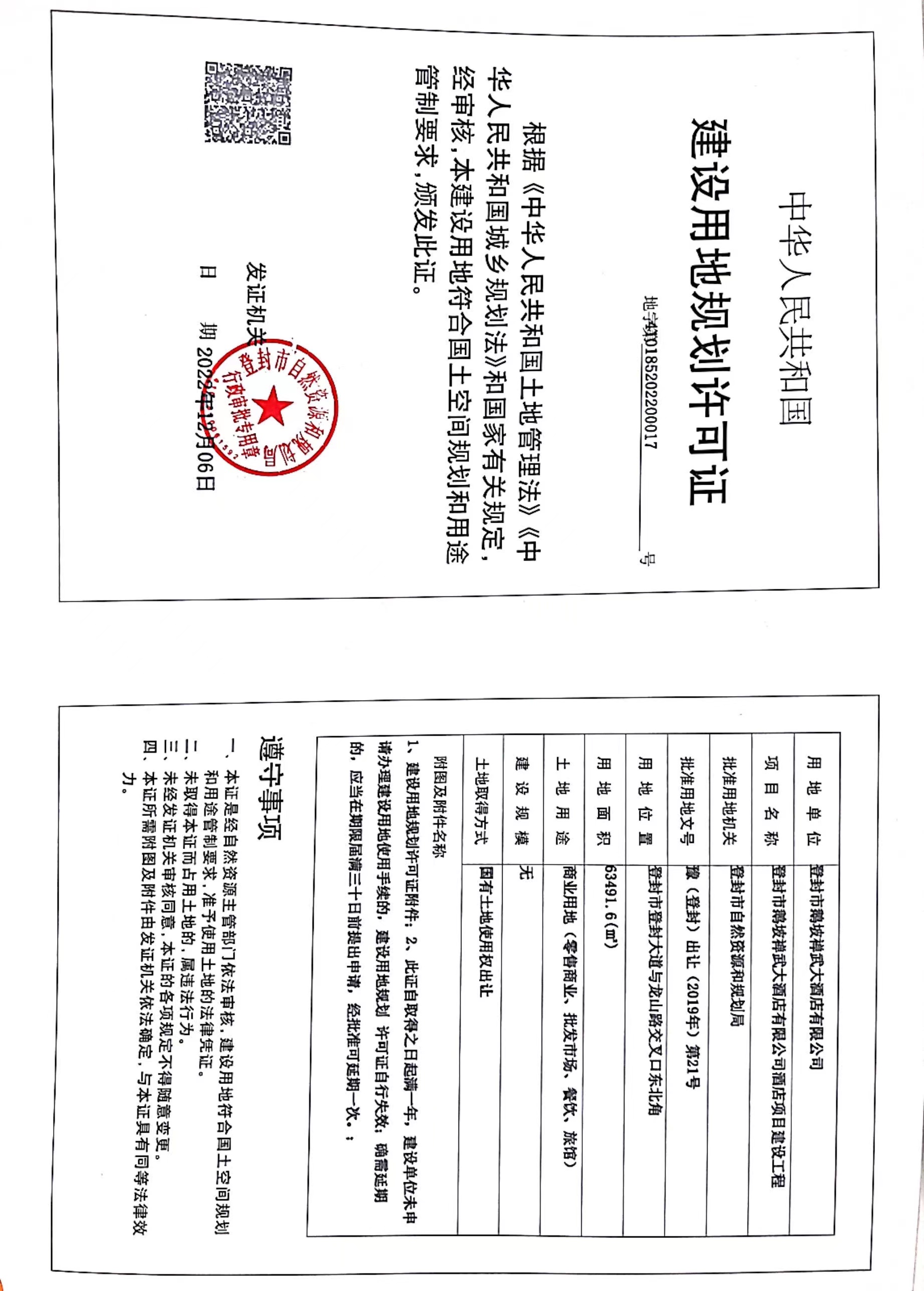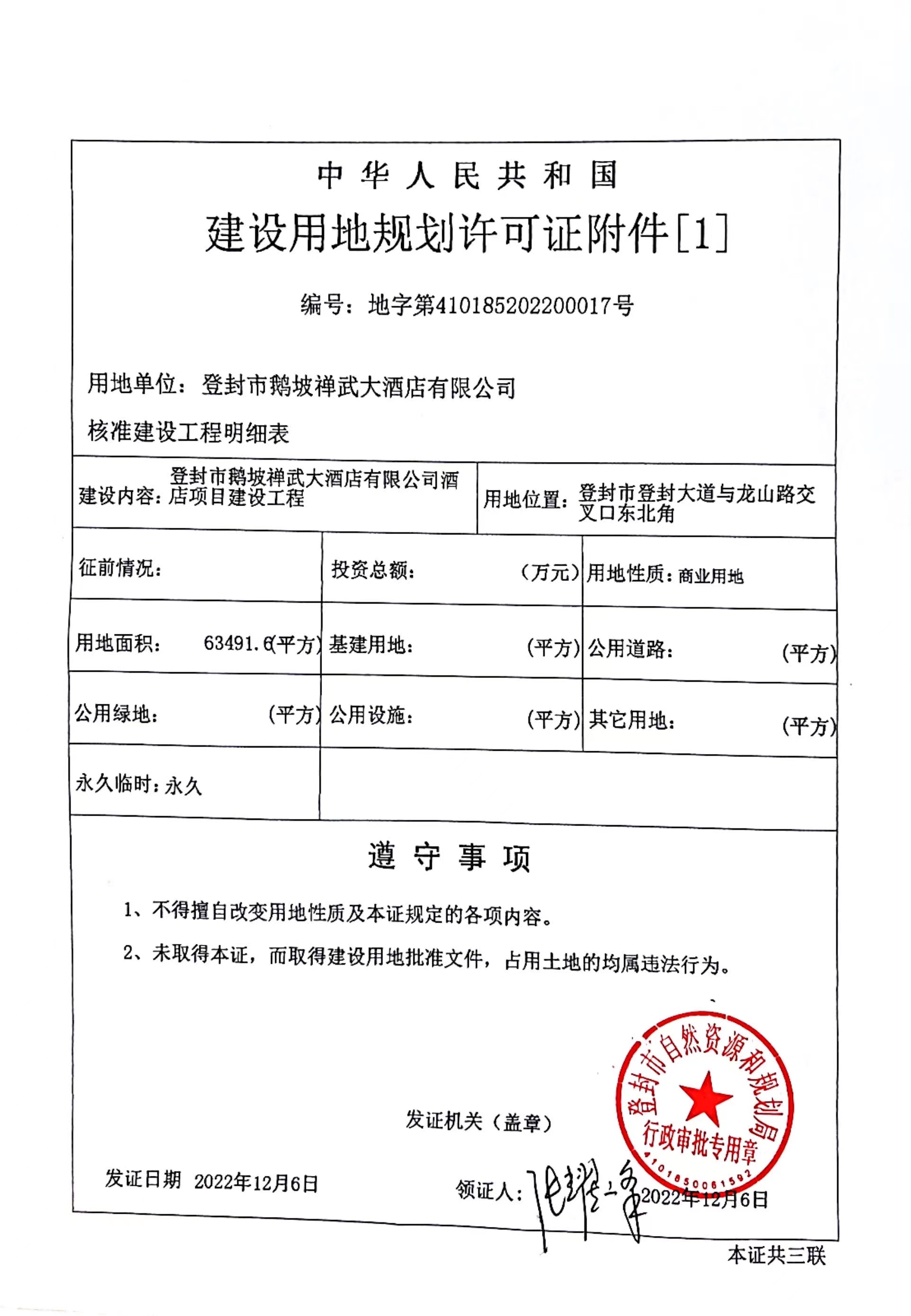 登封市自然资源和规划局关于登封市鹅坡禅武大酒店有限公司酒店项目建设工程建设用地规划许可证证后公告