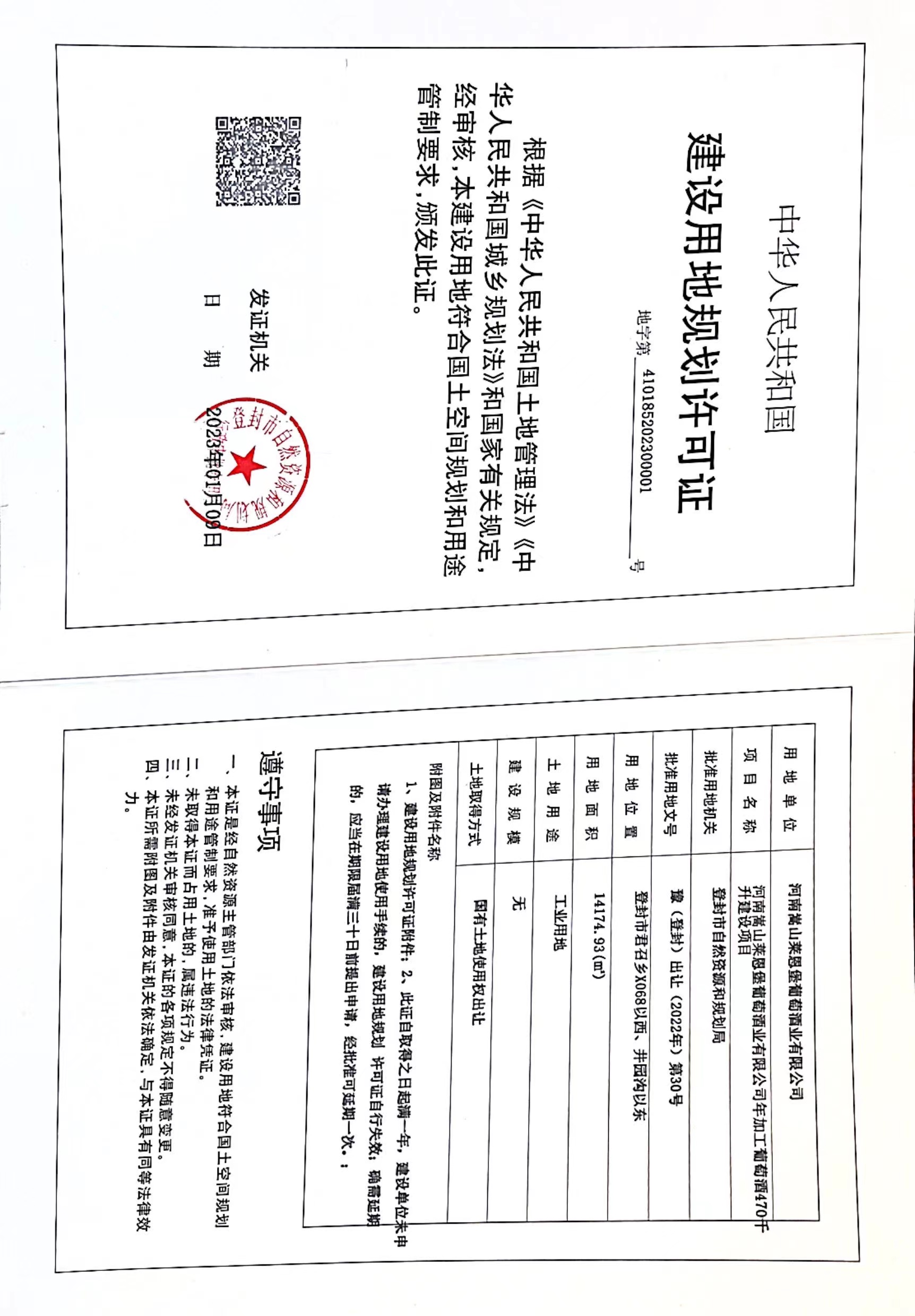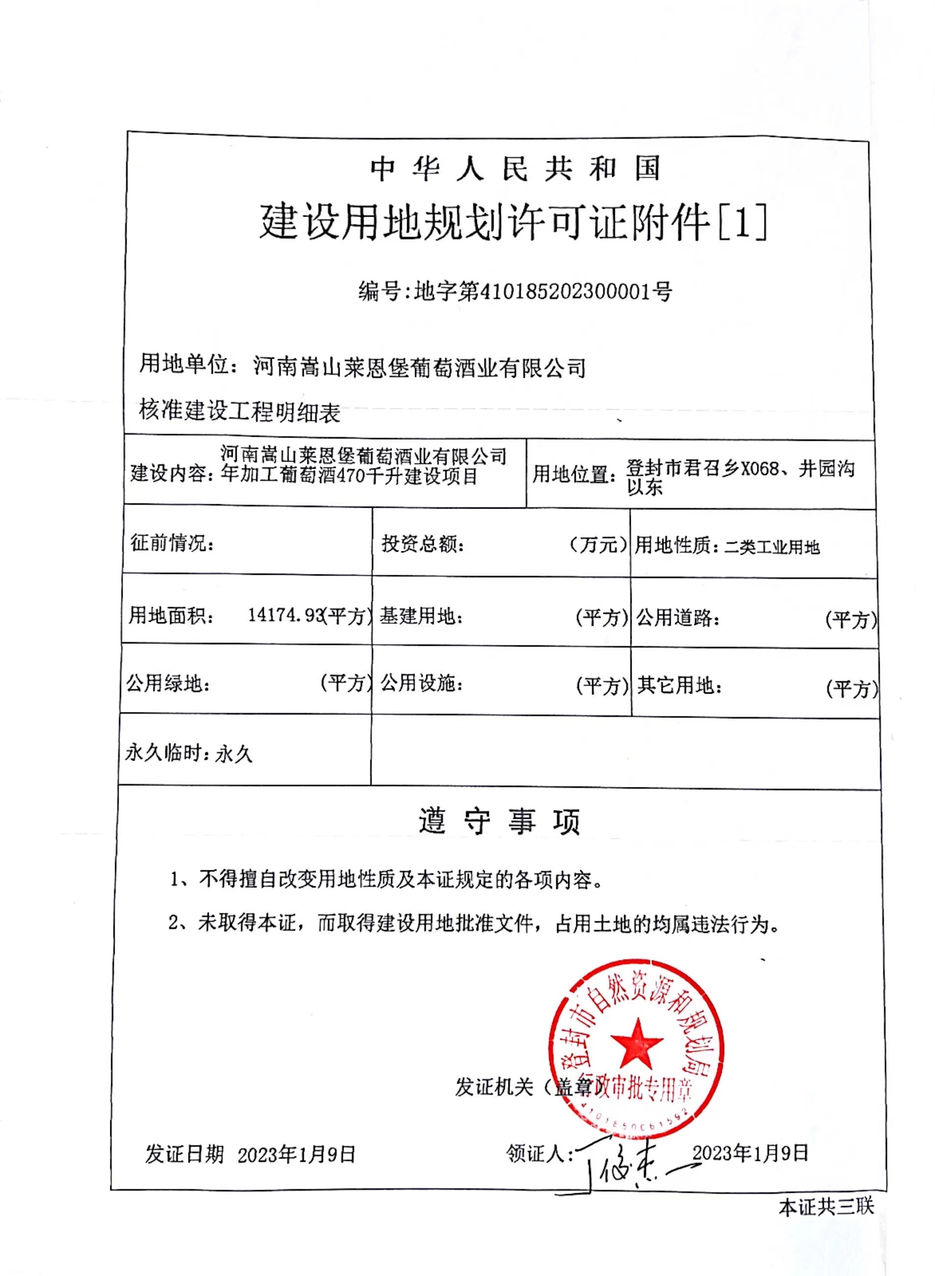 登封市自然资源和规划局关于河南嵩山莱恩堡葡萄酒业有限公司年加工葡萄酒470千升建设项目建设用地规划许可证证后公告