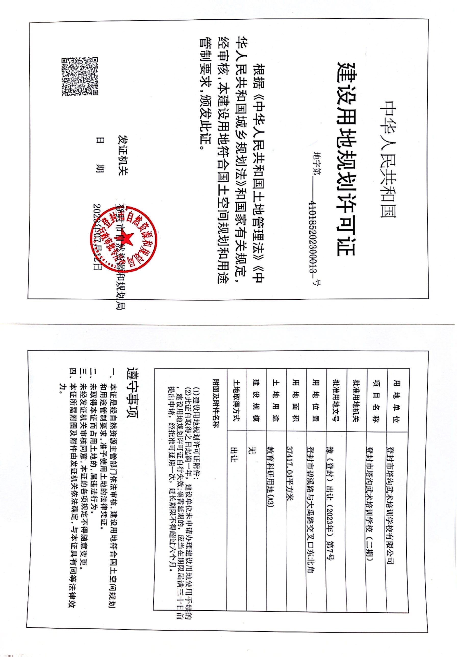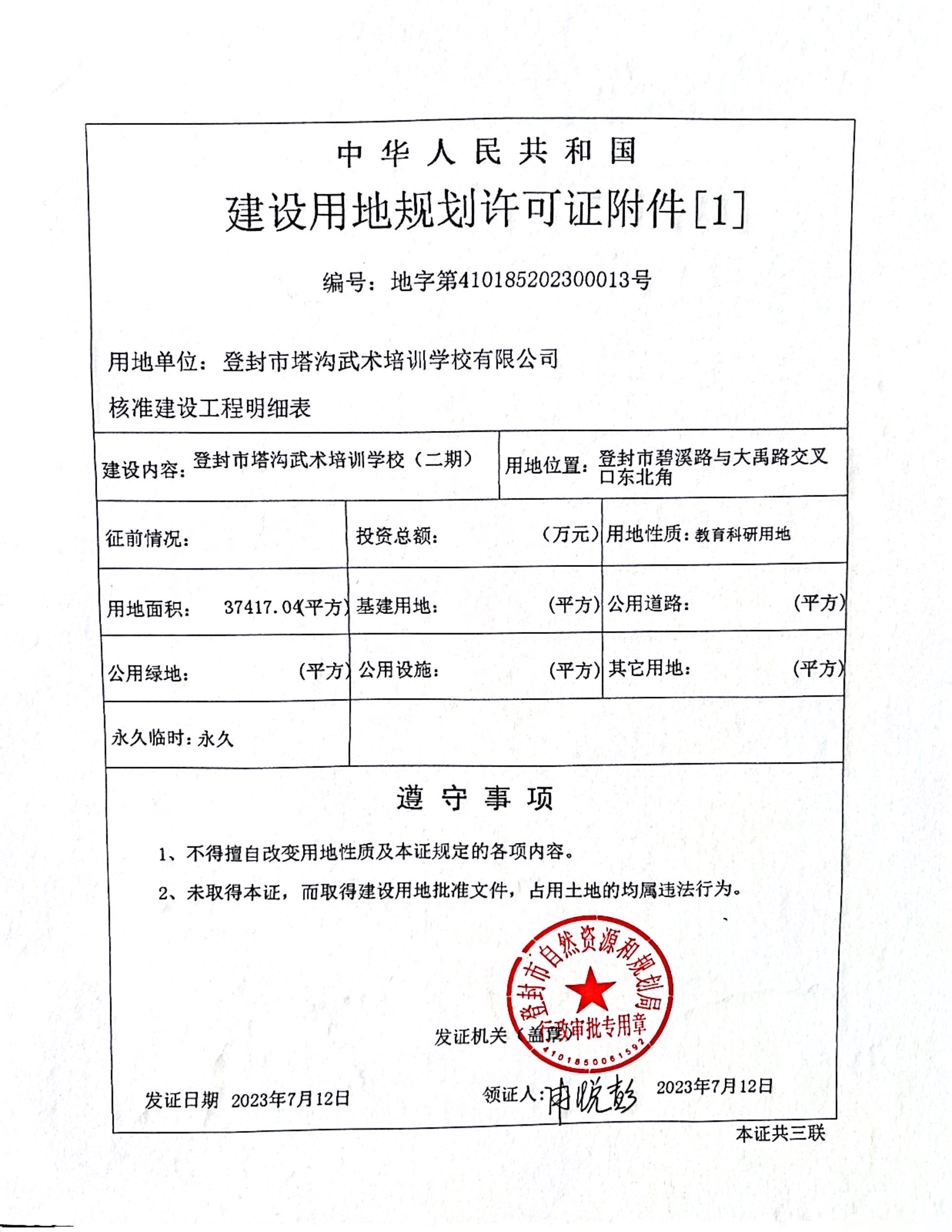 登封市自然资源和规划局关于登封市塔沟武术培训学校(二期)项目建设用地规划许可证证后公告