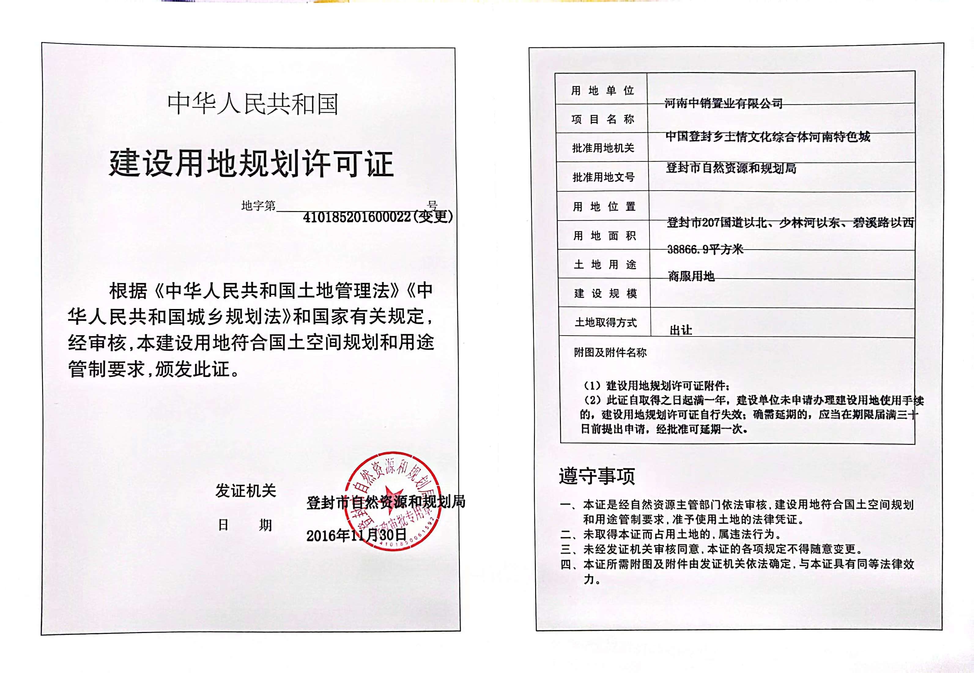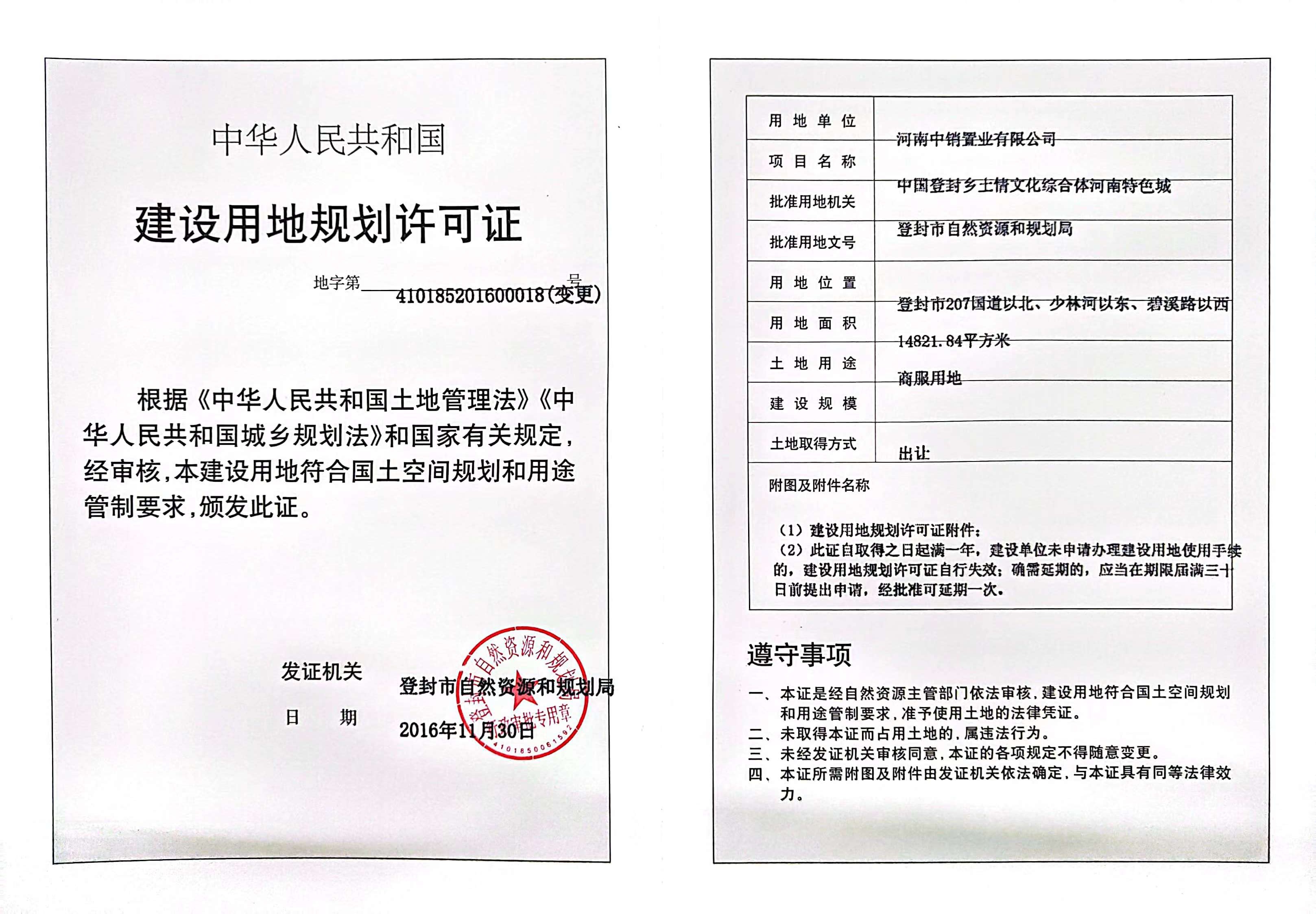 登封市自然资源和规划局关于中国登封乡土情文化综合体河南特色城建设用地规划许可证证后公告