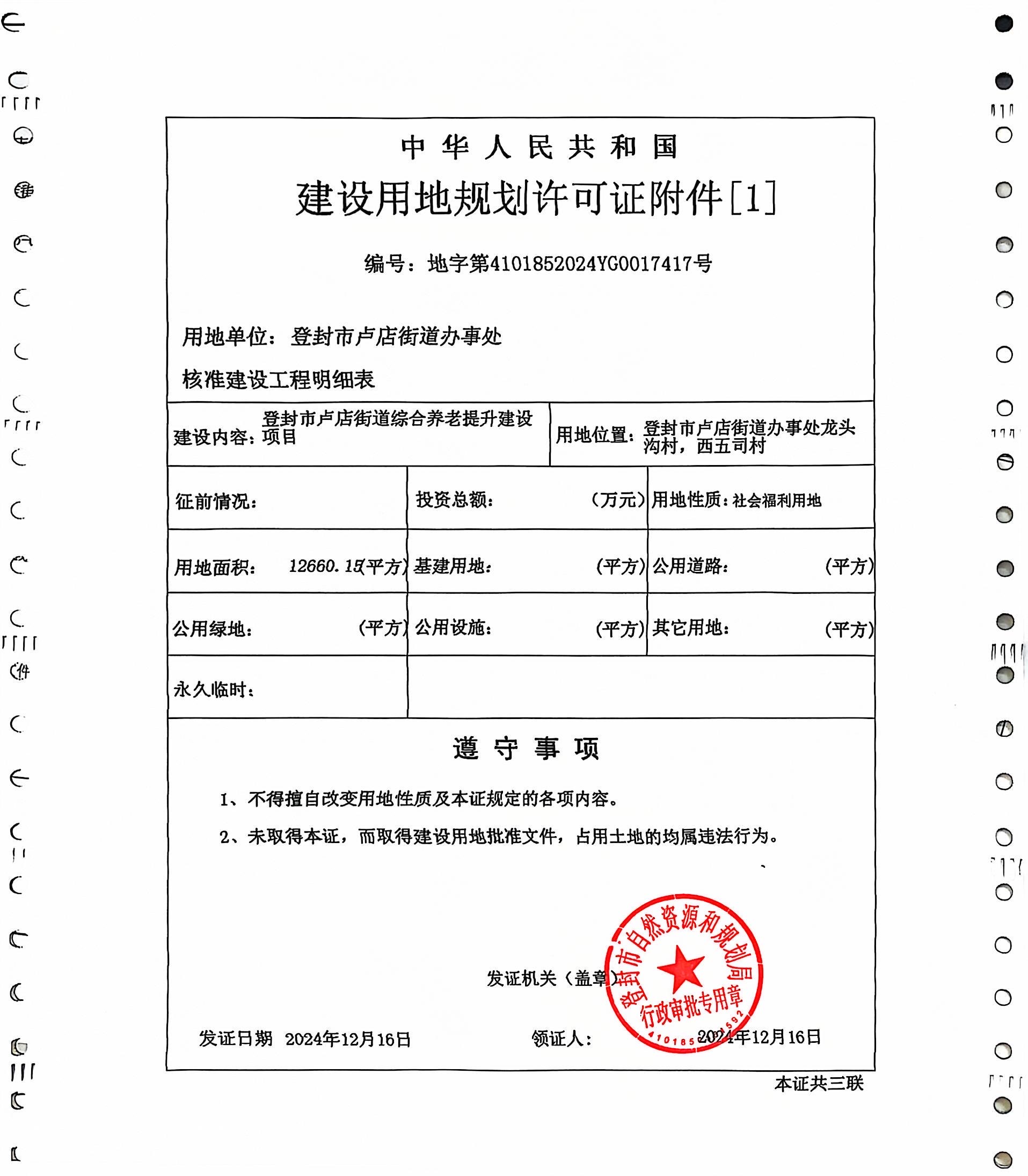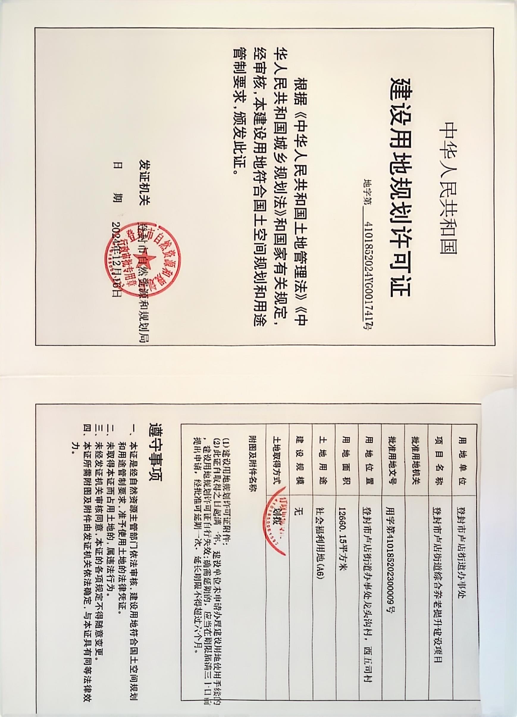 登封市自然资源和规划局关于登封市卢店街道综合养老提升建设项目建设用地规划许可证变更证后公告