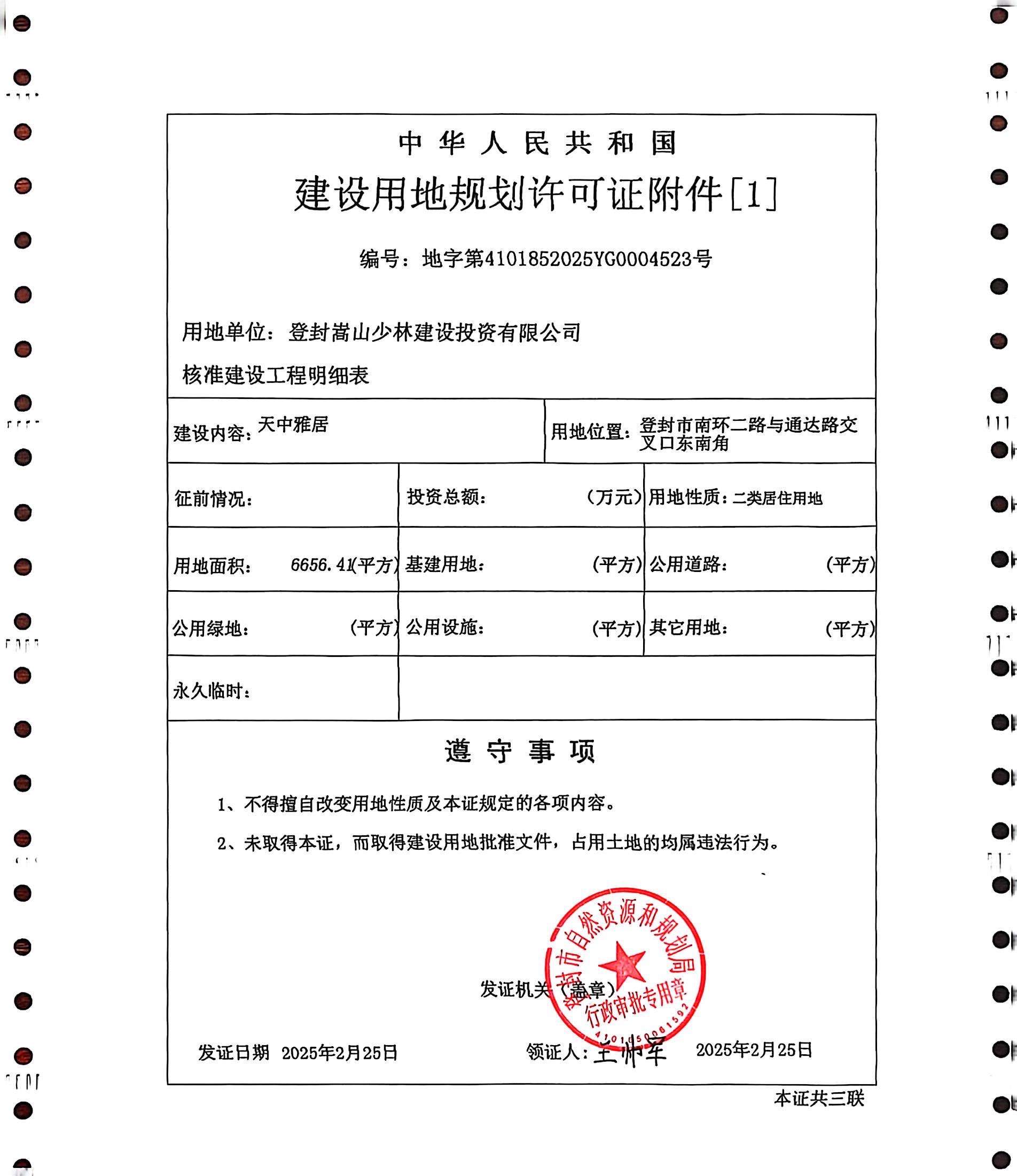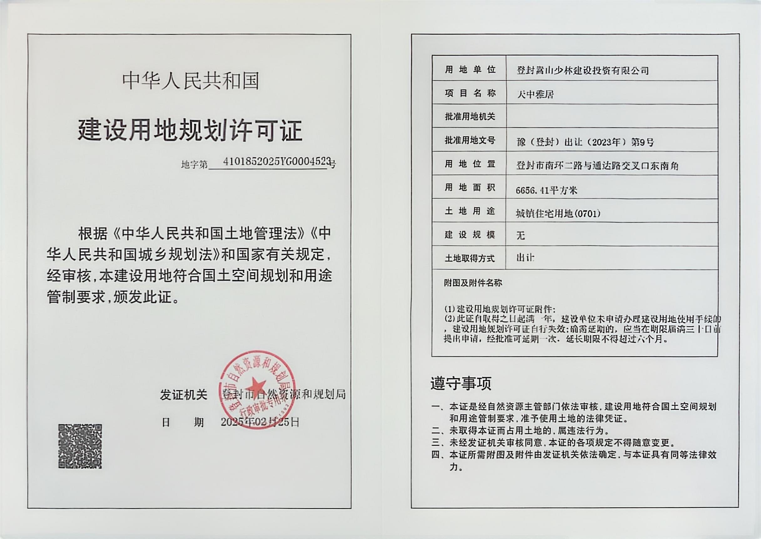 登封市自然资源和规划局关于天中雅居建设用地规划许可证证后公告