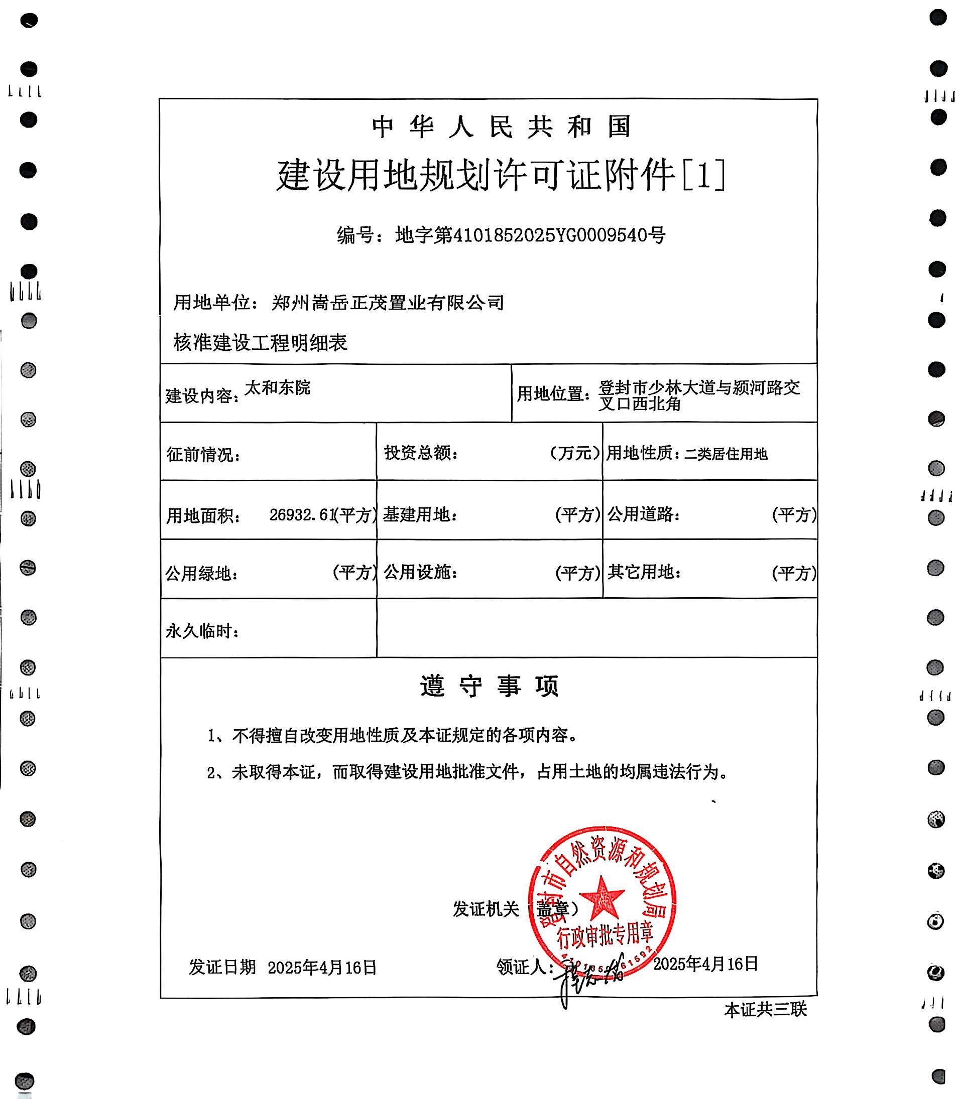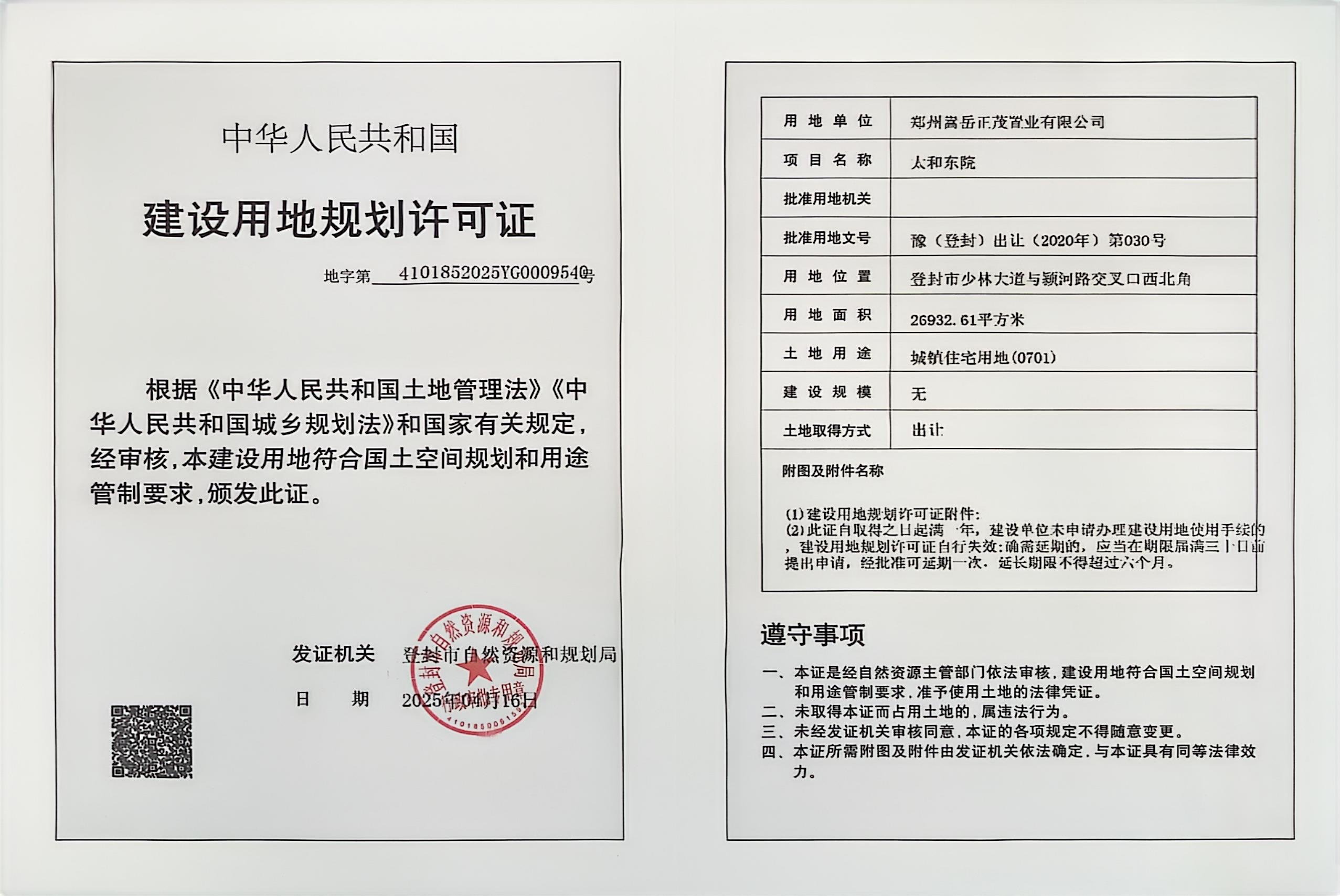 登封市自然资源和规划局关于太和东院建设用地规划许可证证后公告