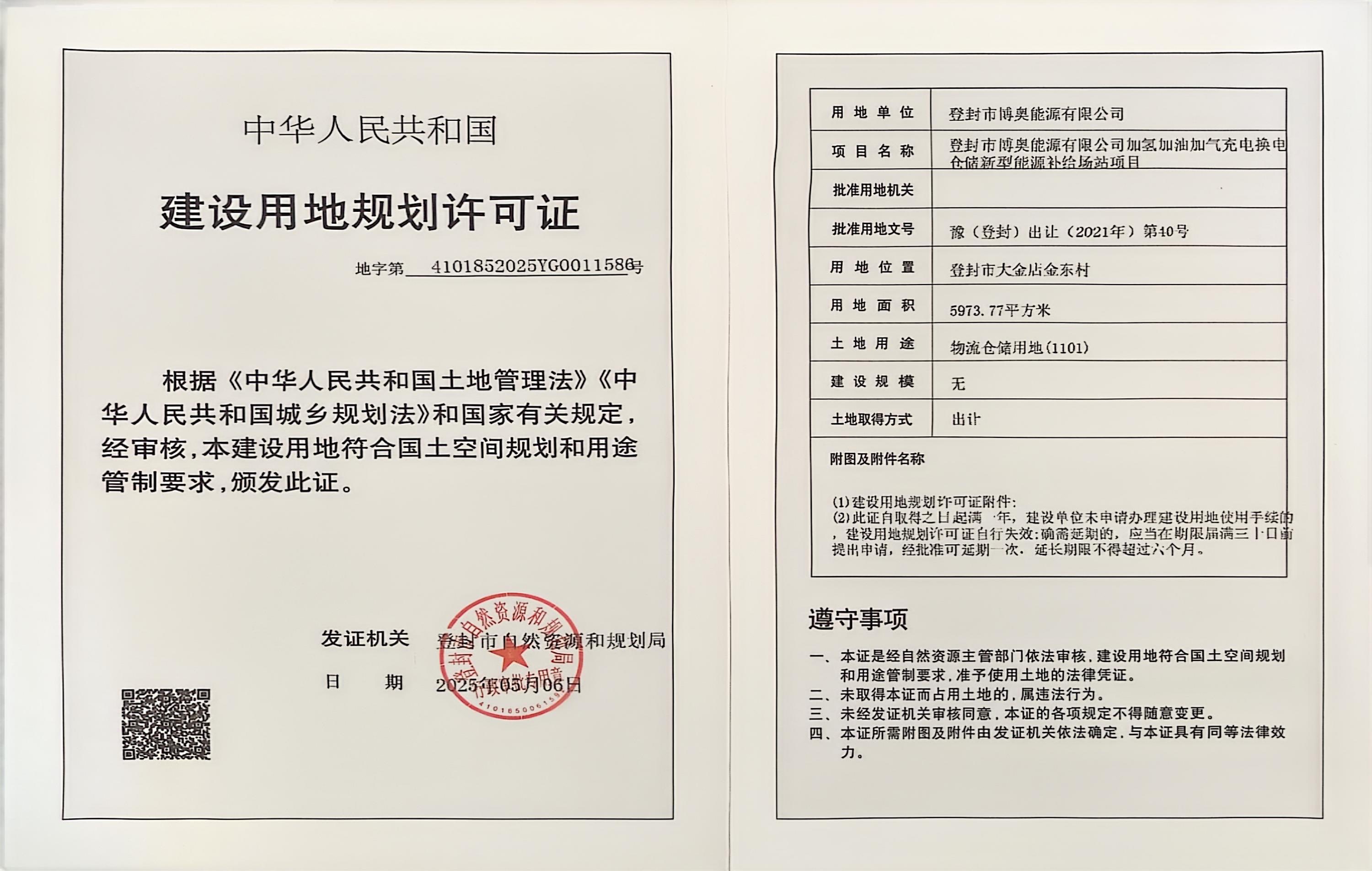 登封市自然资源和规划局关于登封市博奥能源有限公司加氢加油加气充电换电仓储新型能源补给场站项目建设用地规划许可证证后公告