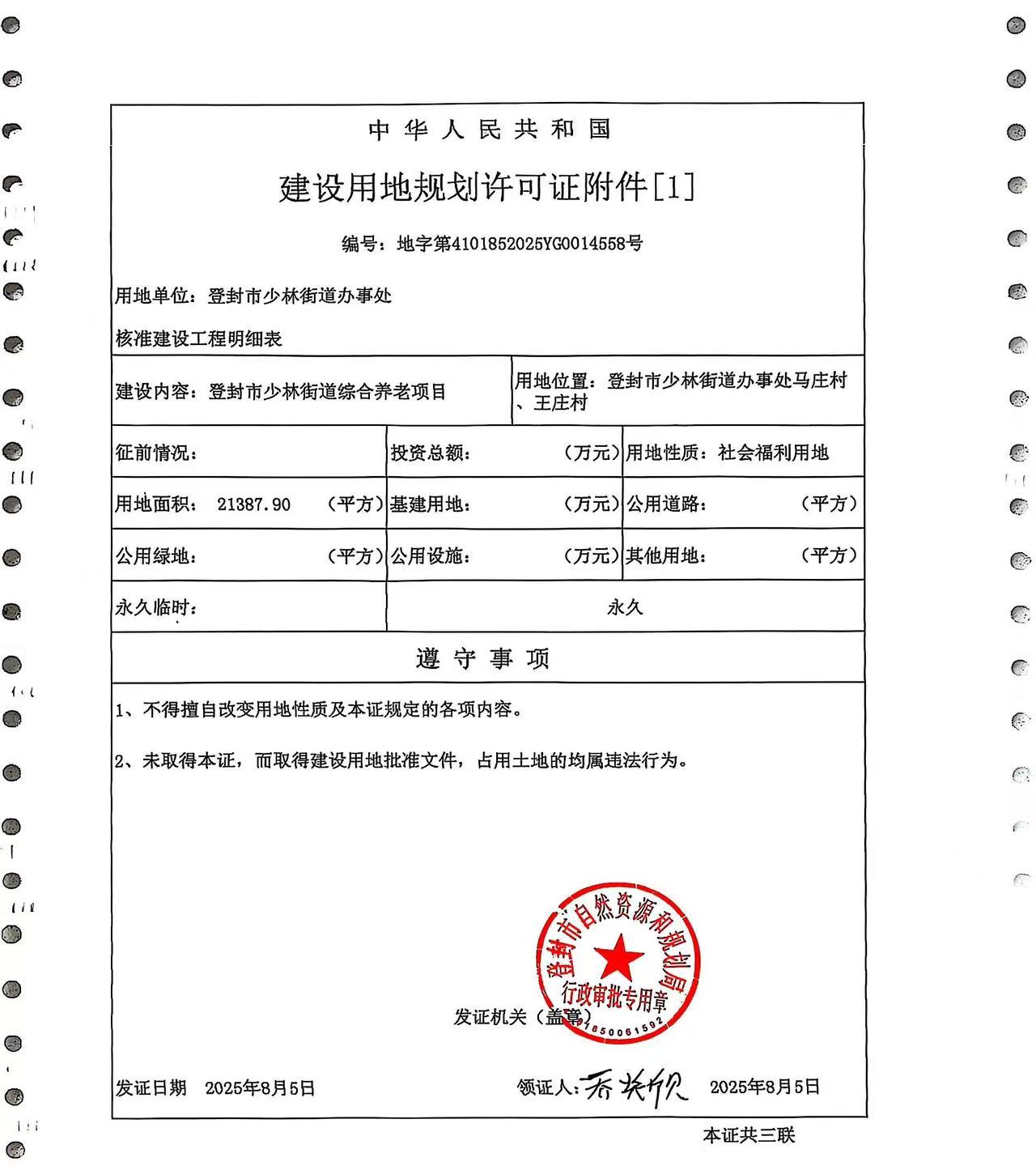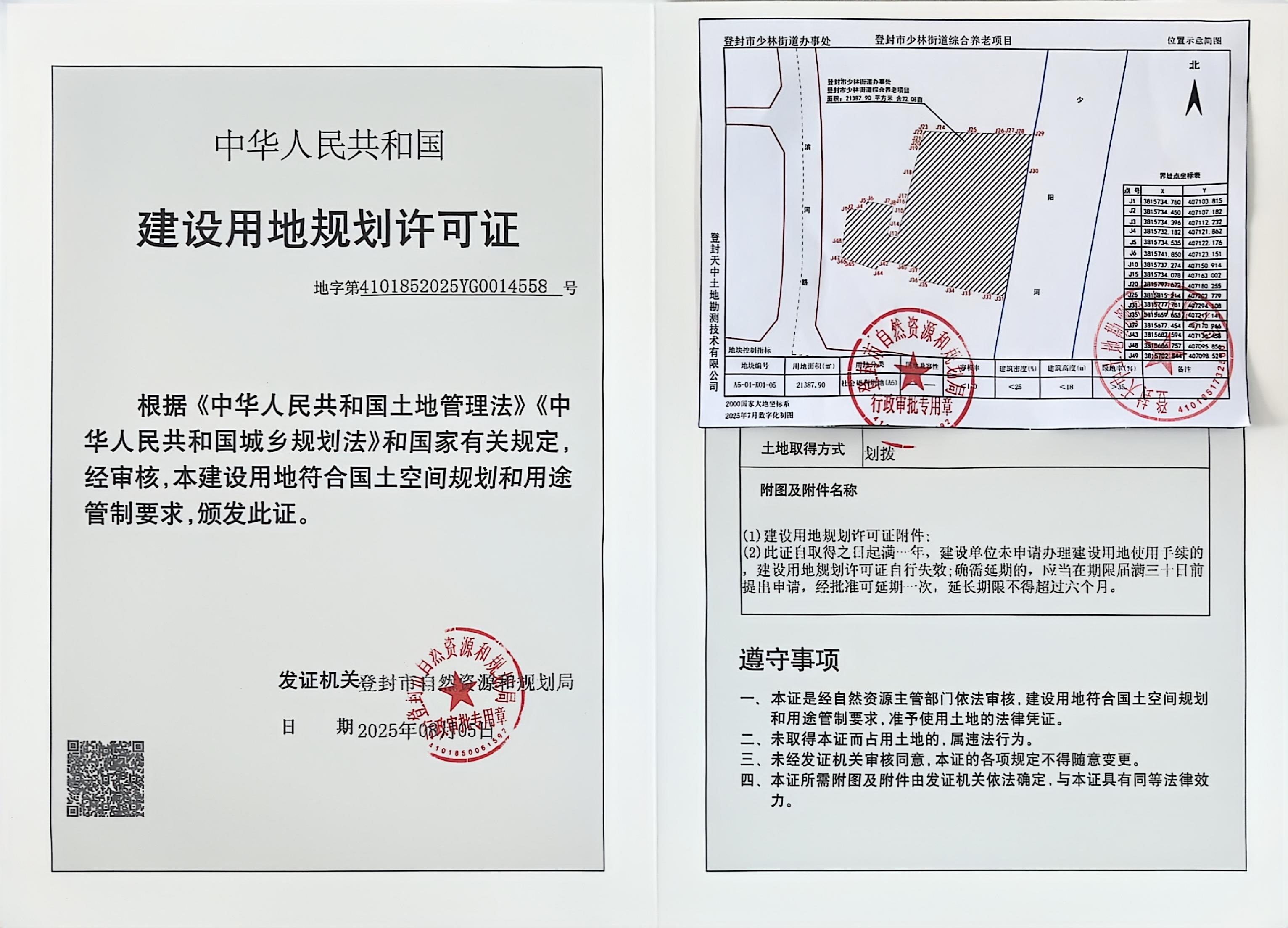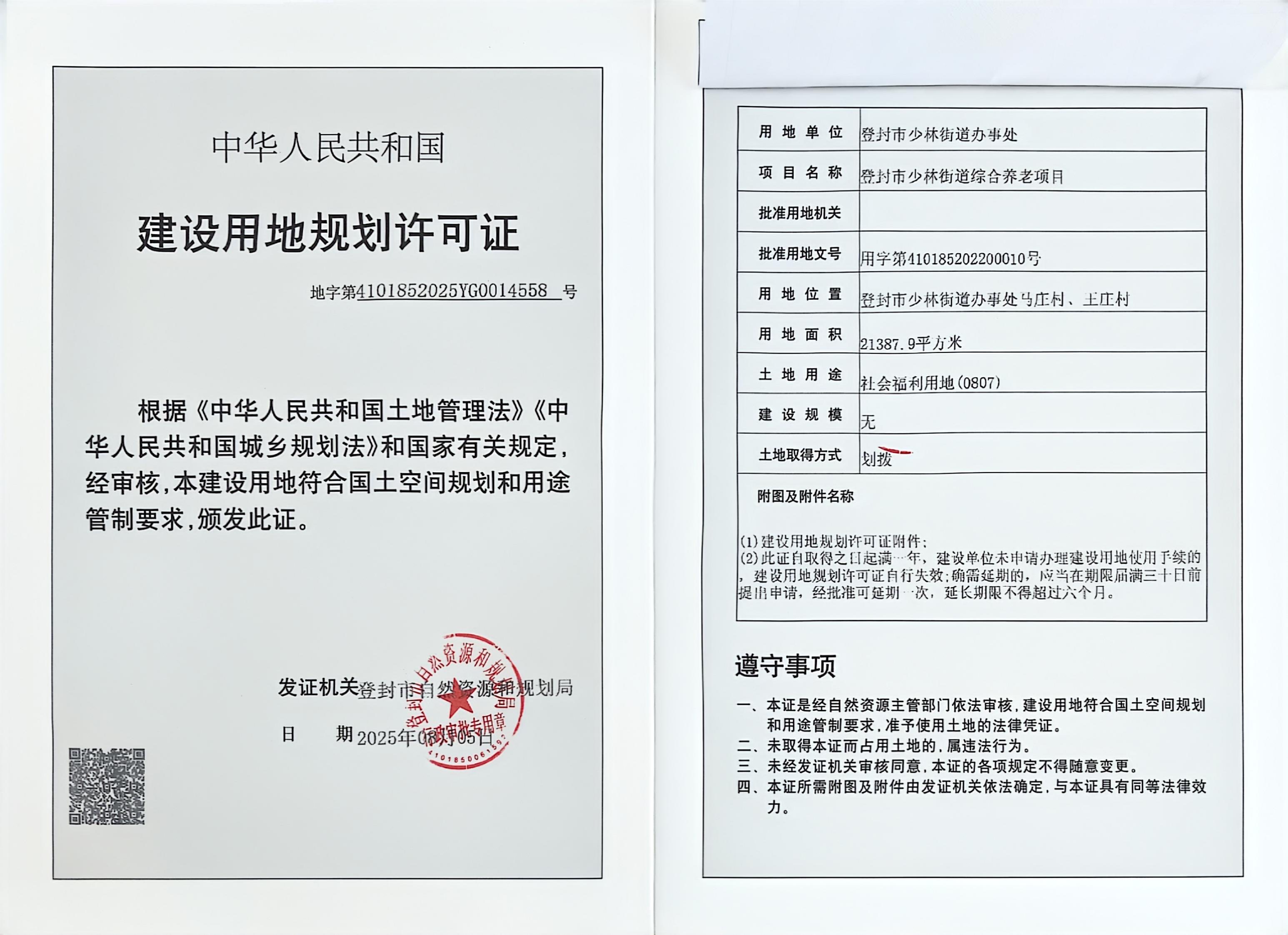 登封市自然资源和规划局关于登封市少林街道综合养老项目建设用地规划许可证证后公告