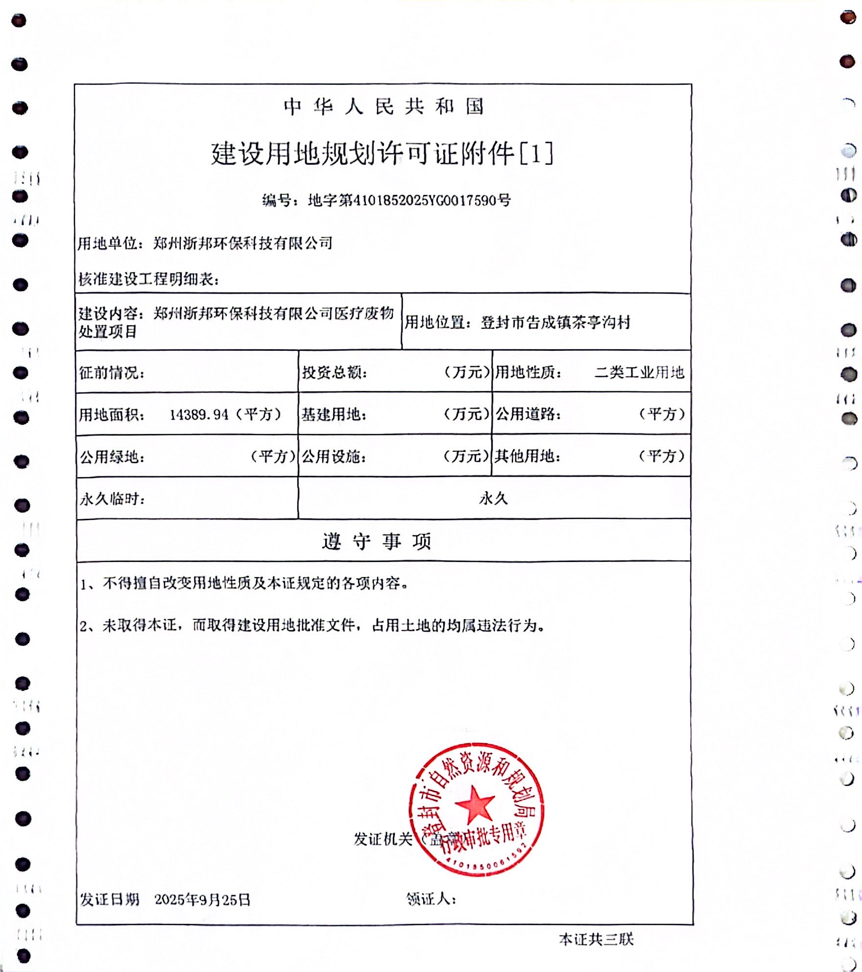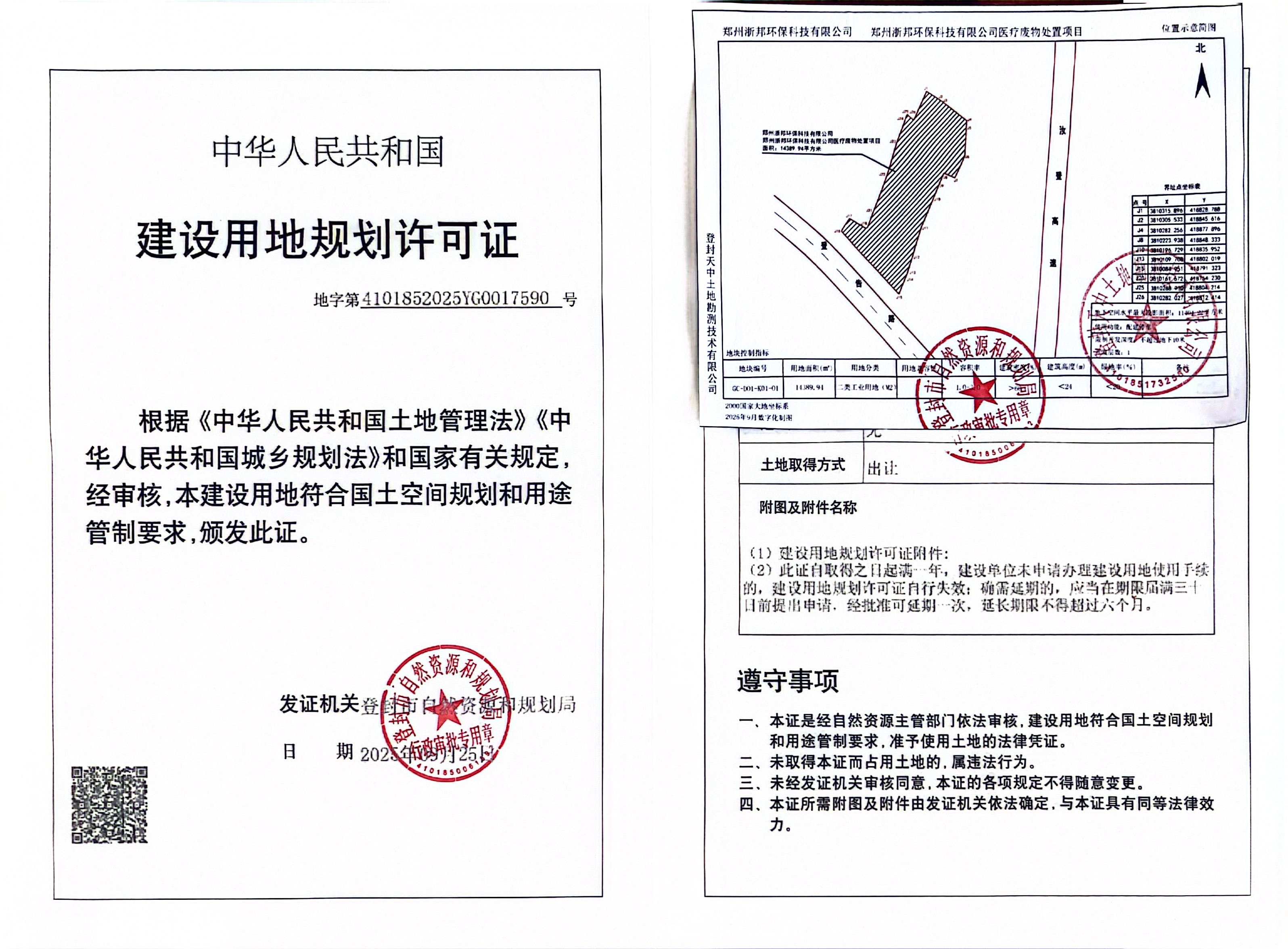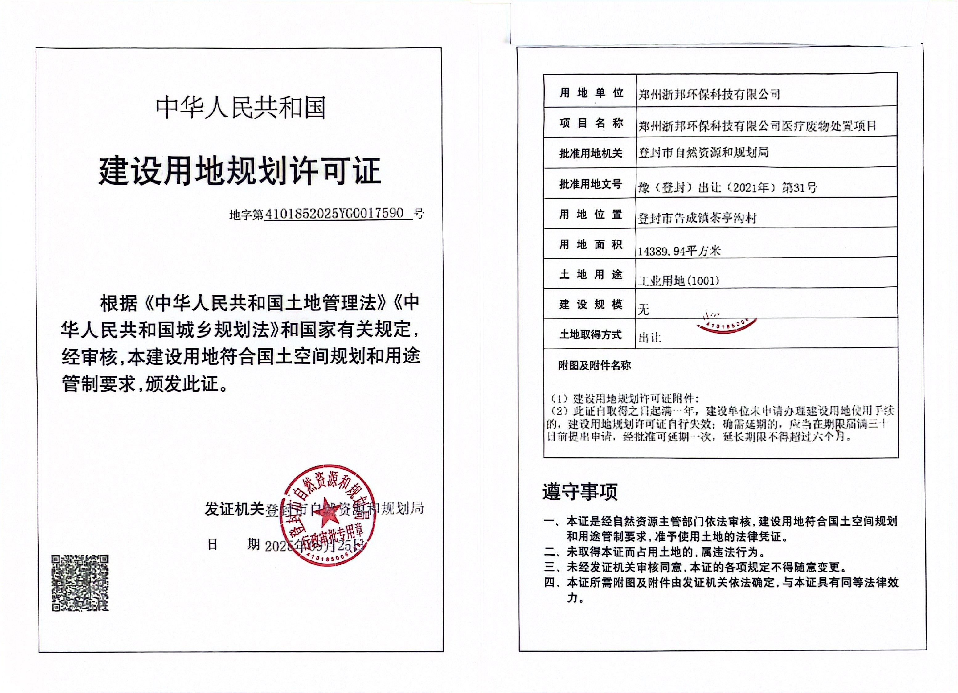 登封市自然资源和规划局关于郑州浙邦环保科技有限公司医疗废物处置项目建设用地规划许可证证后公告