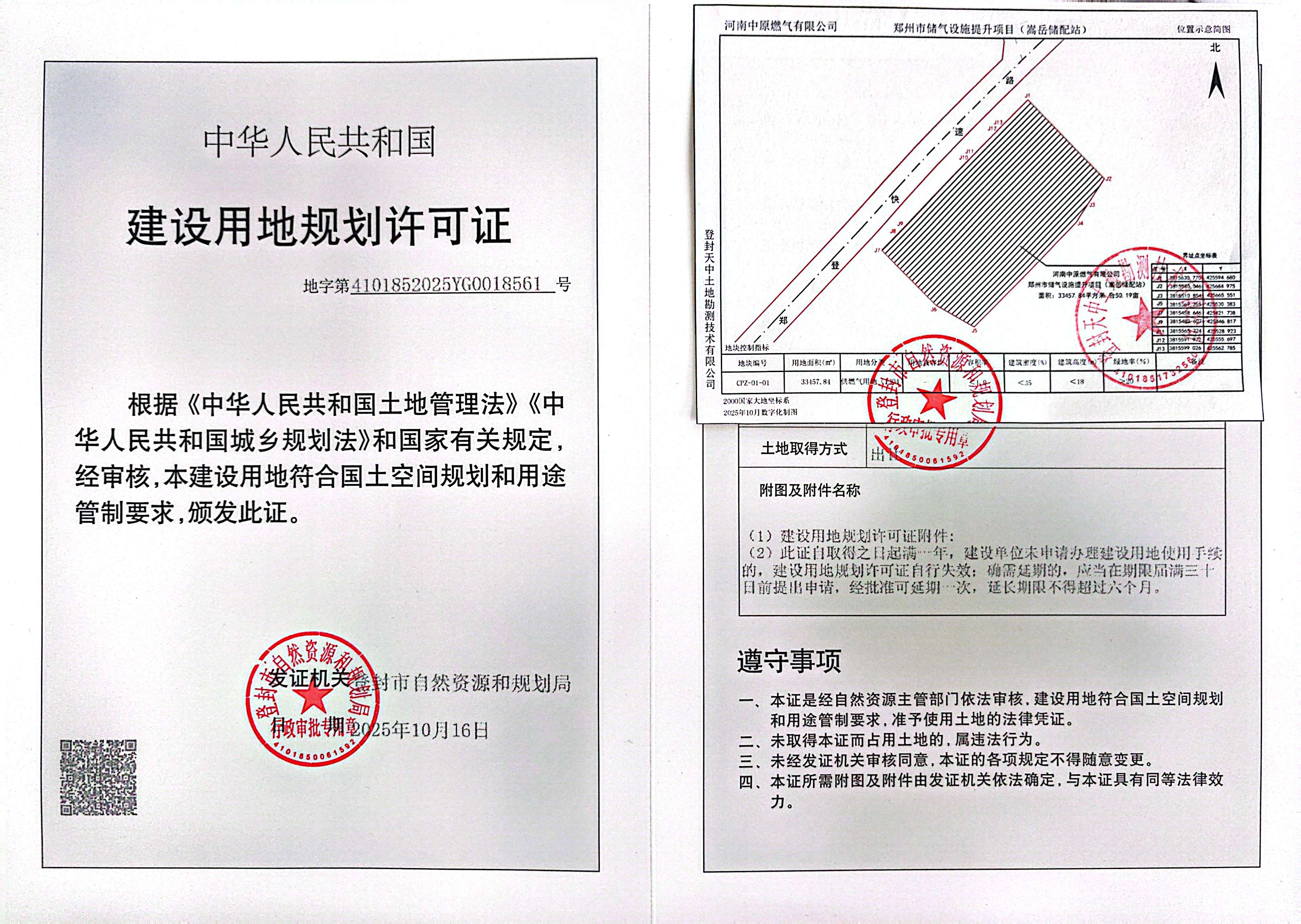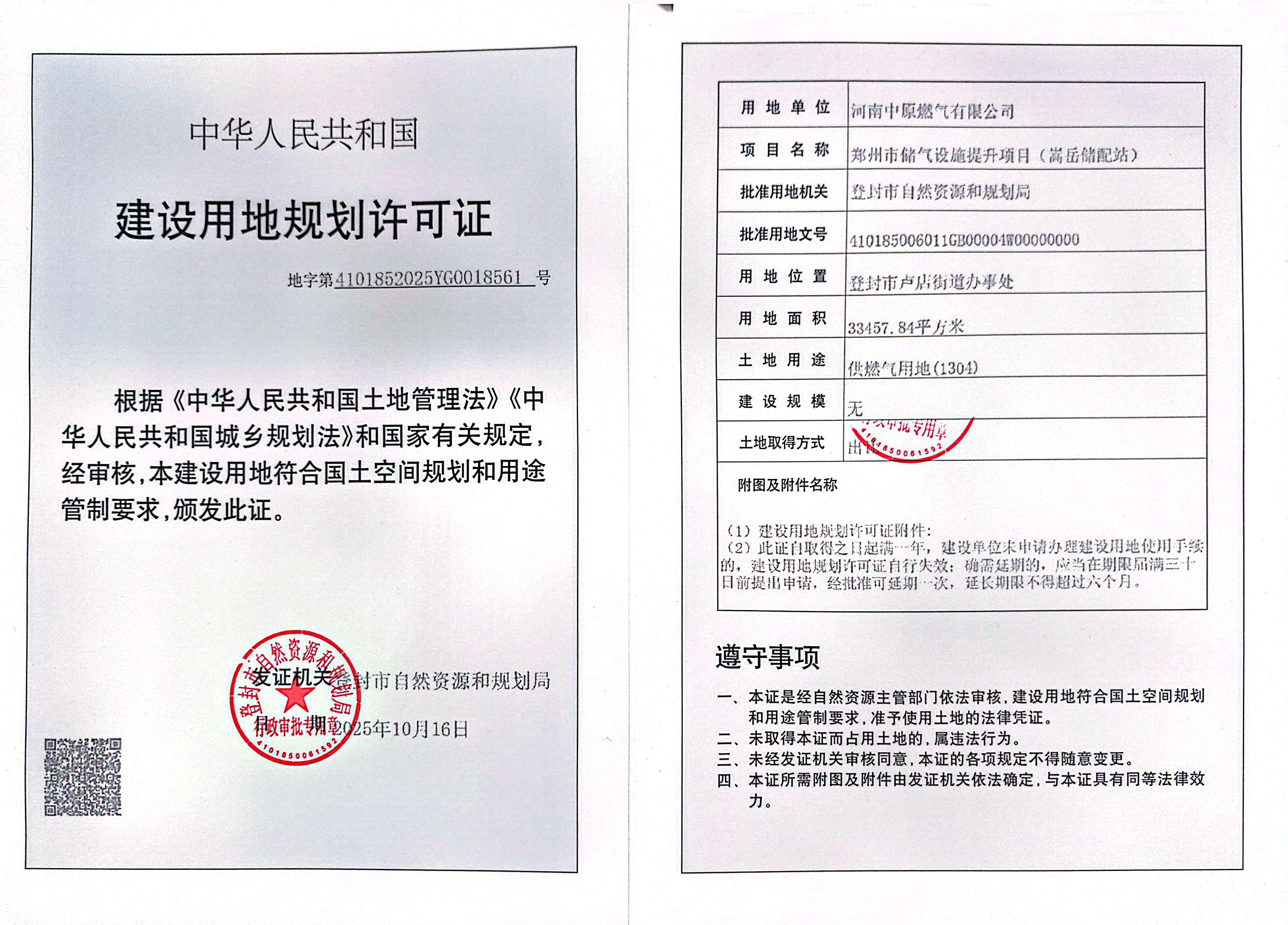 登封市自然资源和规划局关于郑州市储气设施提升项目(嵩岳储配站)建设用地规划许可证证后公告
