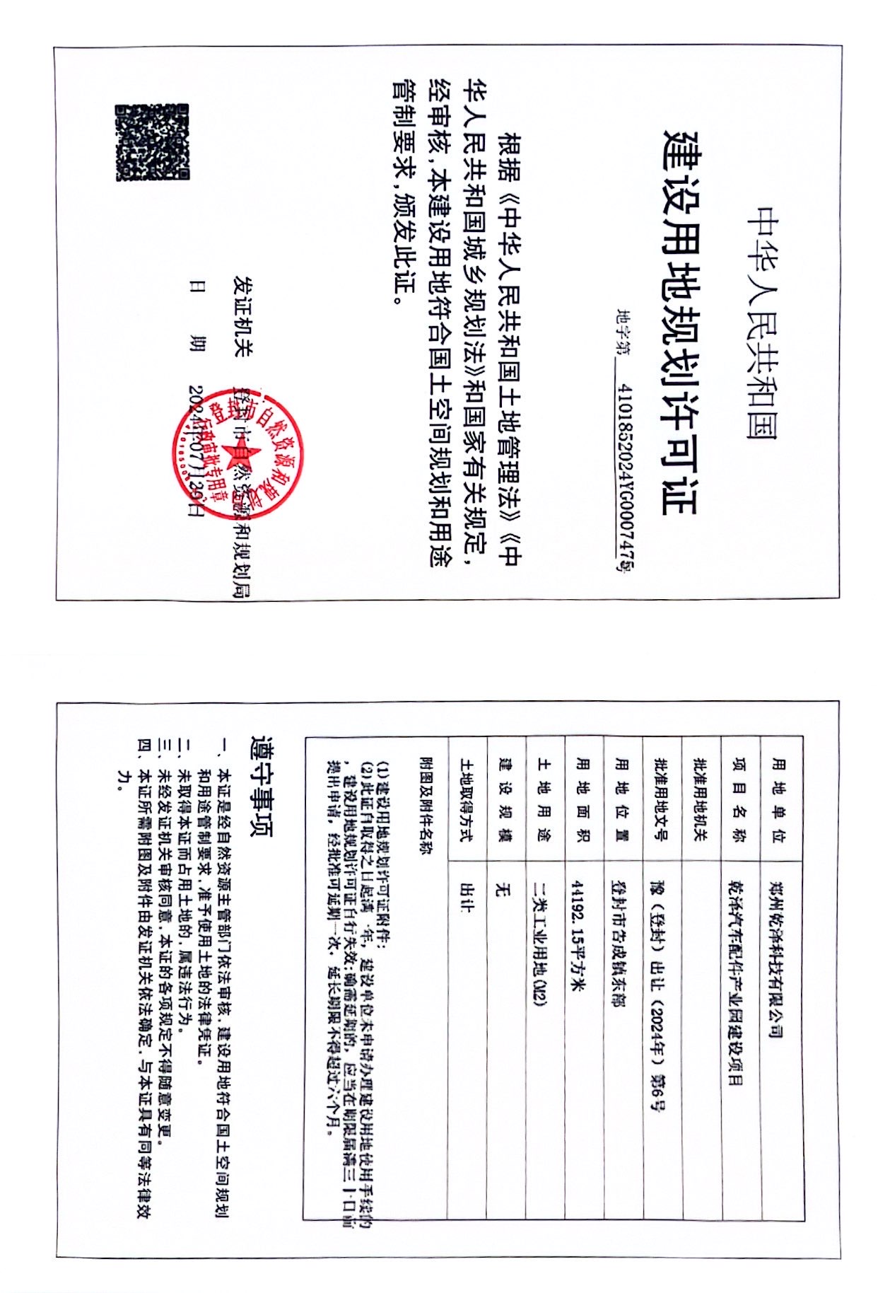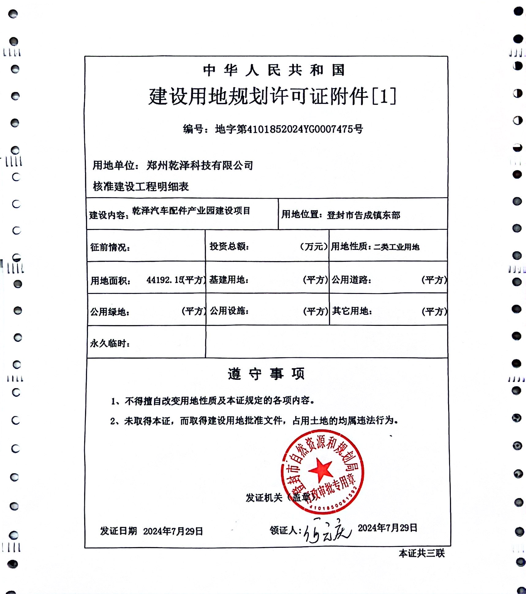 登封市自然资源和规划局关于乾泽汽车配件产业园建设项目建设用地规划许可证证后公告