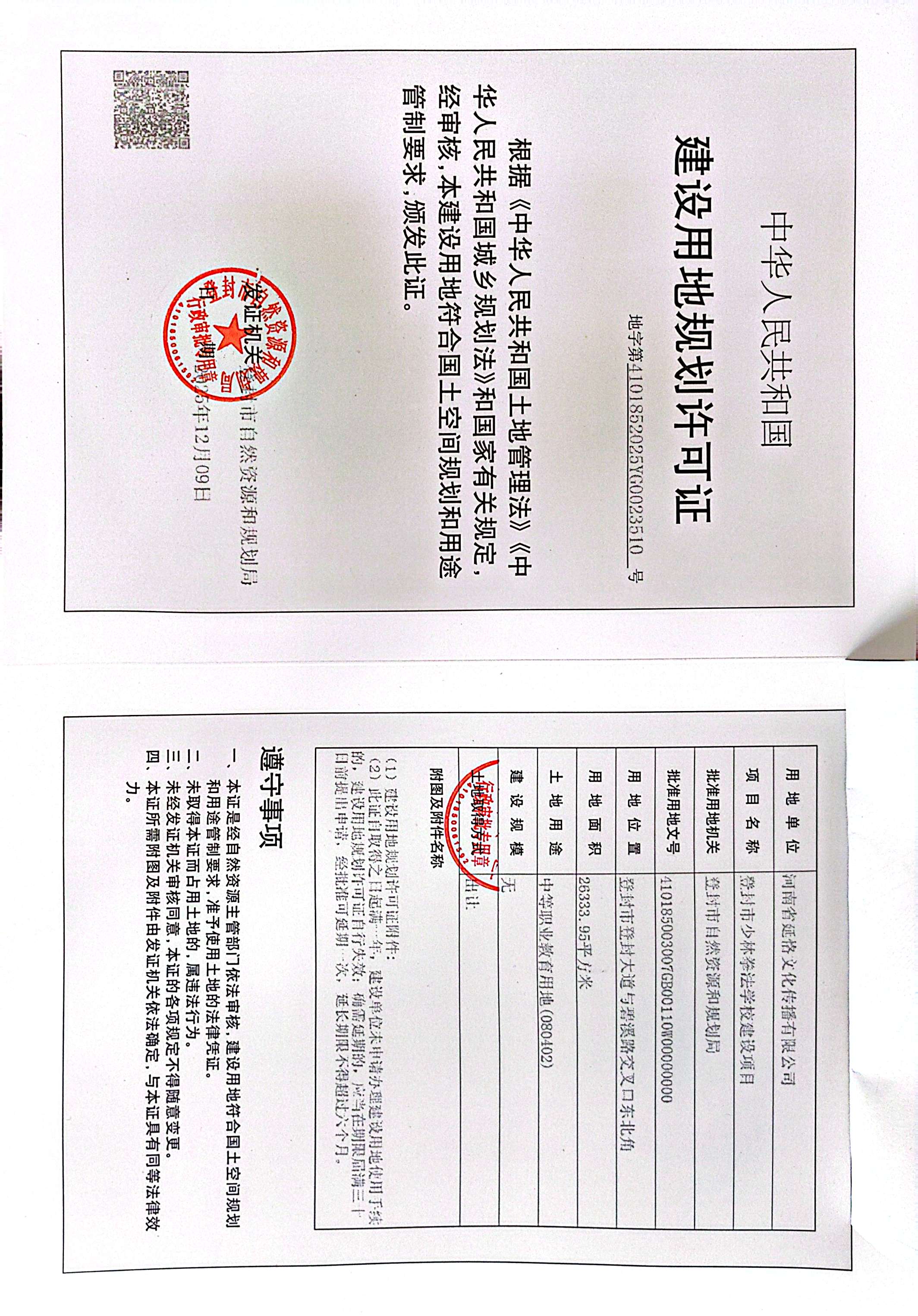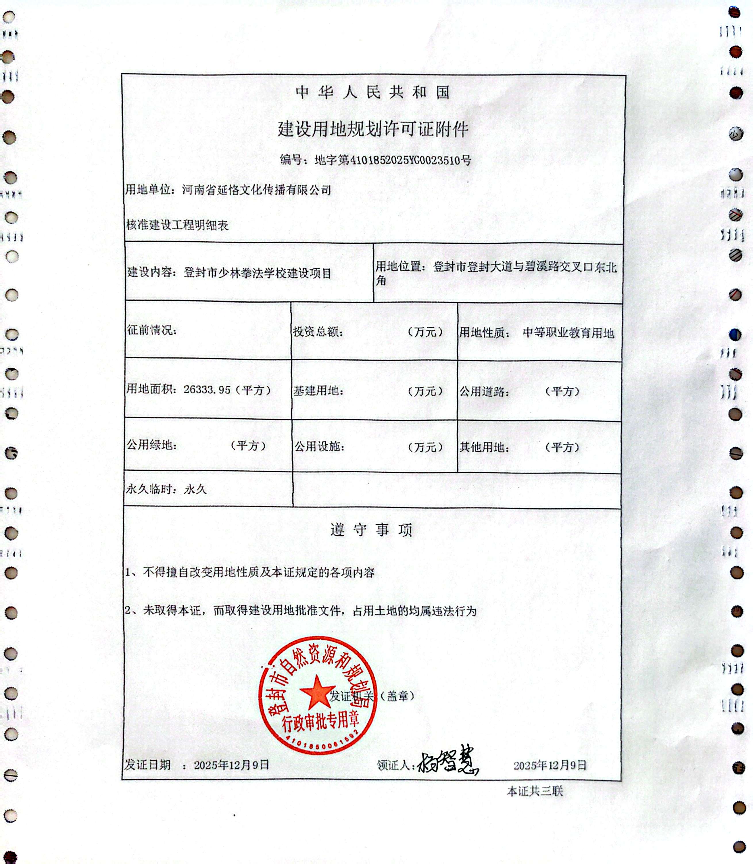 登封市自然资源和规划局关于登封市少林拳法学校建设项目建设用地规划许可证证后公告